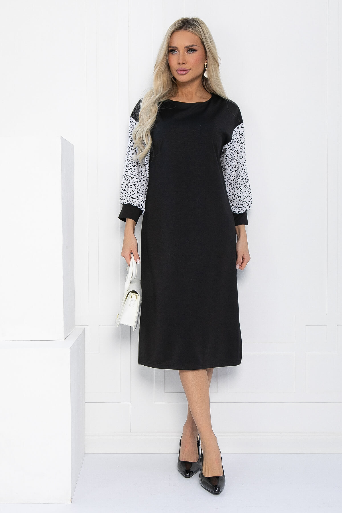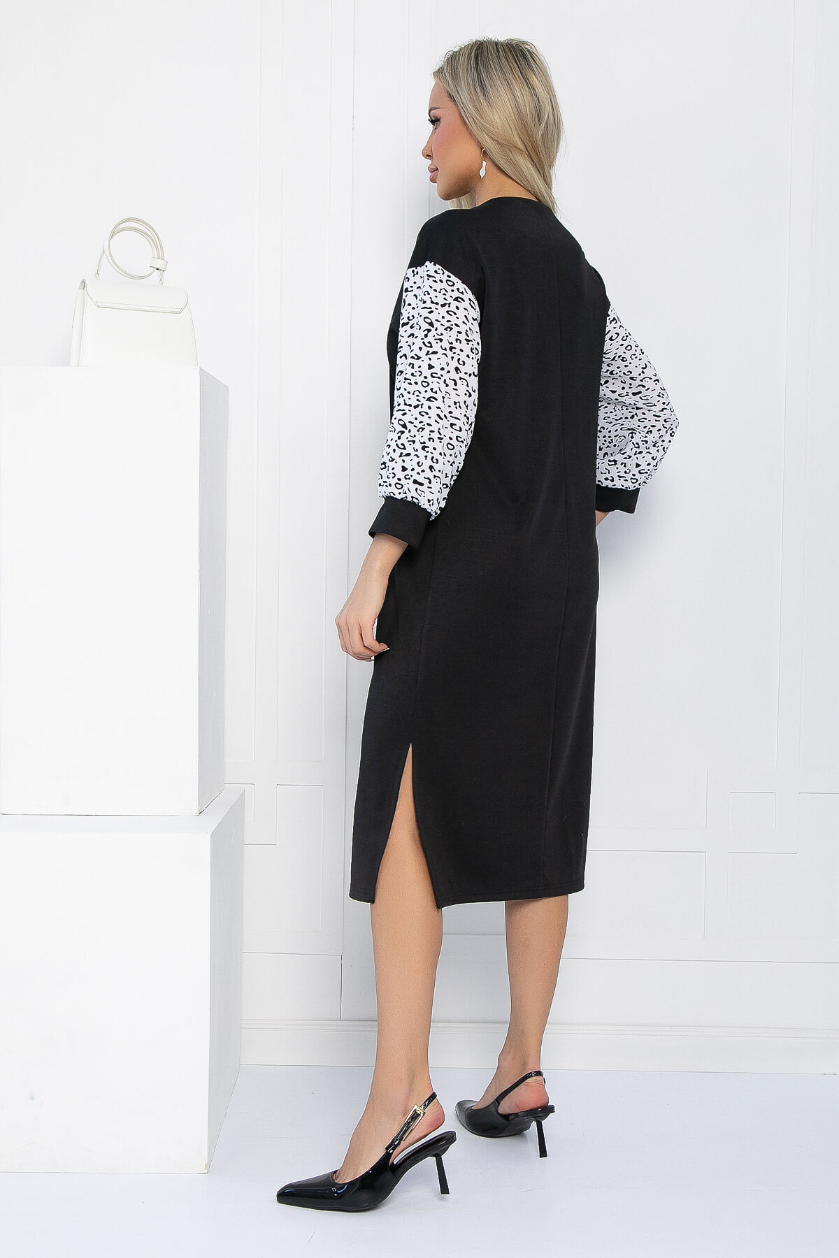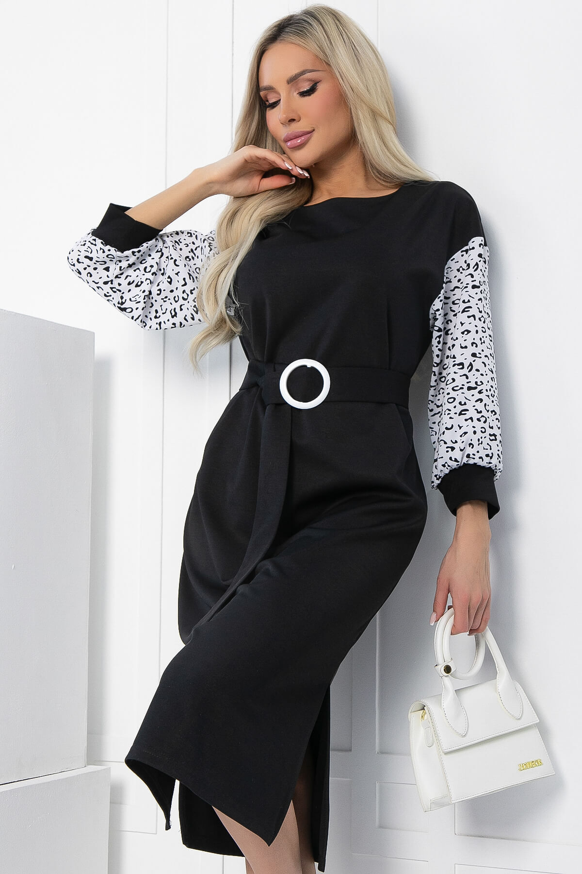 Платье средней длины с разрезами по бокам идеально подойдет для создания элегантного и утонченного образа. Округлый вырез и приспущенные плечи придают модели лёгкость и элегантность. Рукав длиной 3/4 заканчивается манжетой из основной ткани, создавая гармоничный образ. Платье выполнено в классическом чёрно-белом цвете, что делает его универсальным для любого случая. Особое внимание привлекает белая пряжка на поясе, которая добавляет изюминку и подчёркивает талию. Благодаря прямому крою, это платье стройнит и подходит для любого типа фигуры, обеспечивая комфорт и уверенность в себе.