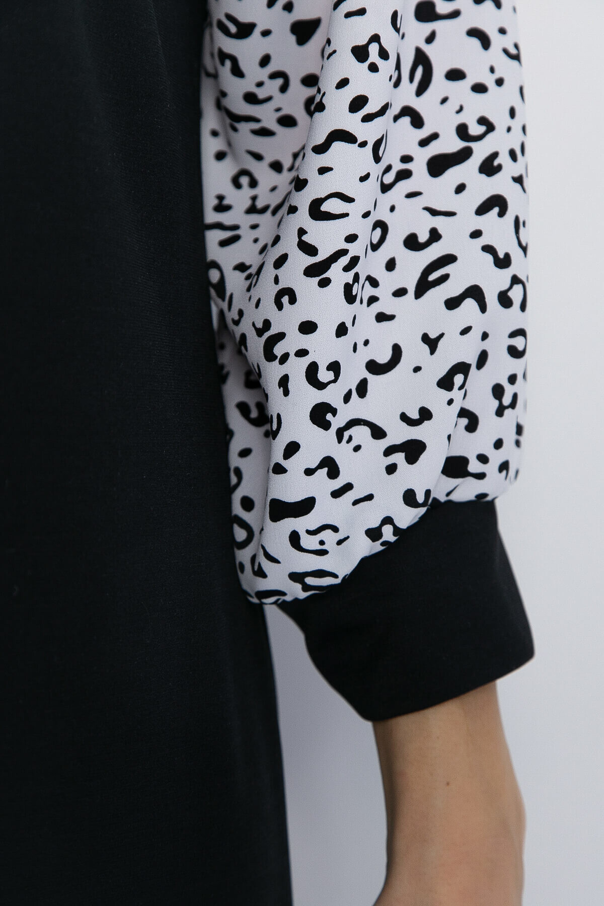 Принт: на рукаве - мелкие рваные круги черного цвета на белом фоне.