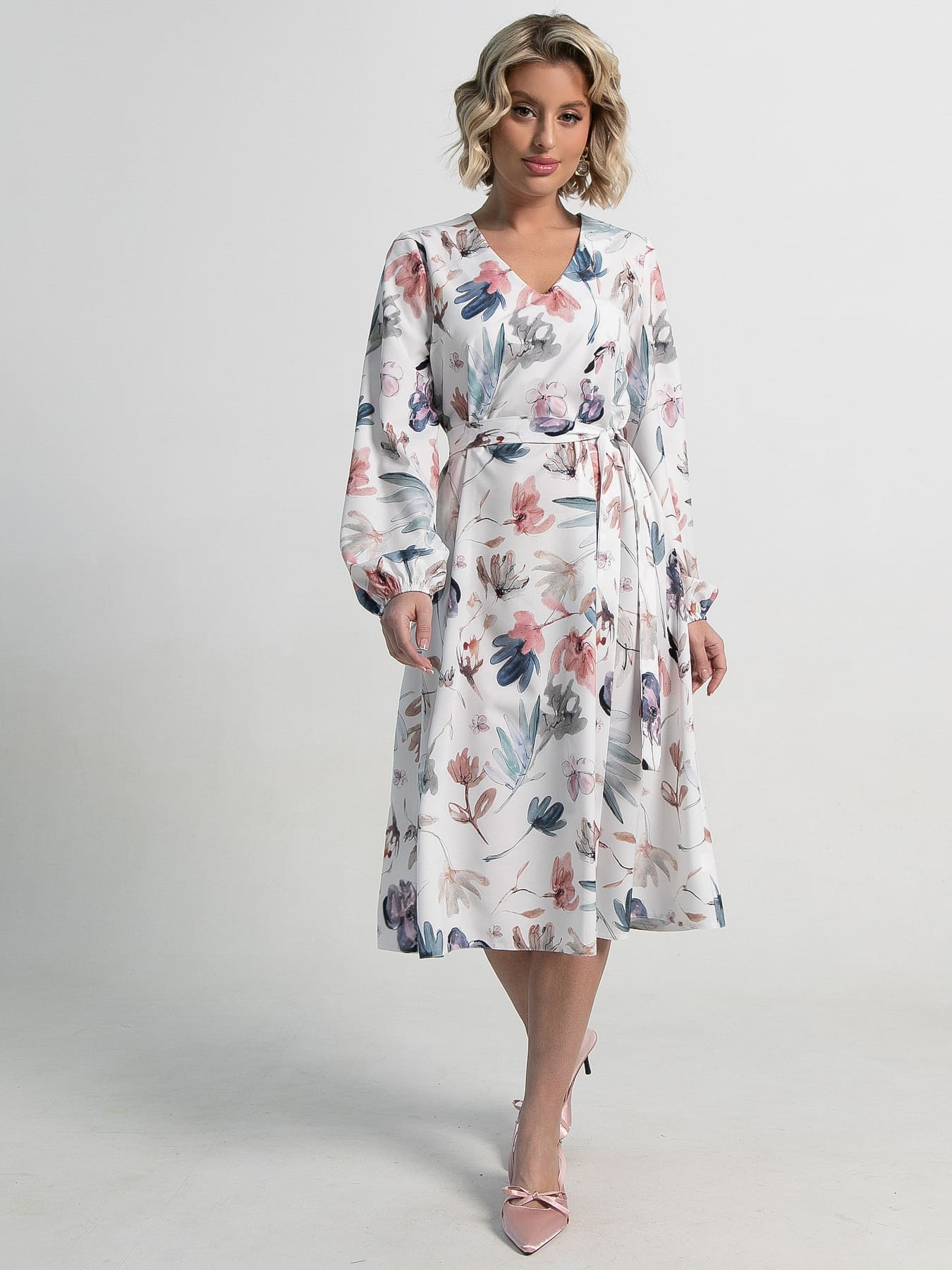 V-образным вырезом горловины красиво очертит зону декольте. Красивый пышный рукав на резинке. Пояс из основной ткани входит в комплект.