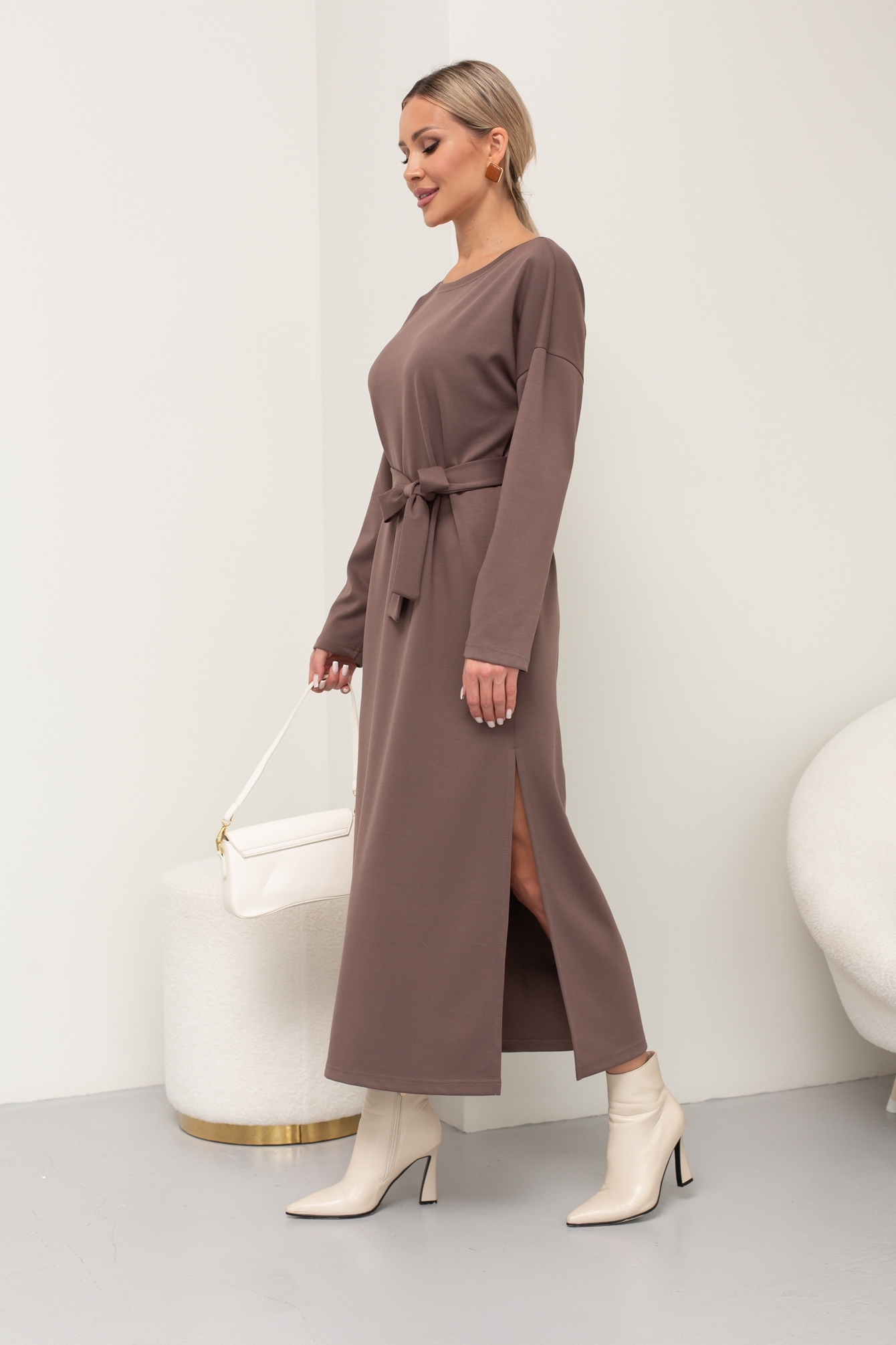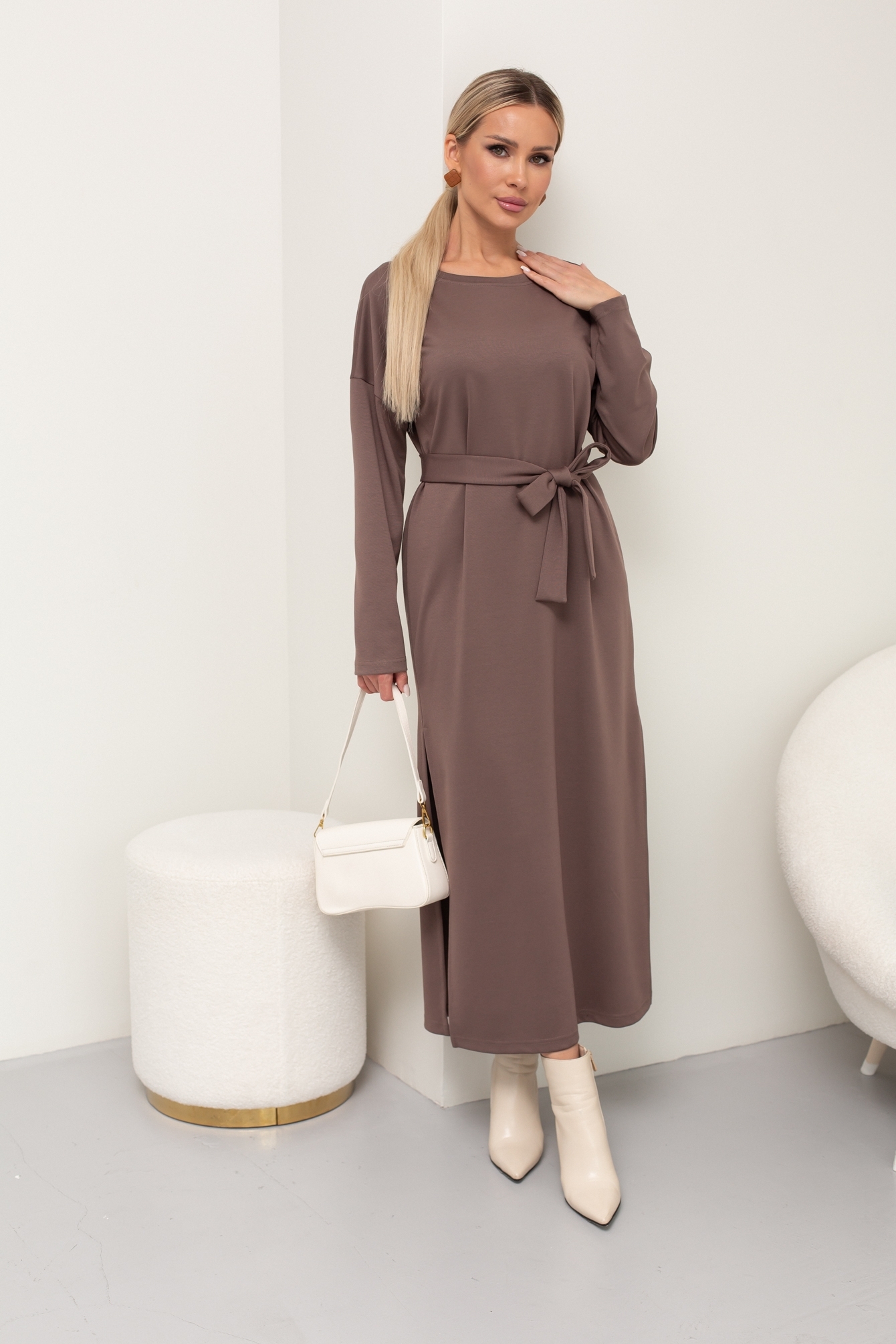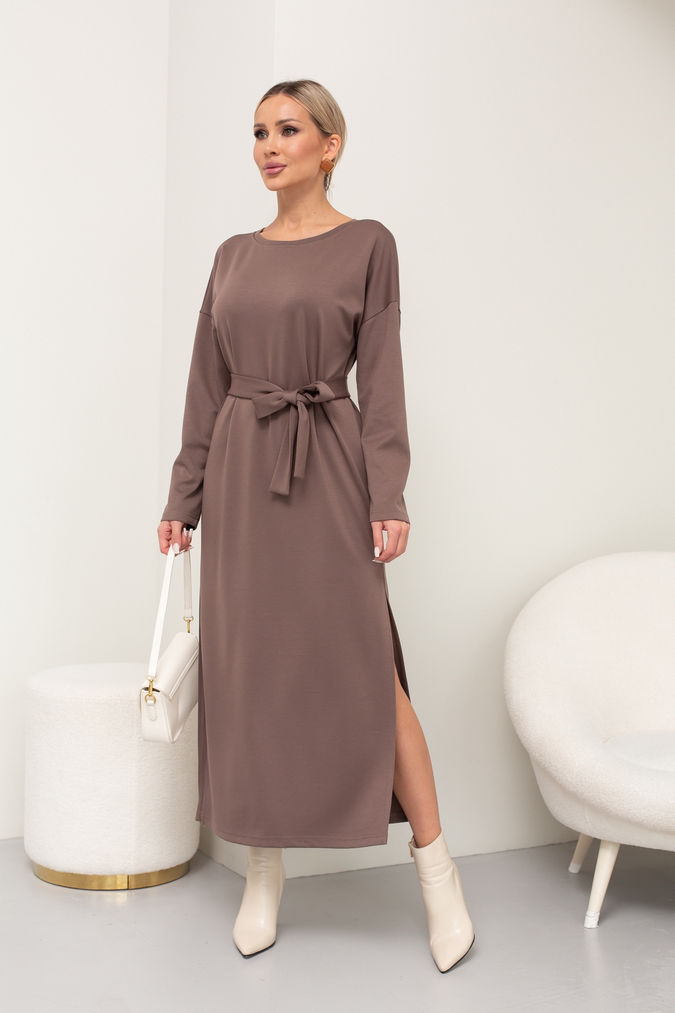 Удобное платье прямого кроя из однотонного трикотажного полотна. Длинный рукав со спущенным плечом. Округлая горловина на обтачке. Низ ровный, по бокам разрезы. Пояс из основной ткани в комплекте.