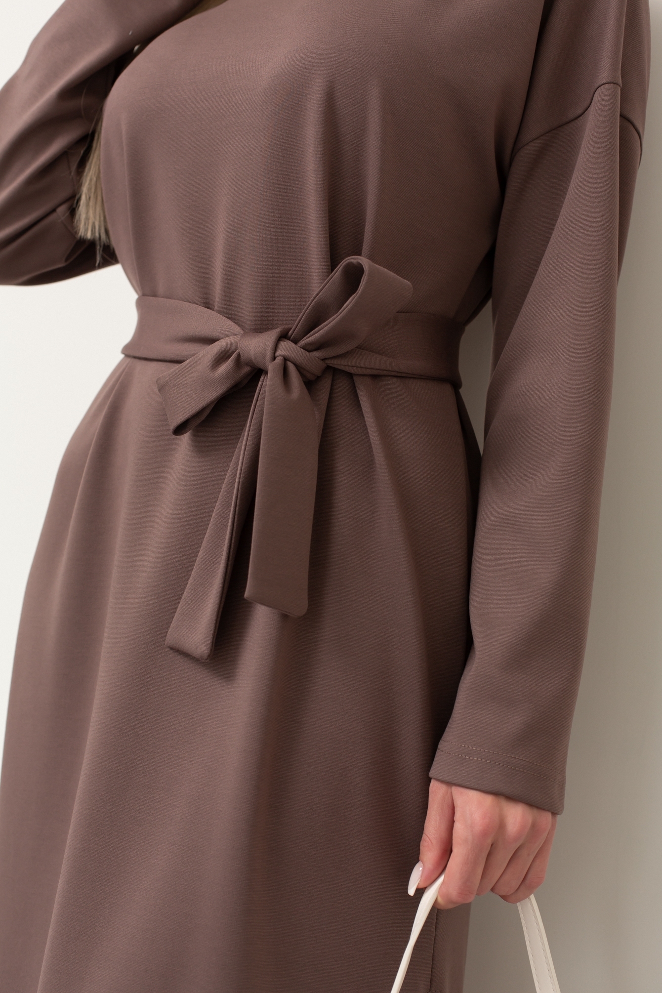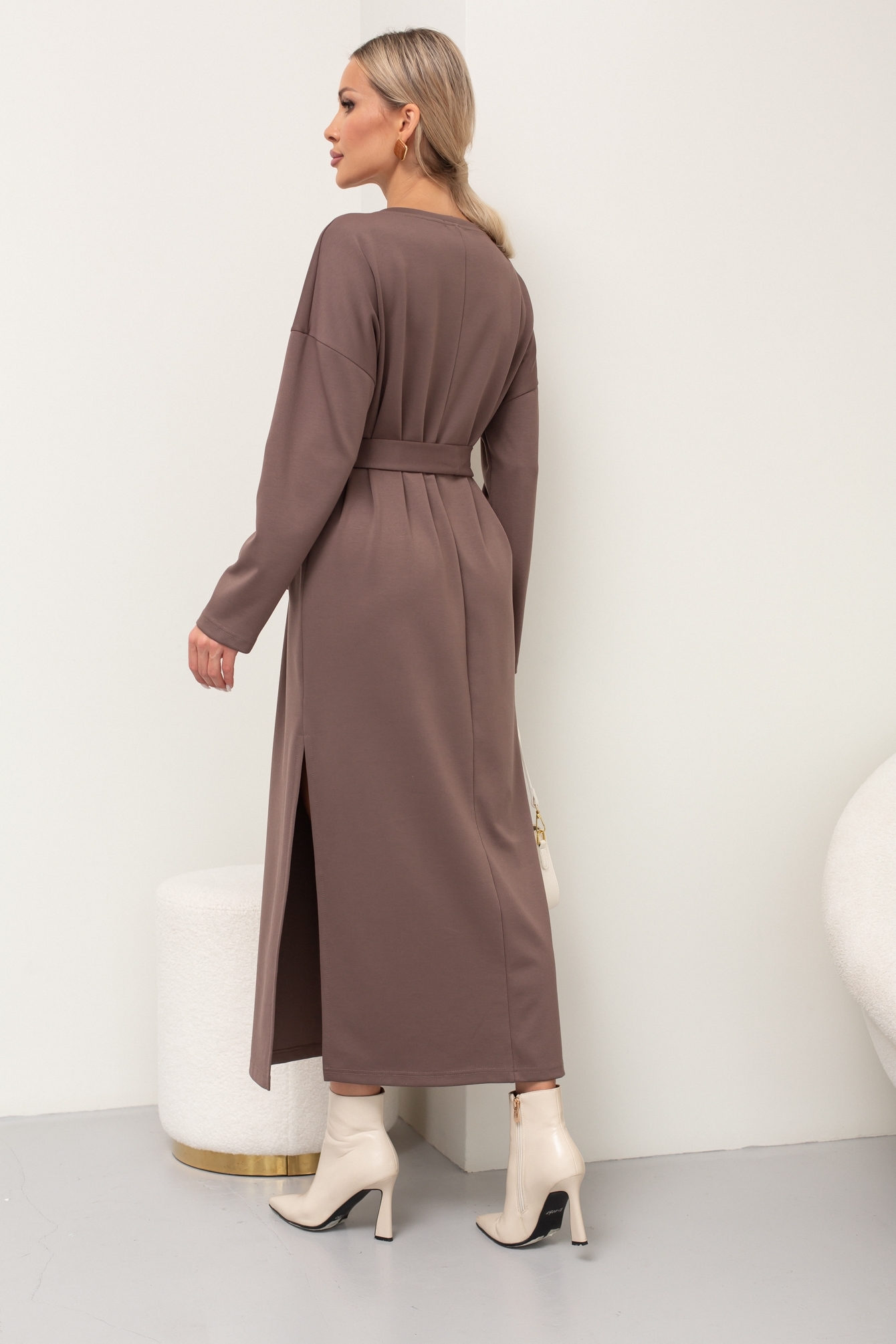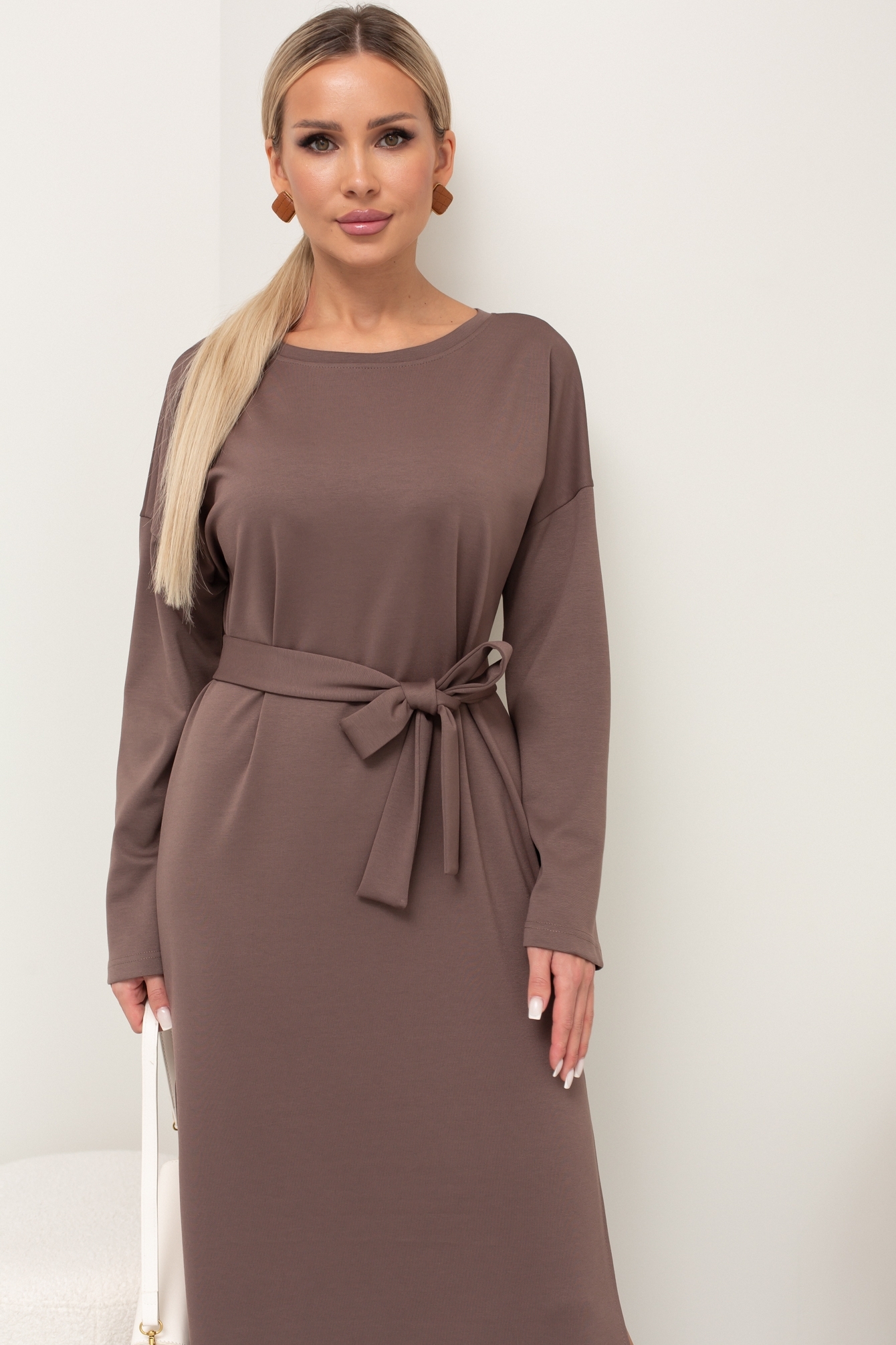 Удобное платье прямого кроя из однотонного трикотажного полотна. Длинный рукав со спущенным плечом. Округлая горловина на обтачке. Низ ровный, по бокам разрезы. Пояс из основной ткани в комплекте.