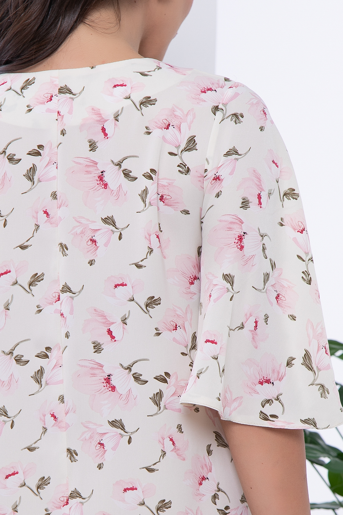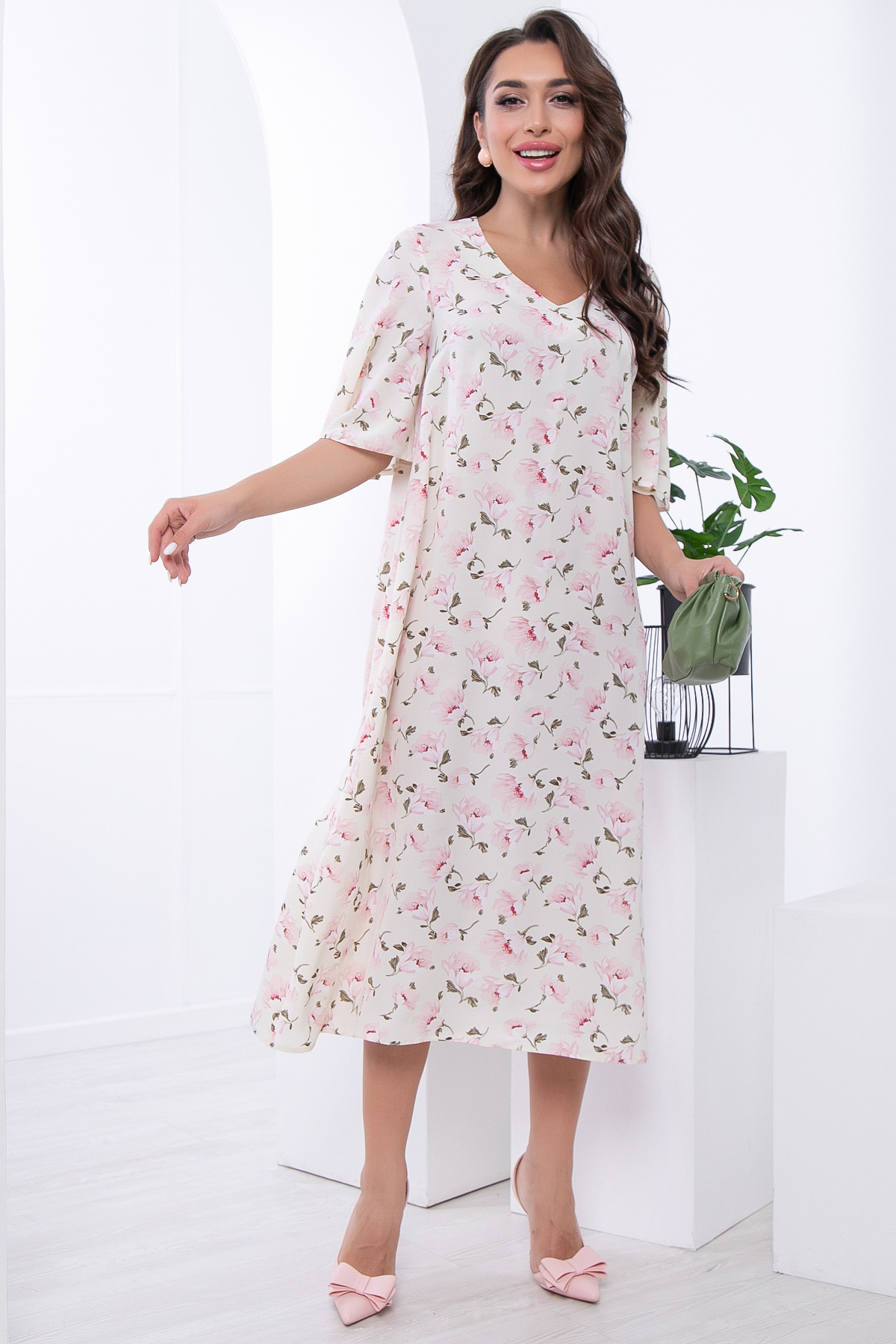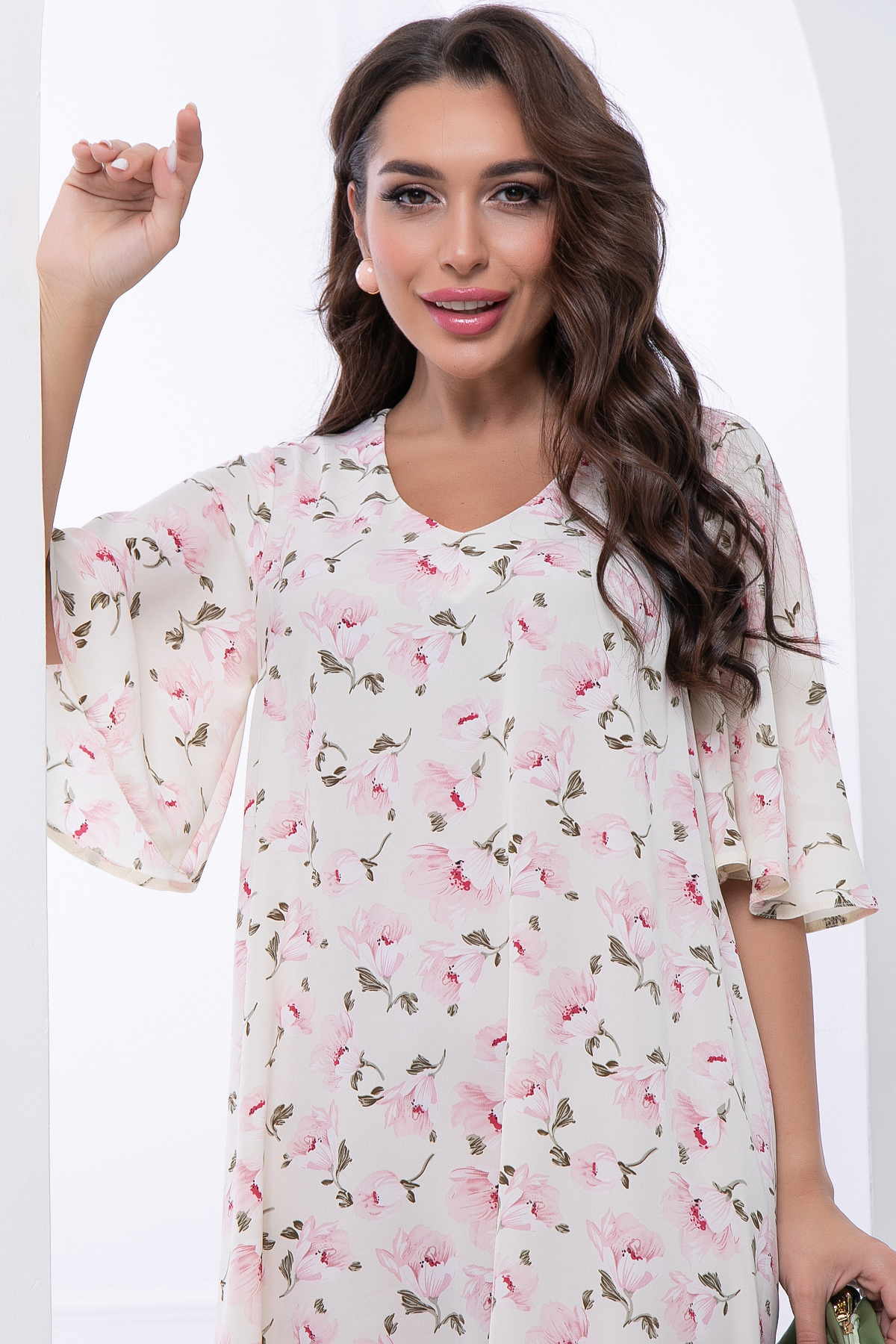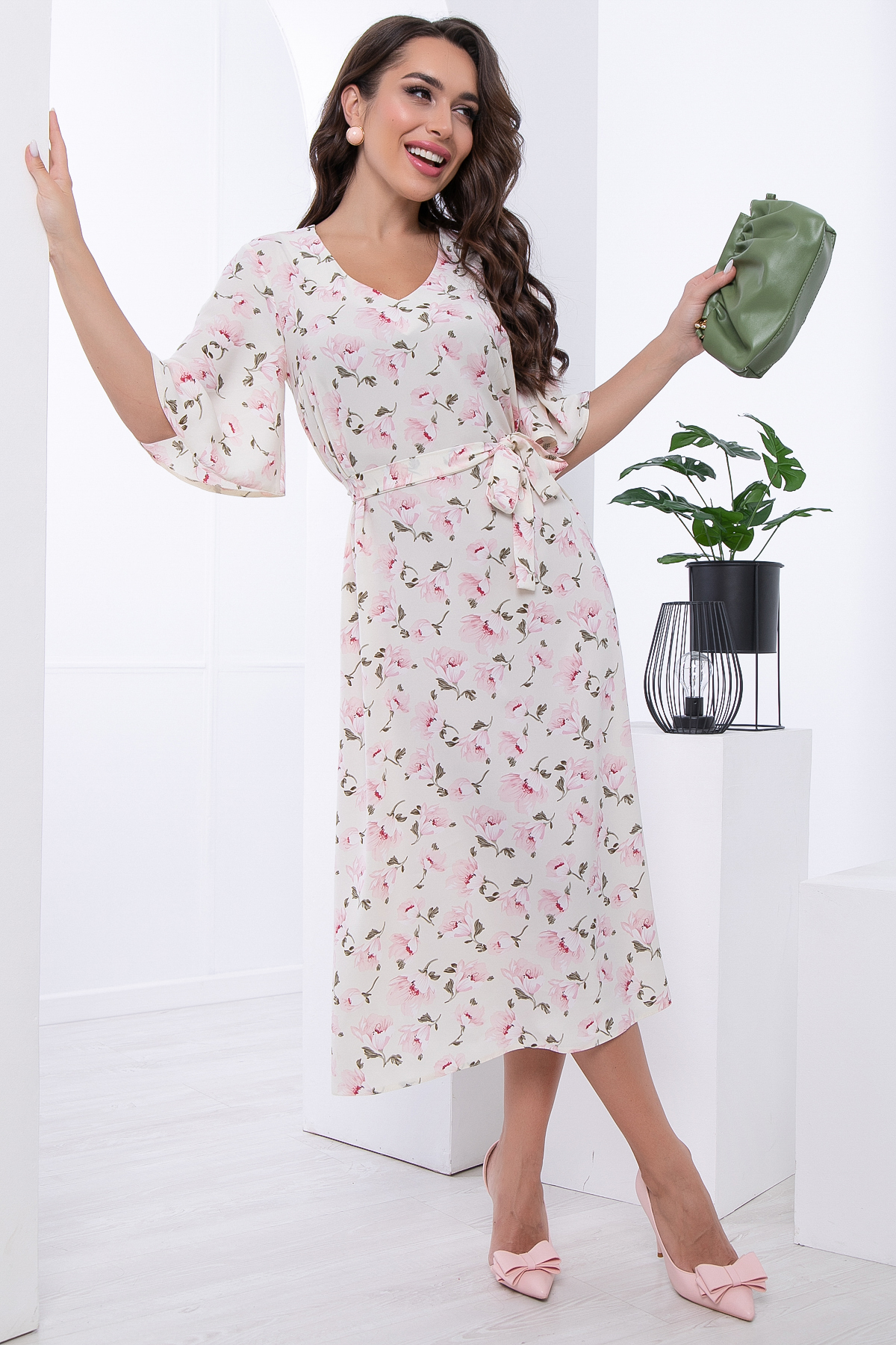 Невероятно нежное платье из легкой ткани отлично подойдет на каждый день. За счет своего принта, изделие отлично смотрится даже без украшений. Изюминку образу дополняют рукава по форме "волан". Преимущества фигуры подчеркнет пояс из основной ткани, который идет в комплекте.