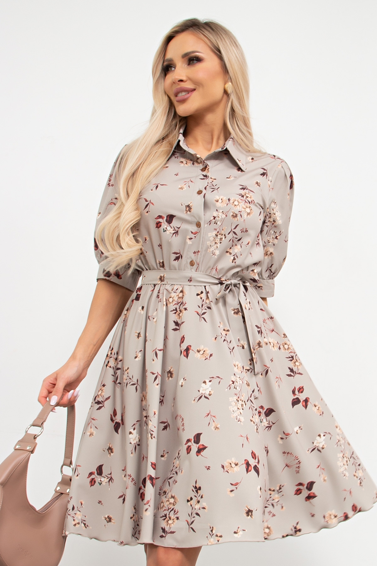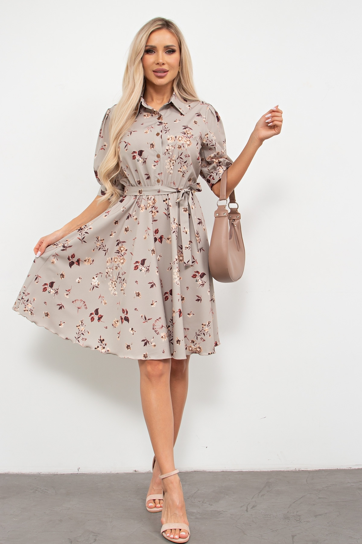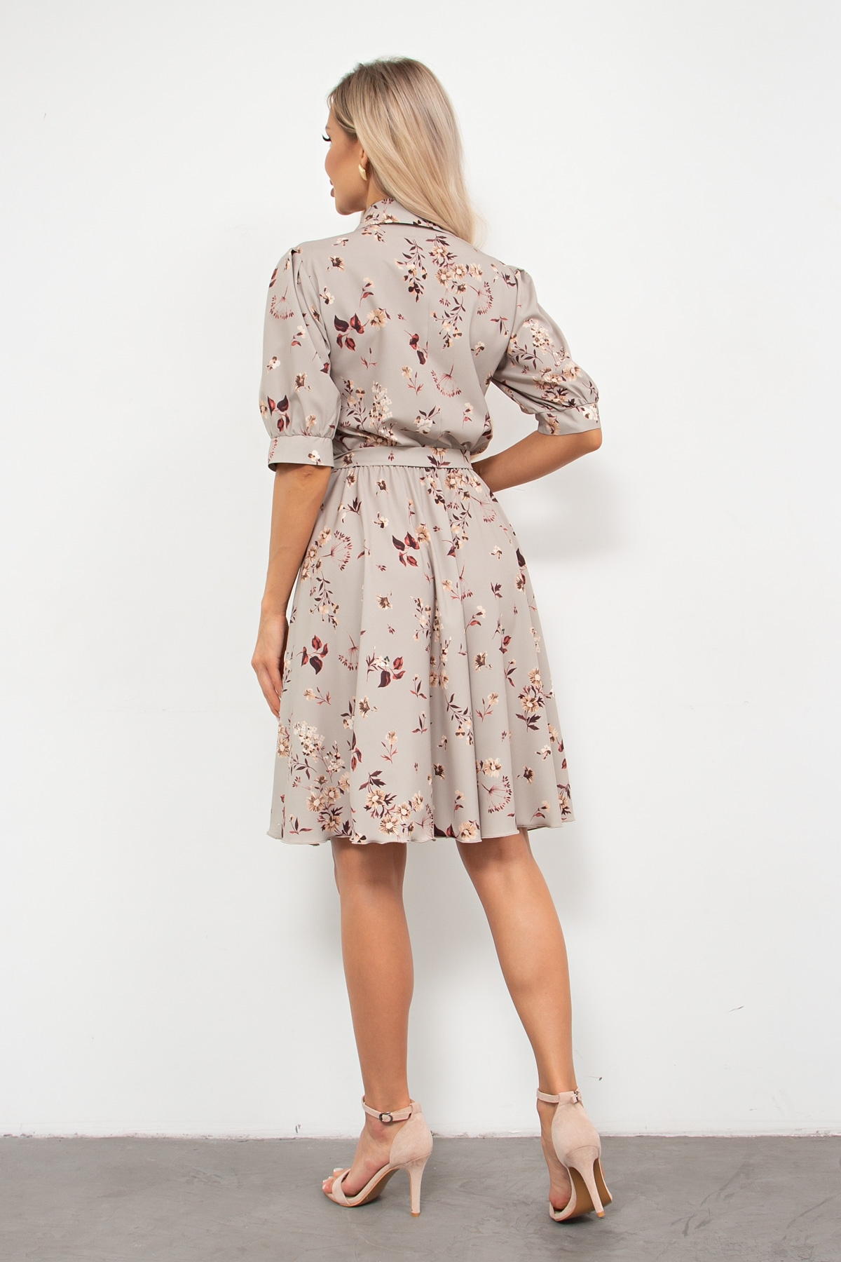 Женственное платье приталенного силуэта из легкой ткани с цветочным принтом прекрасно дополнит ваш гардероб. Короткий втачной рукав на сборке оканчивается притачной манжетой. Горловина оформлена классическим воротником на стойке. По переду выполнена планка с застежкой на петли и пуговицы. Модель отрезная по линии талии, присборена на эластичную резинку. Низ ровный, без разрезов.