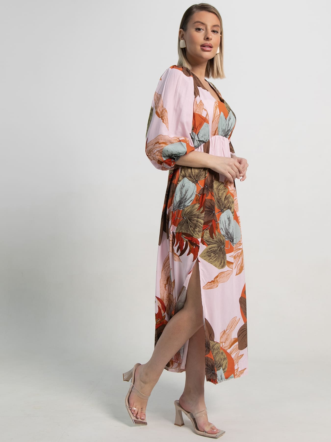 Лёгкое, воздушное, длинное летнее платье из штапеля — это то, что нужно для жаркой погоды! Оно не только удобное, но и красивое: яркий принт поднимет настроение и подчеркнёт вашу женственность. Оно отлично подходит для отдыха и прогулок, а также для города. Сочетайте его с разной обувью: туфлями, босоножками или кедами — и создавайте множество стильных образов! Платье имеет резинку под грудью, рукав 3/4 на резинке и длинный разрез по ноге.