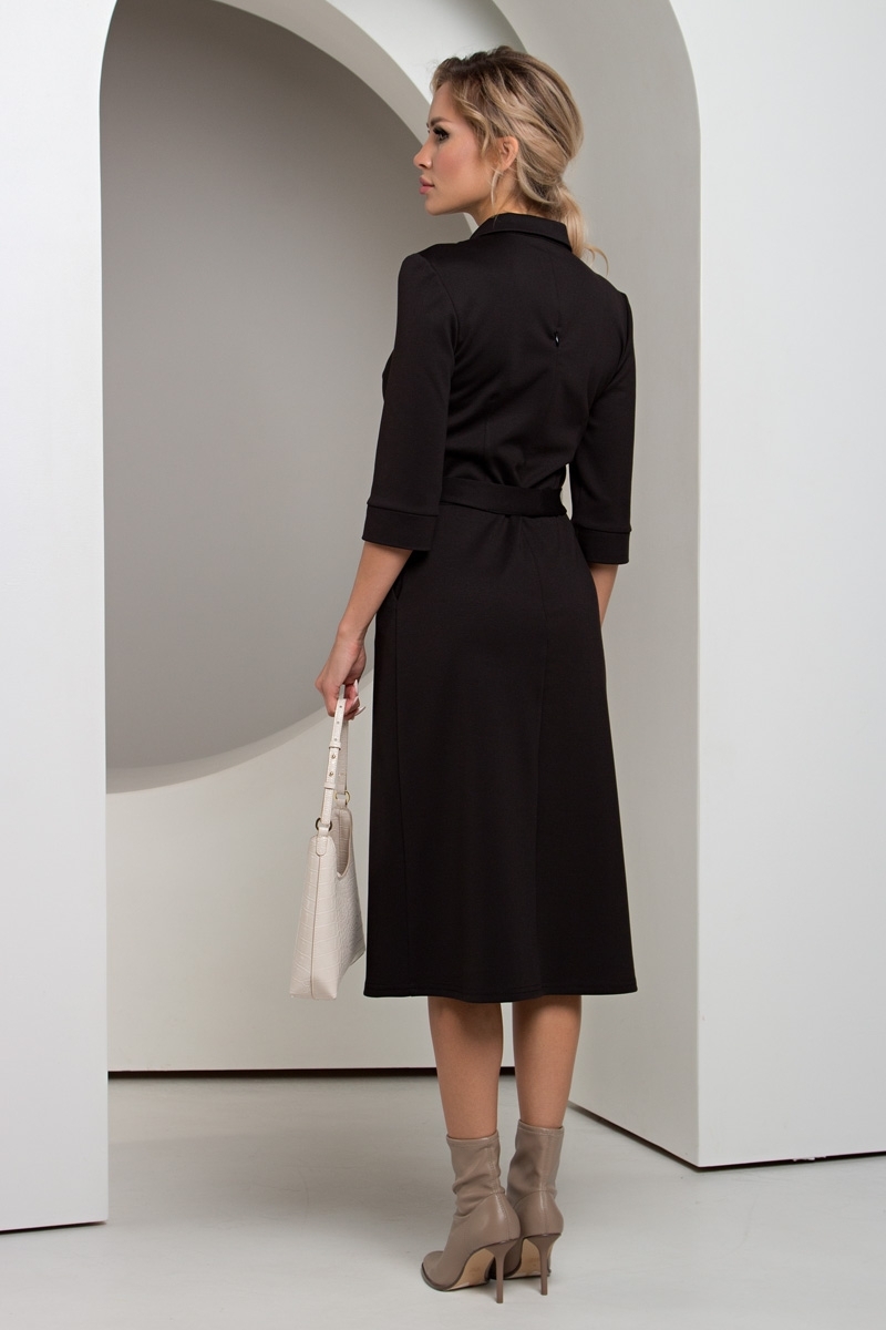 Платье полуприлегающего силуэта из трикотажного полотна. Втачной рукав 3/4 оканчивается притачной манжетой. Горловина оформлена отложным воротником переходящим в планку с застежкой на петли и пуговицы. Модель отрезная по линии талии. По переду юбки заложена встречная складка. По боковым выполнен функциональный карман с отрезным бочком. По спинке застежка на потайную молнию. Тканевый пояс дополнительно подчеркнет линию талии. Модель прекрасно подойдет для создания делового образа.