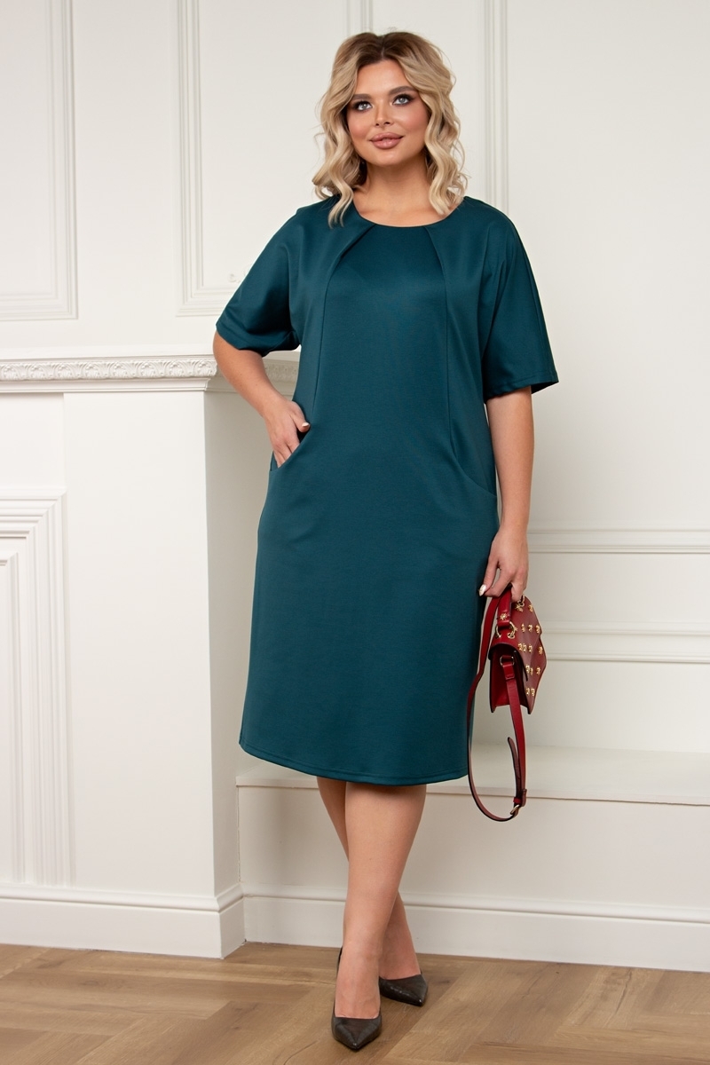 ОПИСАНИЕ Эффектное платье полуприлегающего силуэта из однотонного трикотажного полотна. Короткие цельнокроеные рукава. Круглая горловина на внутренней обтачке с двумя симметричными складками. По бокам два кармана. В среднем шве спинки заложена застежка на потайную молнию. Низ ровный, сзади разрез. Платье станет прекрасной основой для создания праздничного образа. Рекомендуемая стирка при t не более 30°. Длина изделия: 100 см Длина рукава от горловины: 37 см Рост фотомодели: 170 см Размер фотомодели: 52 Ткань: Трикотаж
