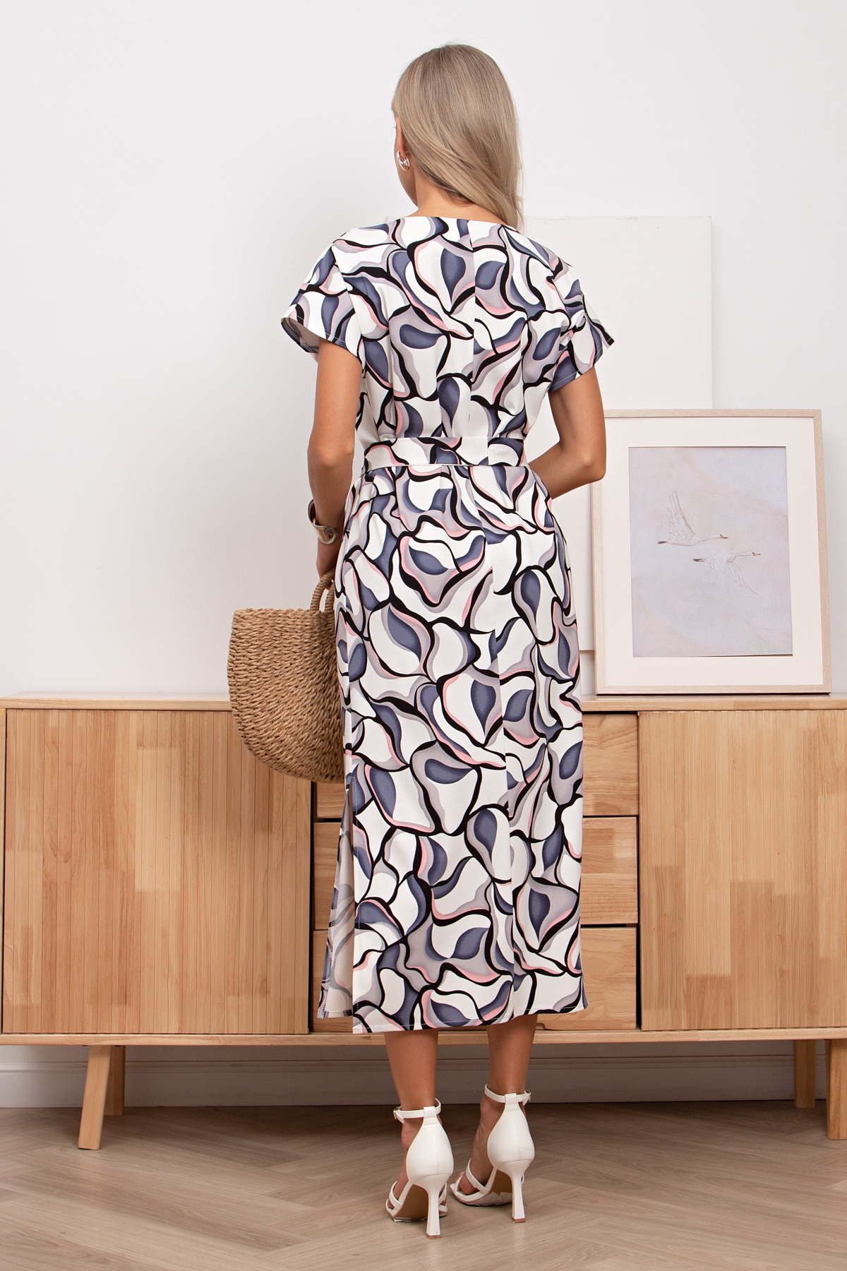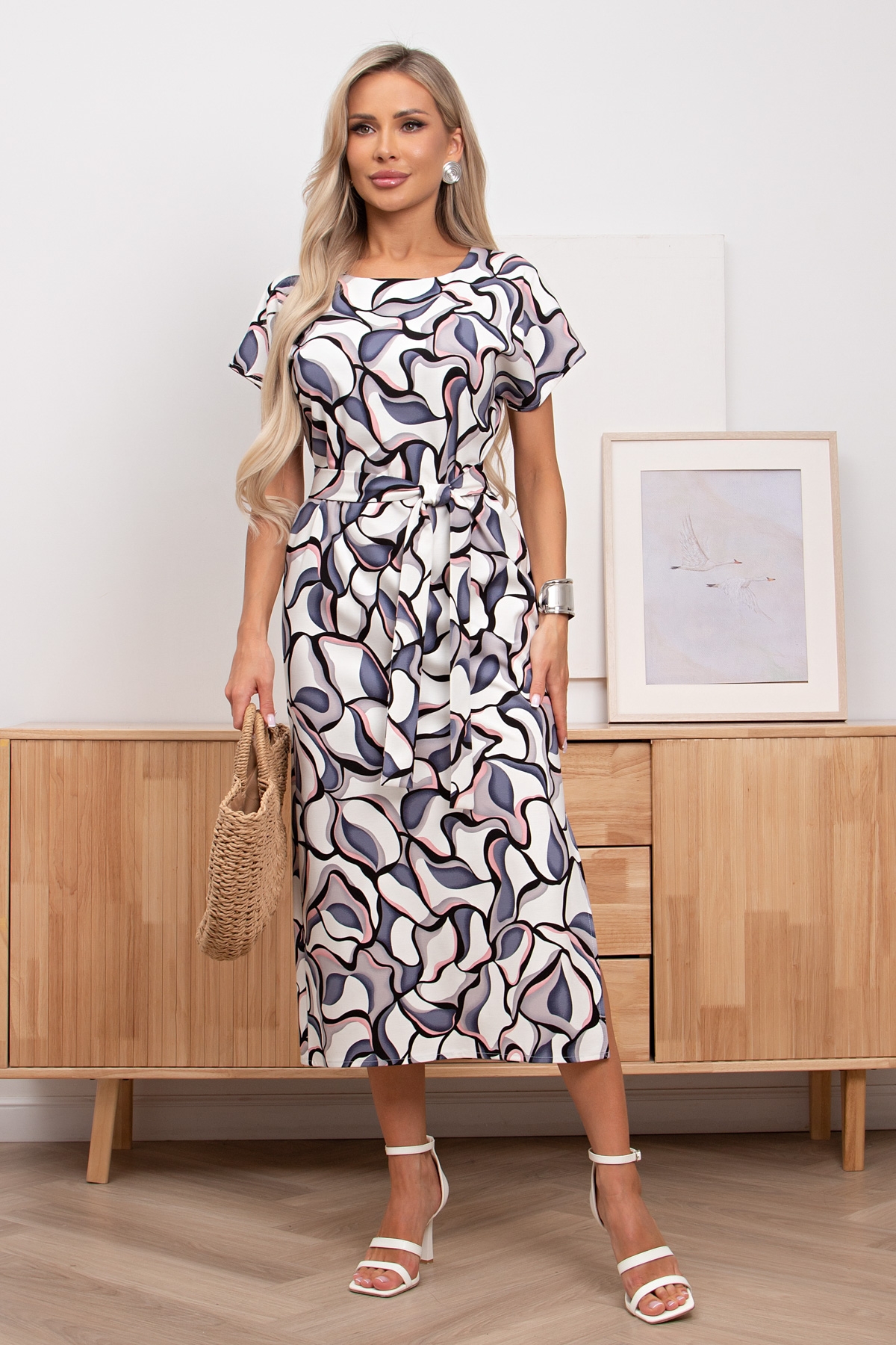 Универсальное платье прямого силуэта из трикотажного полотна. Цельнокроеный короткий рукав. Горловина оформлена лодочкой. Тканевый пояс подчеркнет линию талии. Низ ровный, сбоку разрез.