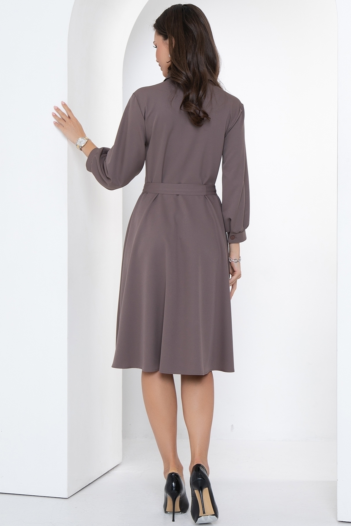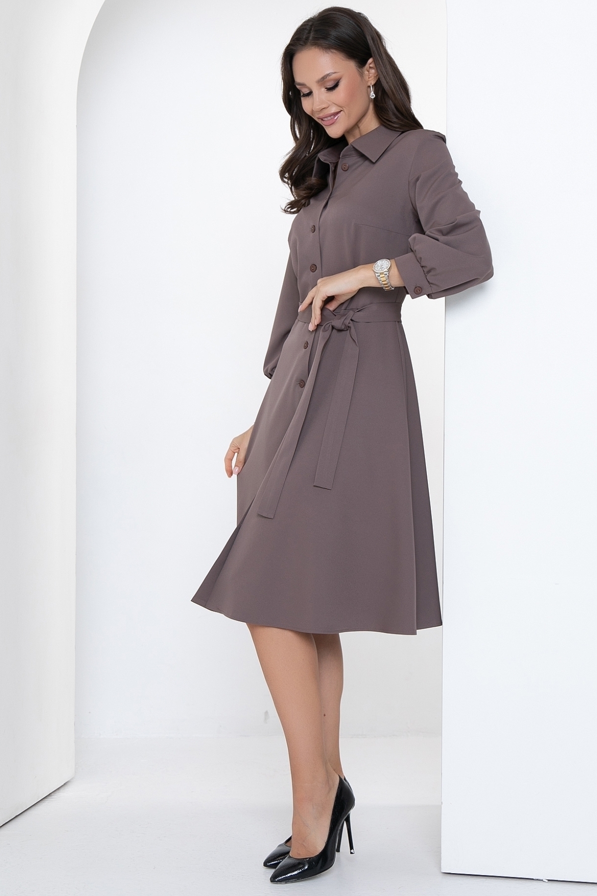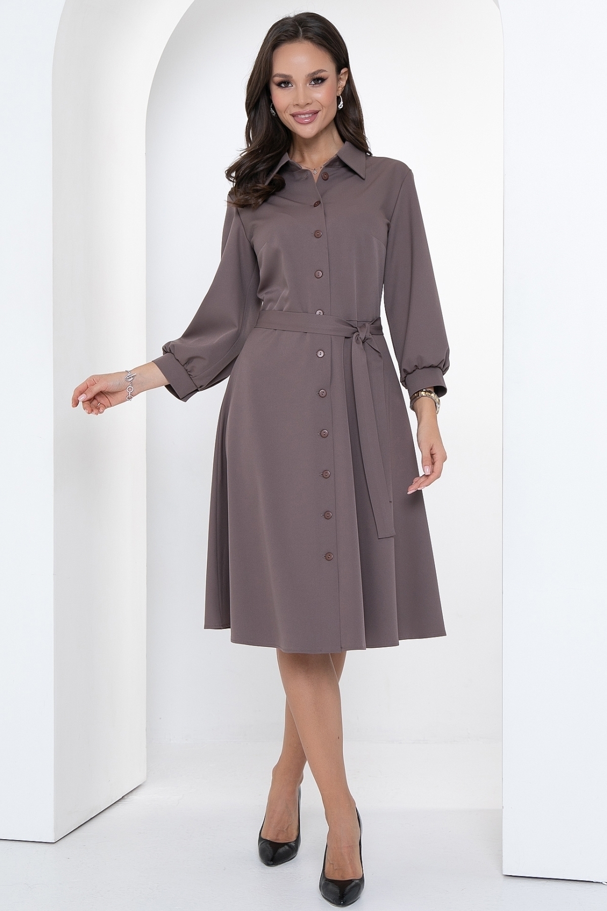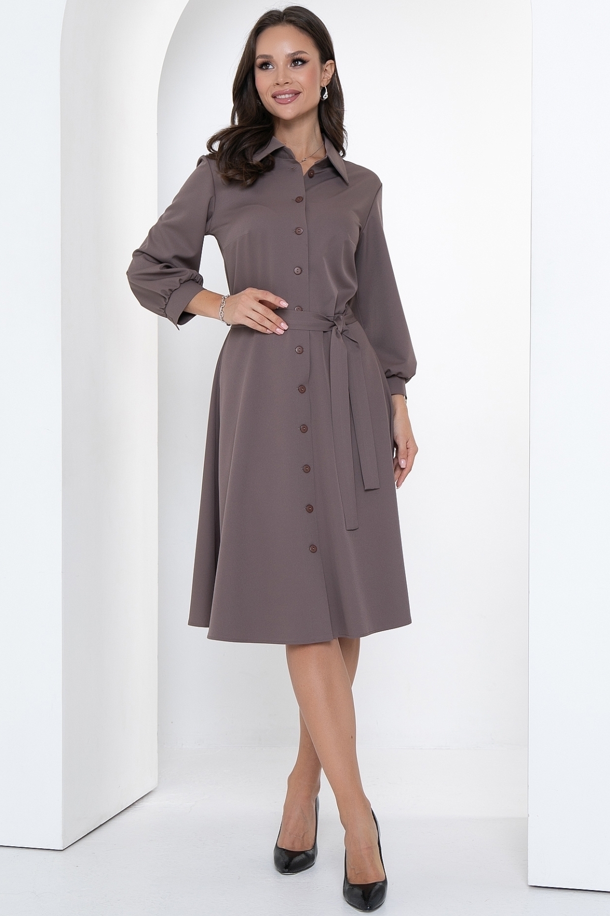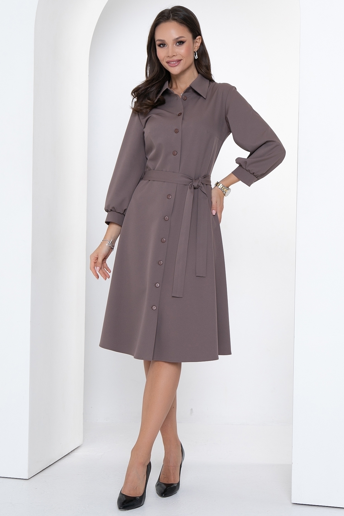 Отличное платье на все случаи жизни! Оно сочетает в себе элегантность и комфорт, зрительно стройнит и вытягивает силуэт, имеет идеальную посадку. Это платье - настоящая находка для всех модных женщин, которые ищут что-то уникальное и изысканное. Спереди застегивается на пуговицы, по горловине сделан воротничок на стойке. Платье отрезное по линии талии, юбка А-силуэта. Рукав 3/4 внизу со сборкой и манжетом с пуговкой. Платье дополняется поясом из основной ткани