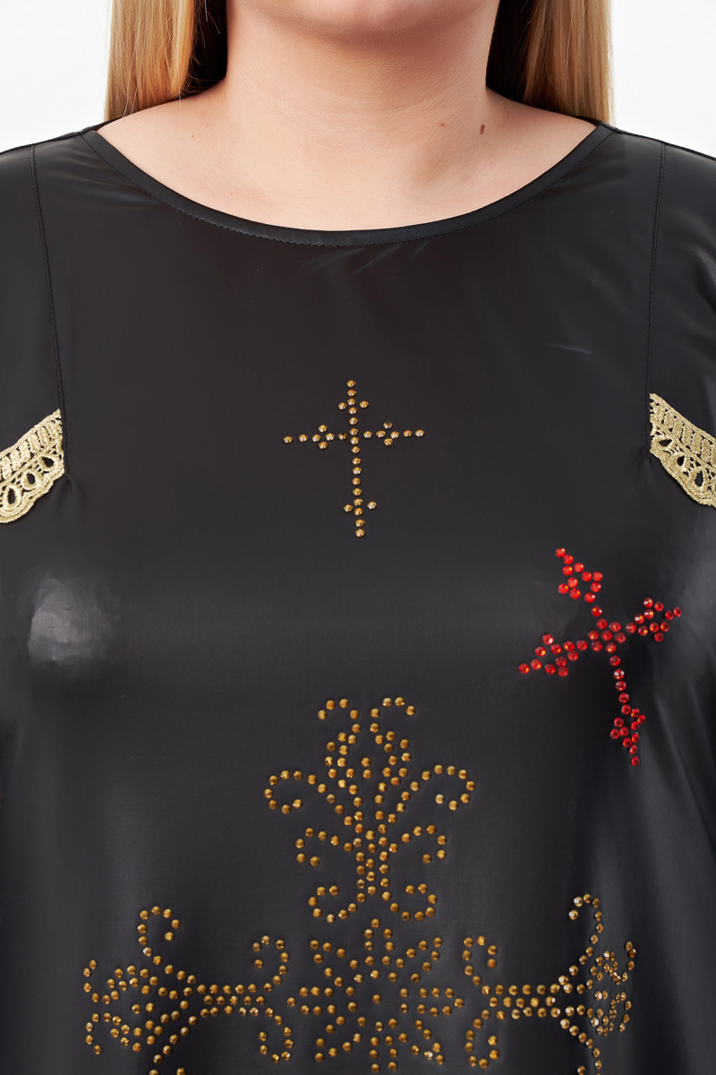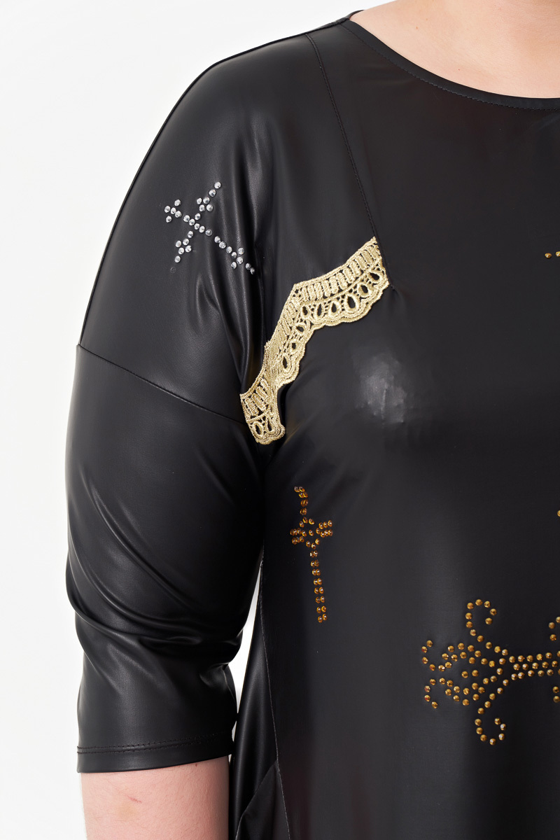 Эффектное платье свободного силуэта из трикотажного полотна имитирующего "кожу" черного цвета. Круглый вырез изделия обработна окантовкой. Перед изделия украшен рисунком из страз и дополнен кружевом. Платье со спущенной проймой и втачными рукавами. По низу изделия манжет на резинке. Аксессуары в комплект не входят. Длина изделия по спинке от плечевого шва до низа изделия — 110 см. Рост модели - 175 см.