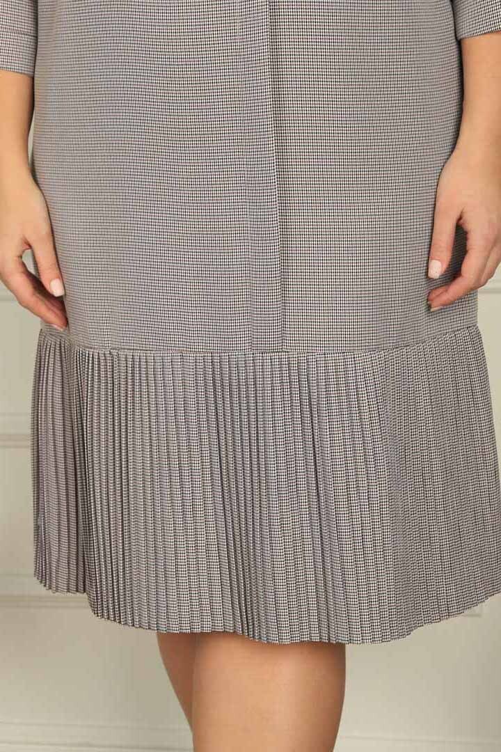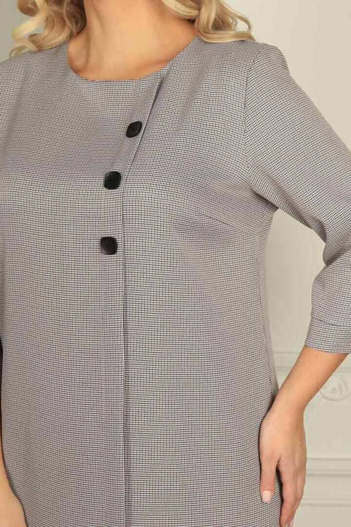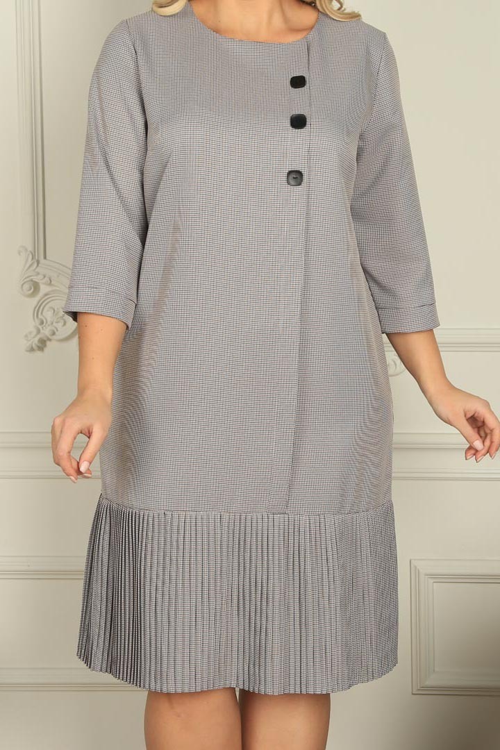 Женственное платье прямого силуэта из трикотажного полотна серого цвета. Круглый вырез изделия обработан внутренней обтачкой. По переду изделия выполнена планка дополненная декоративными пуговицами. Втачные рукава обработаны манжетами. По низу изделия выполнена широкая оборка. Аксессуары в комплект не входят. Длина изделия по спинке от плечевого шва до низа изделия — 101 см. Рост фотомодели 170 см.