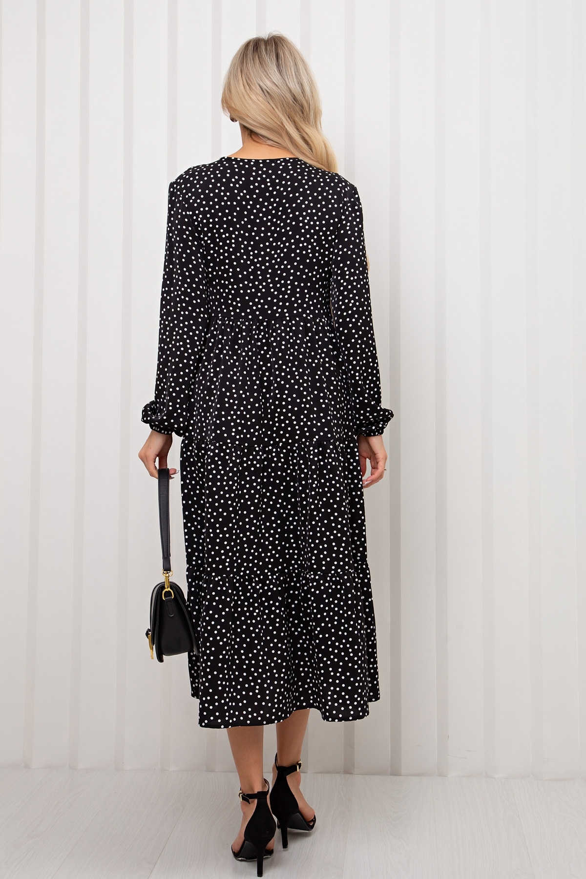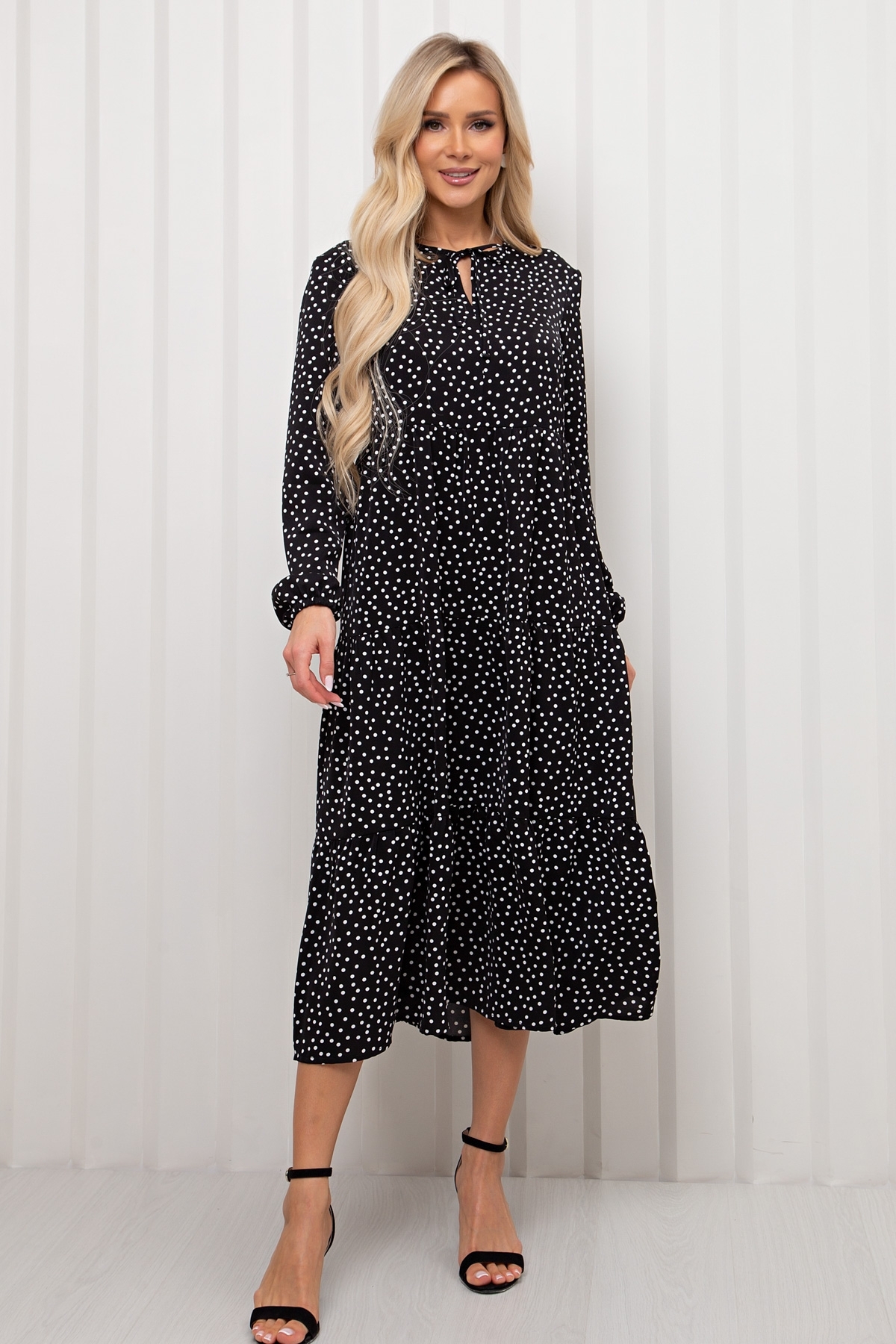 Красивое платье из легкой ткани - Ниагара. Модель отрезная по линии талии. Юбка состоит из трех ярусов на сборке. Округлая горловина отделана узкой бейкой переходящей в завязки, по переду разрез - капелька. Рукав втачной длинный, низ на резинке. Низ ровный, без разрезов. Легкое и воздушное платье подойдет для прогулок и приятных встреч.