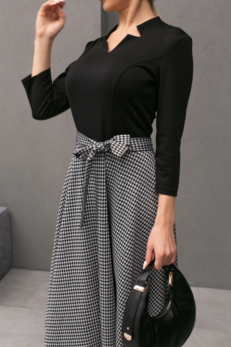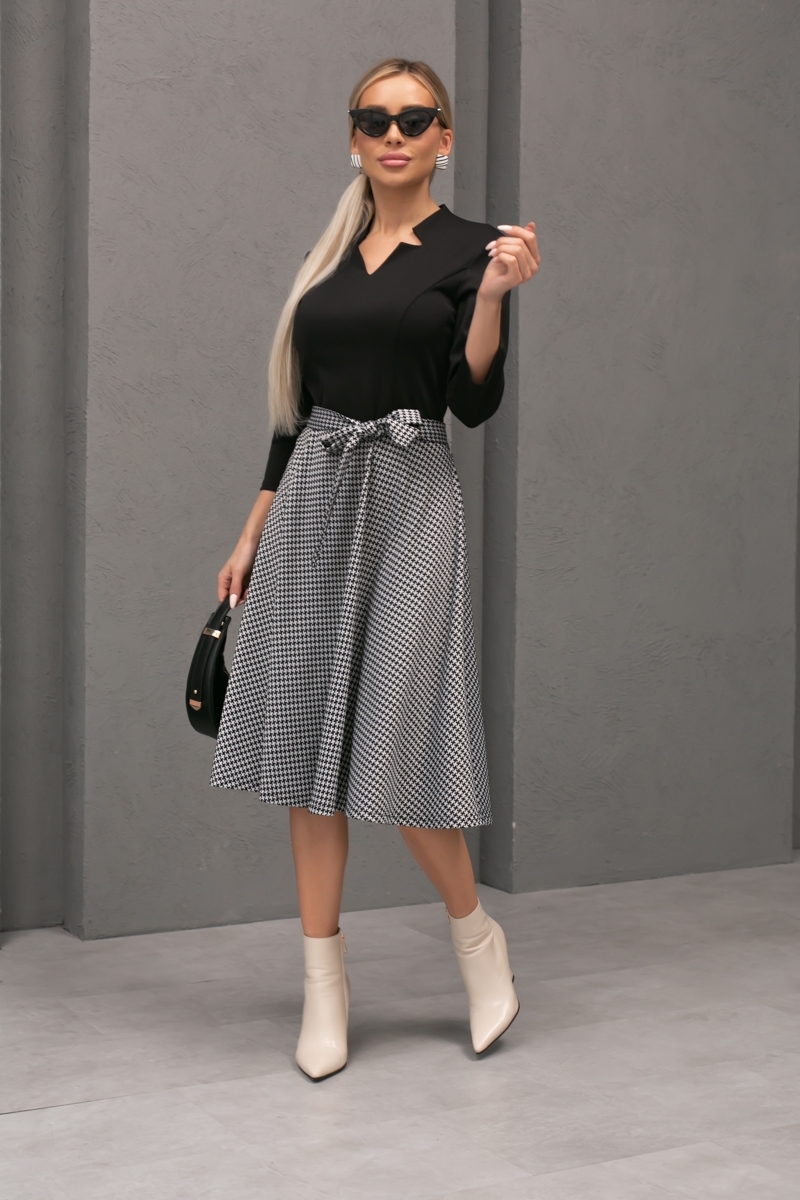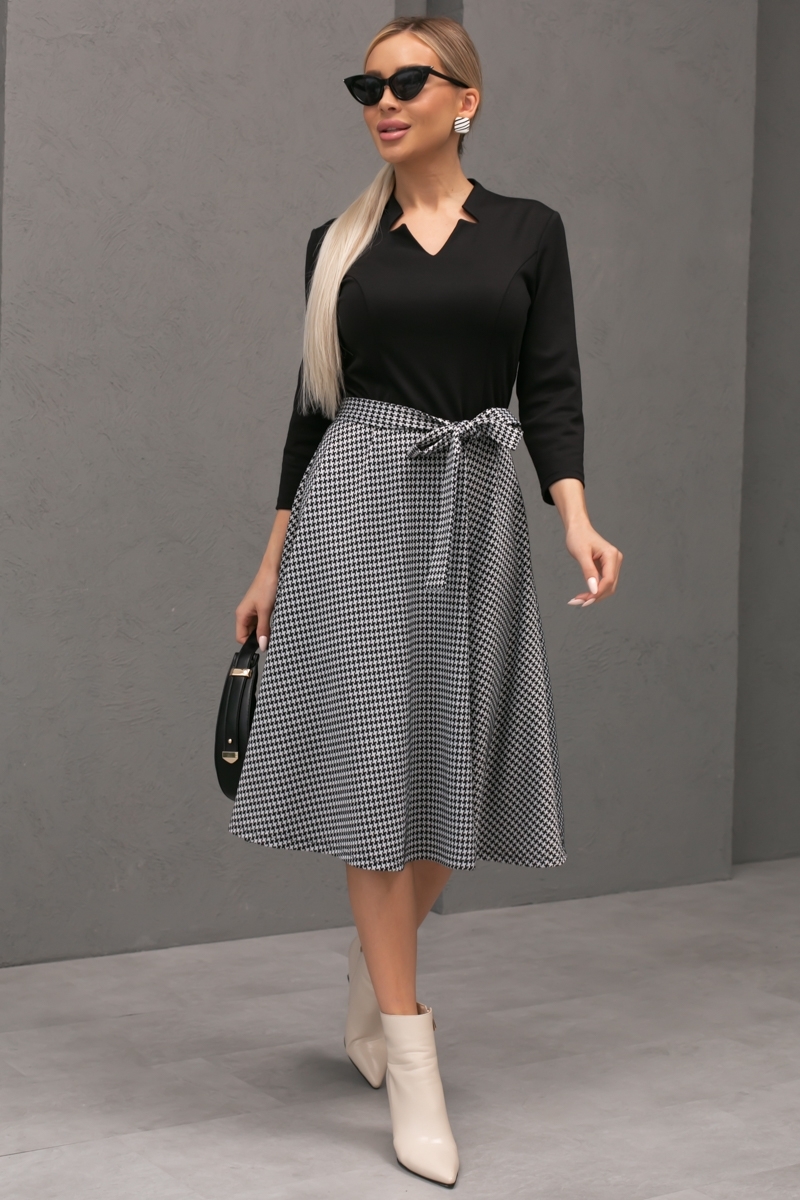 Платье приталенного силуэта из трикотажного полотна. Фигурная горловина с цельнокроеным воротником - стойка. Втачные рукава 3/4. Отрезная линия талии. Низ выполнен в виде юбки колокола, без разрезов. Пояс из основного материала в комплекте.
