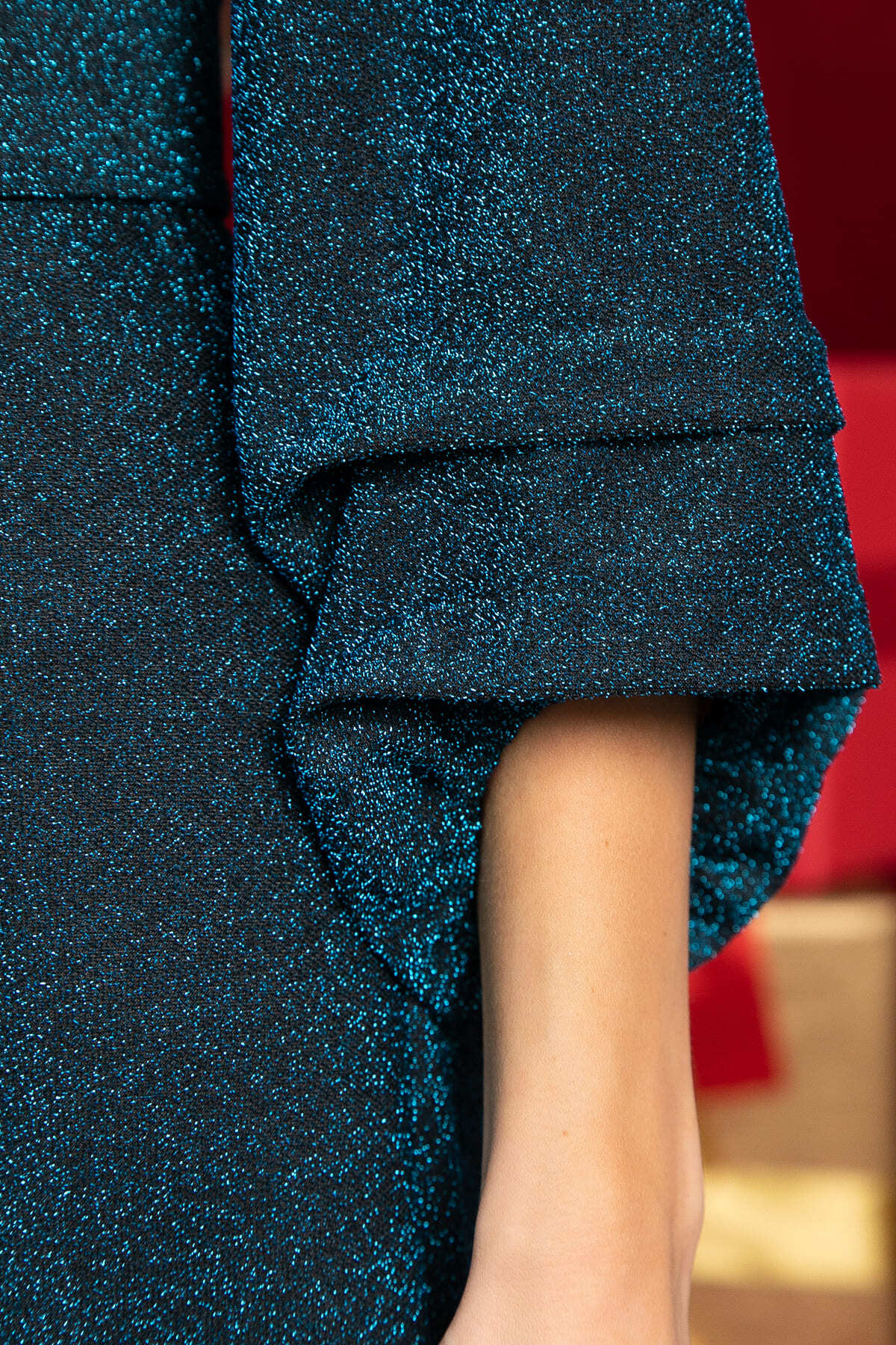 Обновите свой образ с этим праздничным платьем в оттенке морской волны, идеально подходящим для особых случаев и вечерних выходов. V-образный вырез подчеркивает женственность и изящество, а втачной рукав на резинке по низу с двумя складками добавляет платью легкости и шикарного объема. Пояс из той же ткани, украшенный пряжкой со стразами, придает образу изысканность и завершенность. Идеальный выбор для тех, кто ценит утонченность и элегантность в каждом движении.