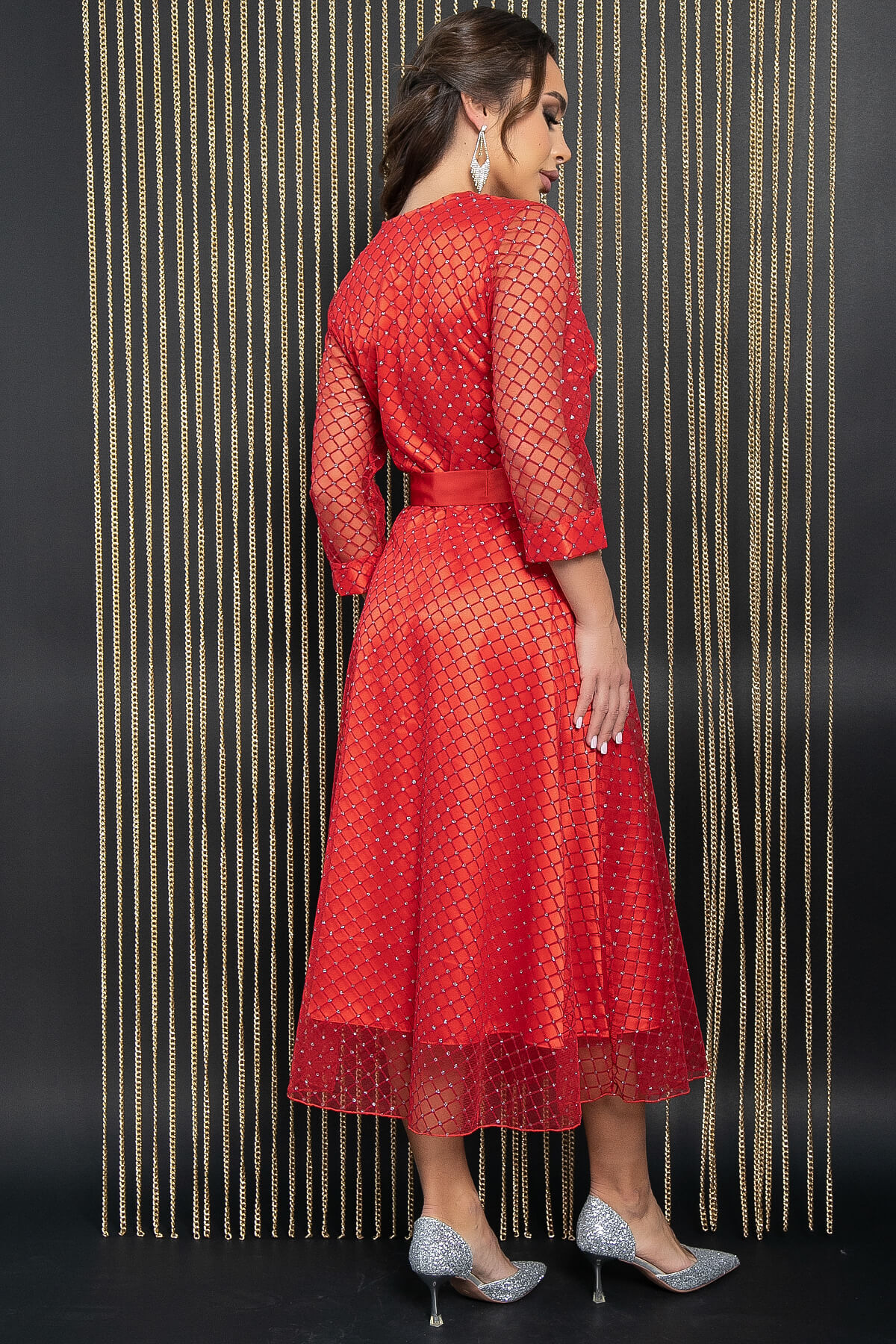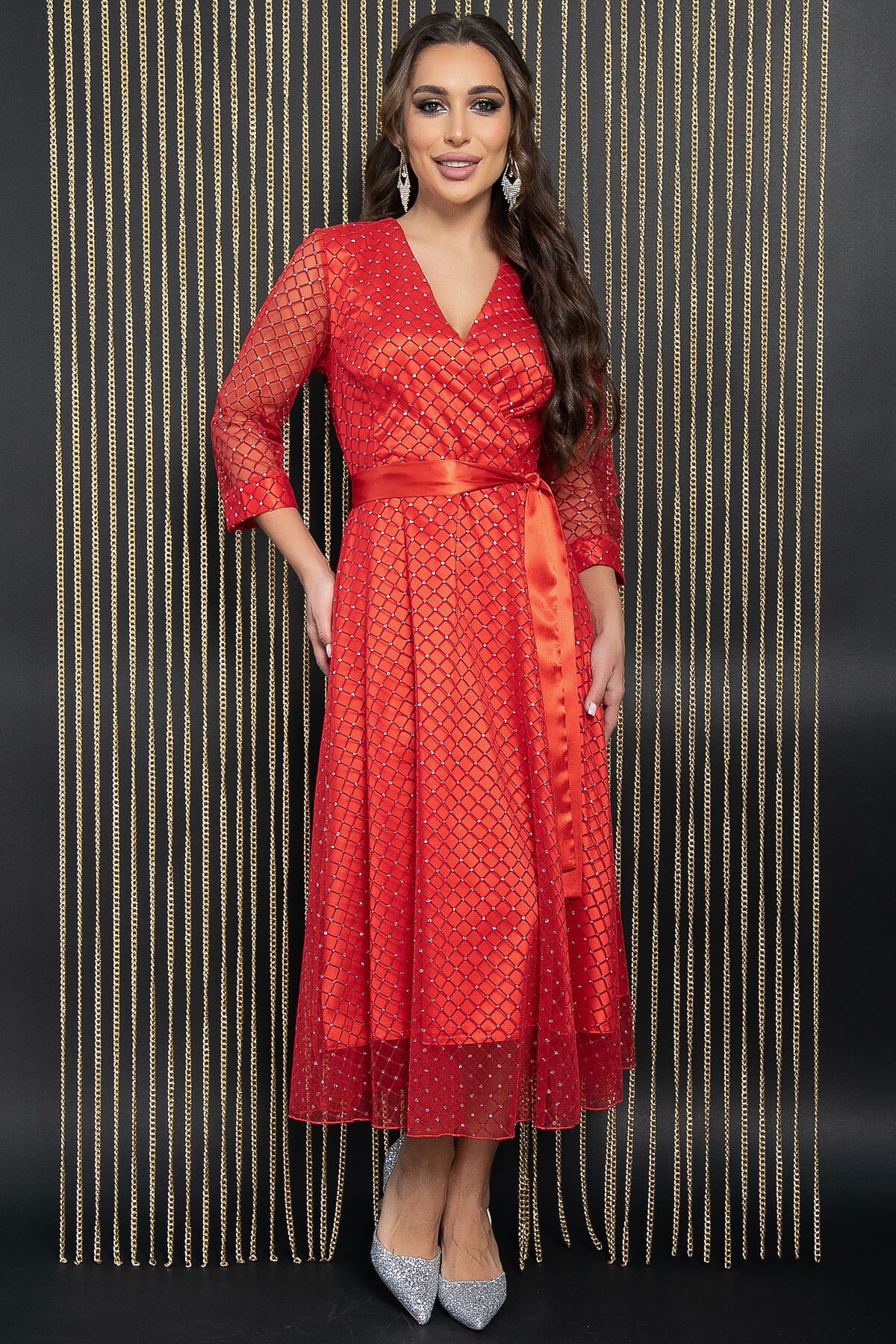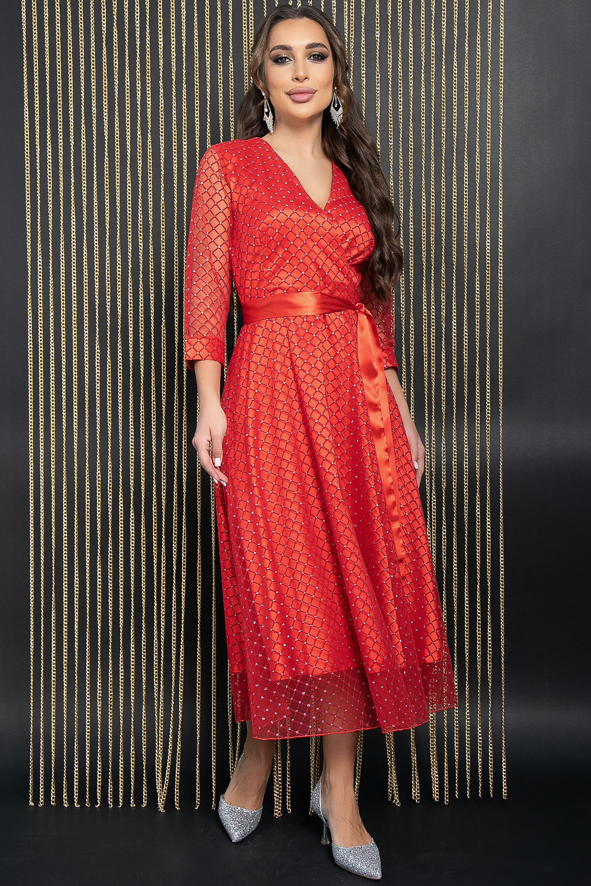 Летящее женственное платье станет идеальным дополнением к вашему образу на Новый год. Эта модель универсальна и подходит для любого праздника, придавая вам женственность, элегантность и праздничное настроение. Платье свободного кроя с длинными рукавами и манжетами по низу. V-образный вырез с эффектом запаха подчеркивает зону декольте. Изделие на подкладке, в комплекте идет атласный пояс.
