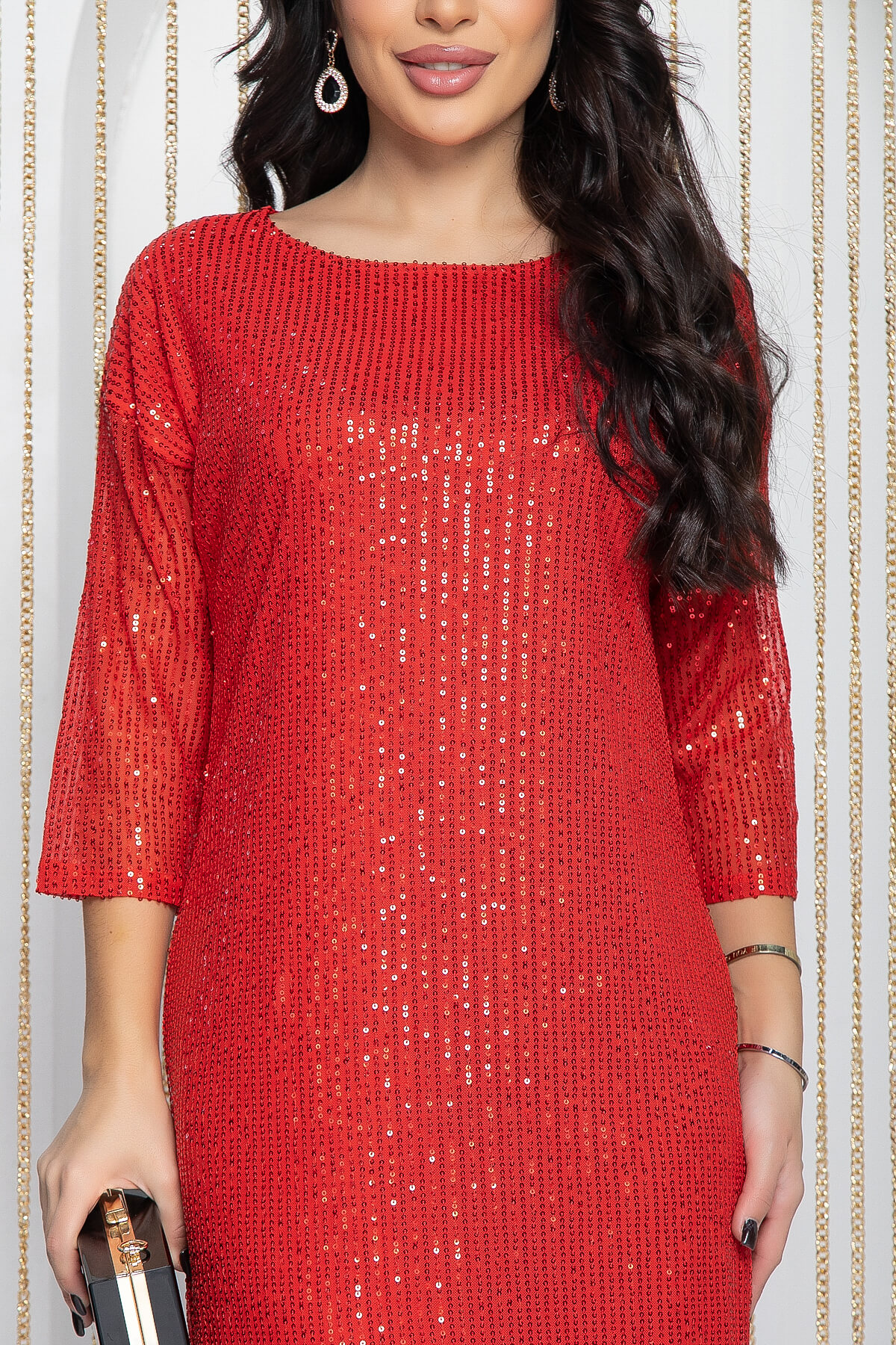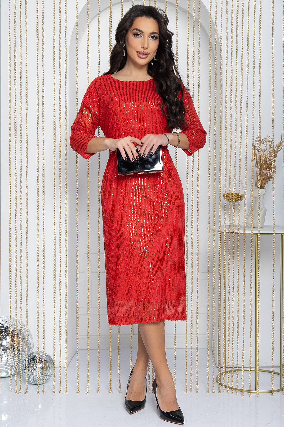 Элегантное платье с пайетками — ваш верный способ привлечь внимание на любой вечеринке! Прямая модель с поясом из основной ткани и рукавом три четверти выгодно подчеркнет достоинства вашей фигуры и скроет недостатки. С этим платьем вы сможете создать множество эффектных образов для праздничным или вечерних образов.