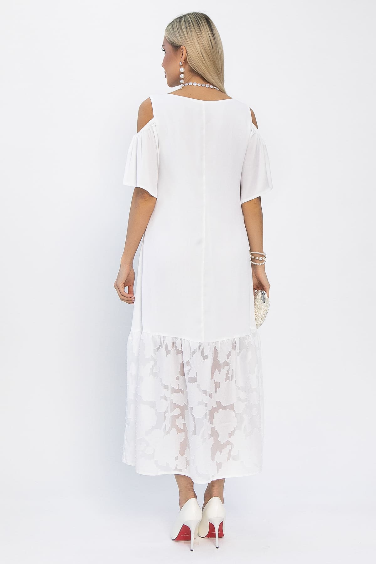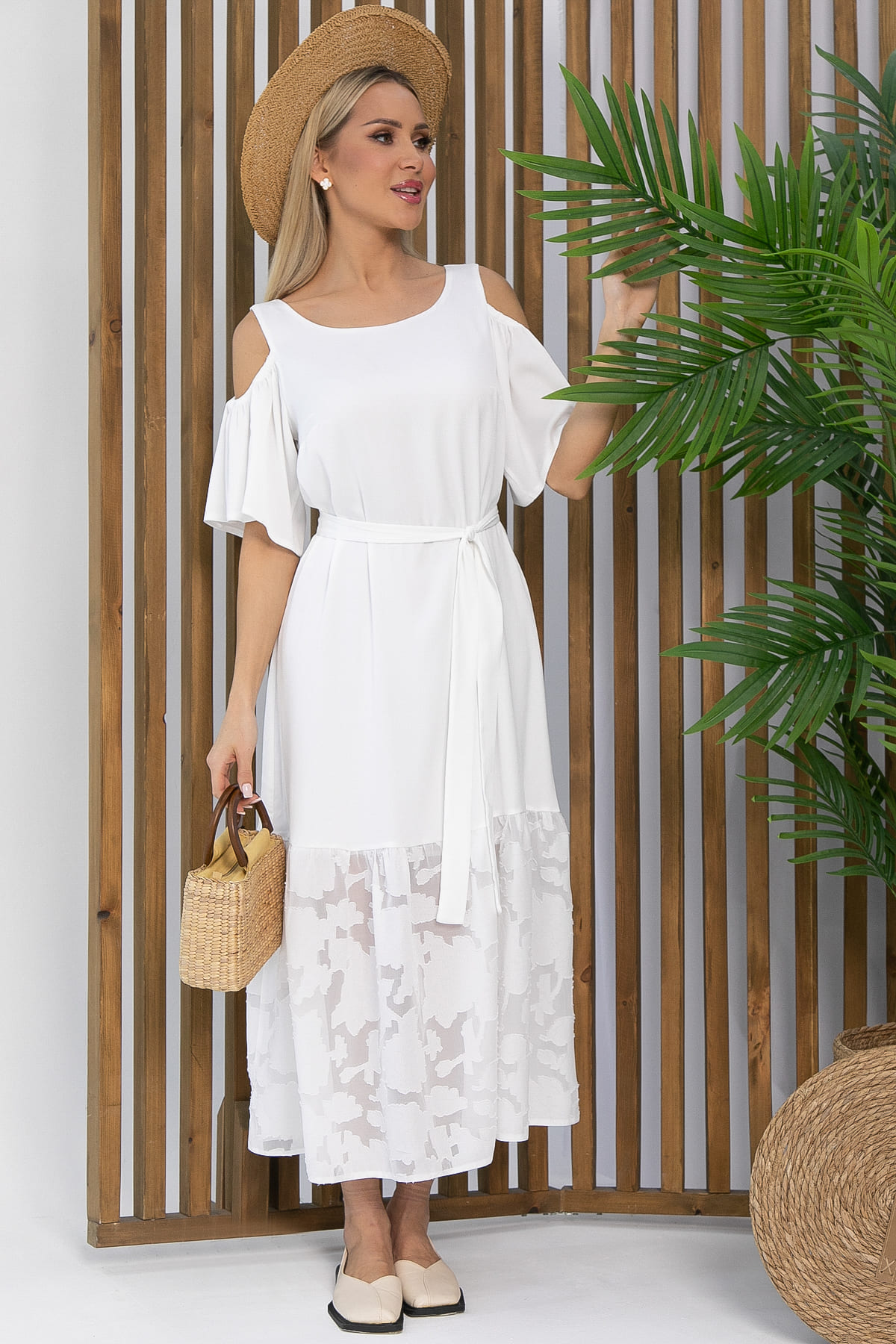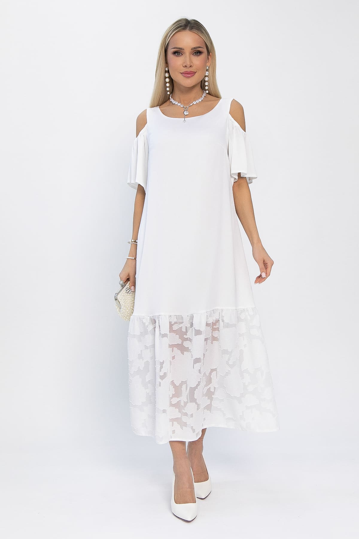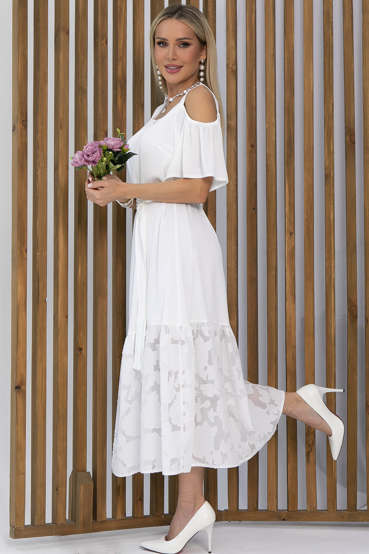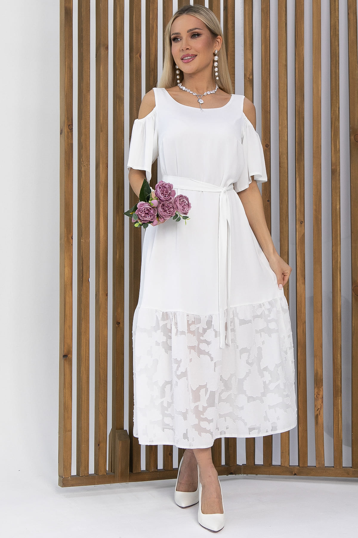 Платье с эффектными рукавами не останется незамеченным. Вырезы на плечах придадут образу изысканности и кокетливости. Низ платья украшен воланом из шифона с цветочным принтом.
