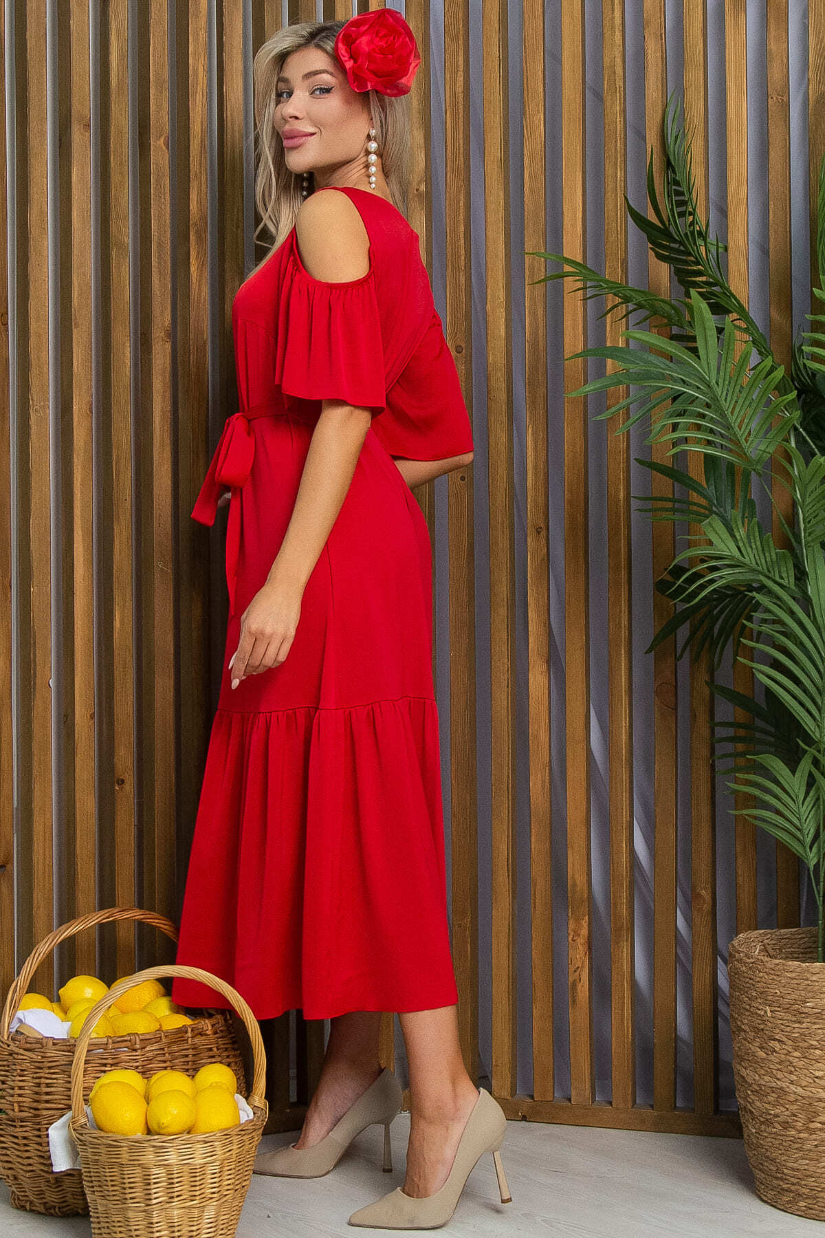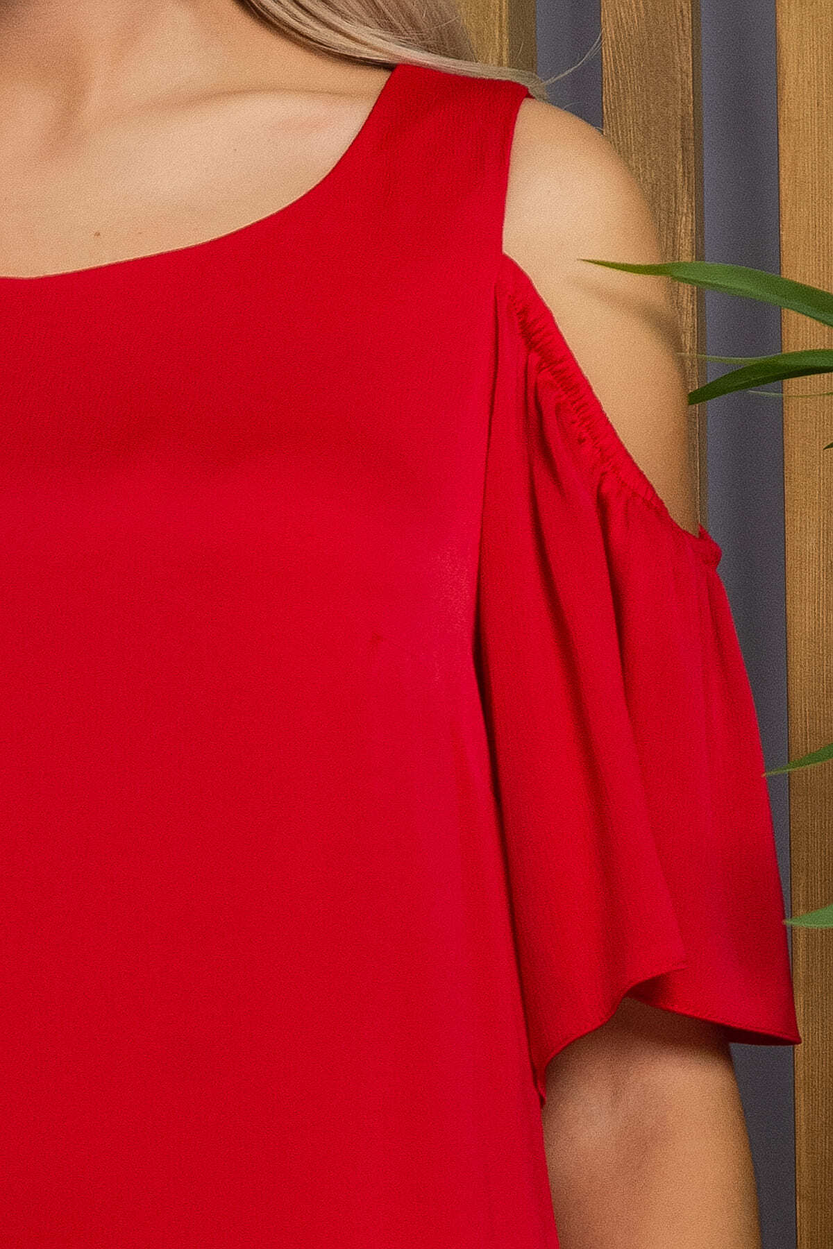 Платье с эффектными рукавами не останется незамеченным. Вырезы на плечах придадут образу изысканности и кокетливости. Низ платья украшен воланом из основной ткани.