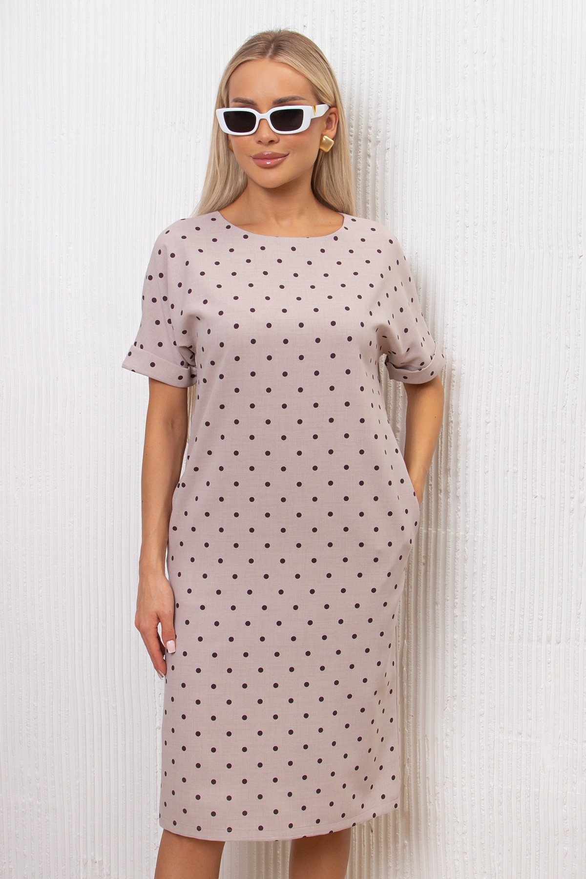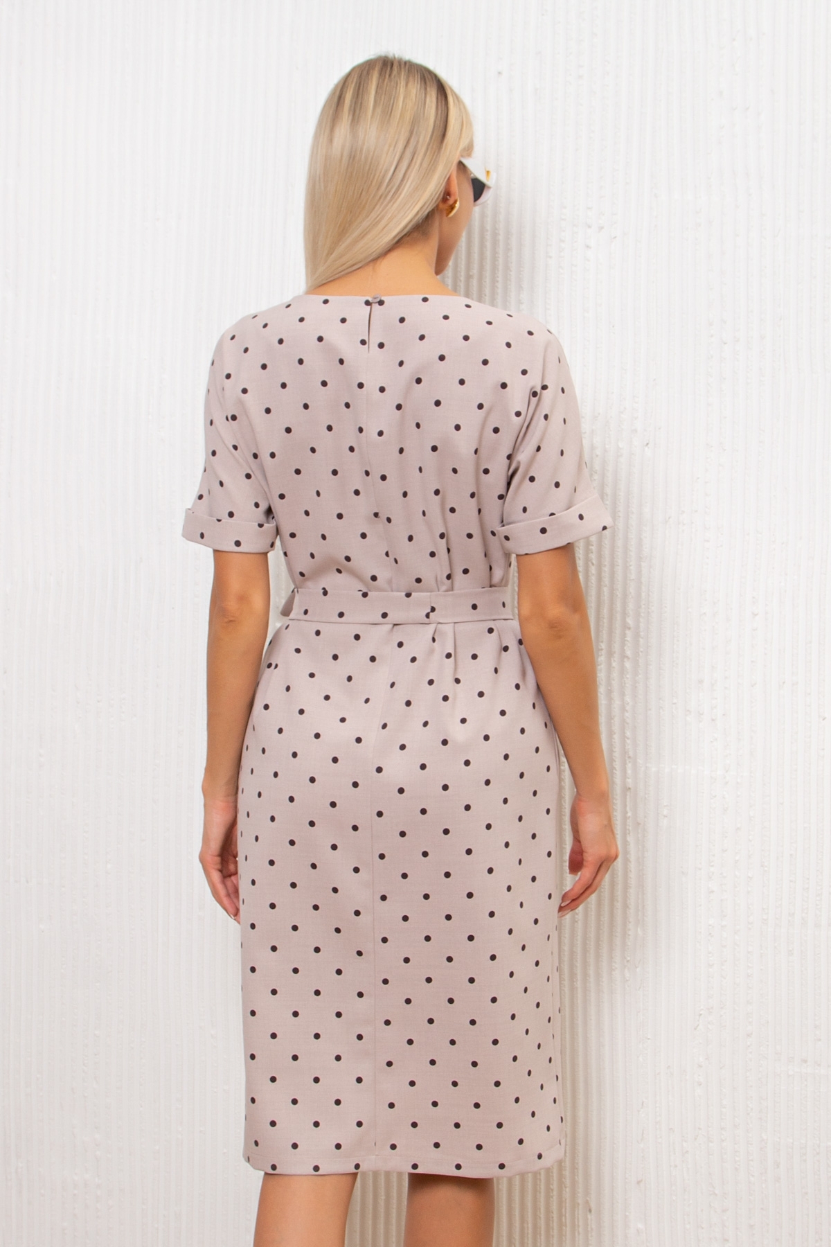 Легкое платье прямого силуэта. Округлая горловина на внутренней обтачке. Короткие цельнокроеные рукава, оканчиваются манжетами на отворотах. В среднем шве спинки расположен разрез с застежкой на пуговицу. Пояс из основного материала в комплекте. Низ ровный, без разрезов.