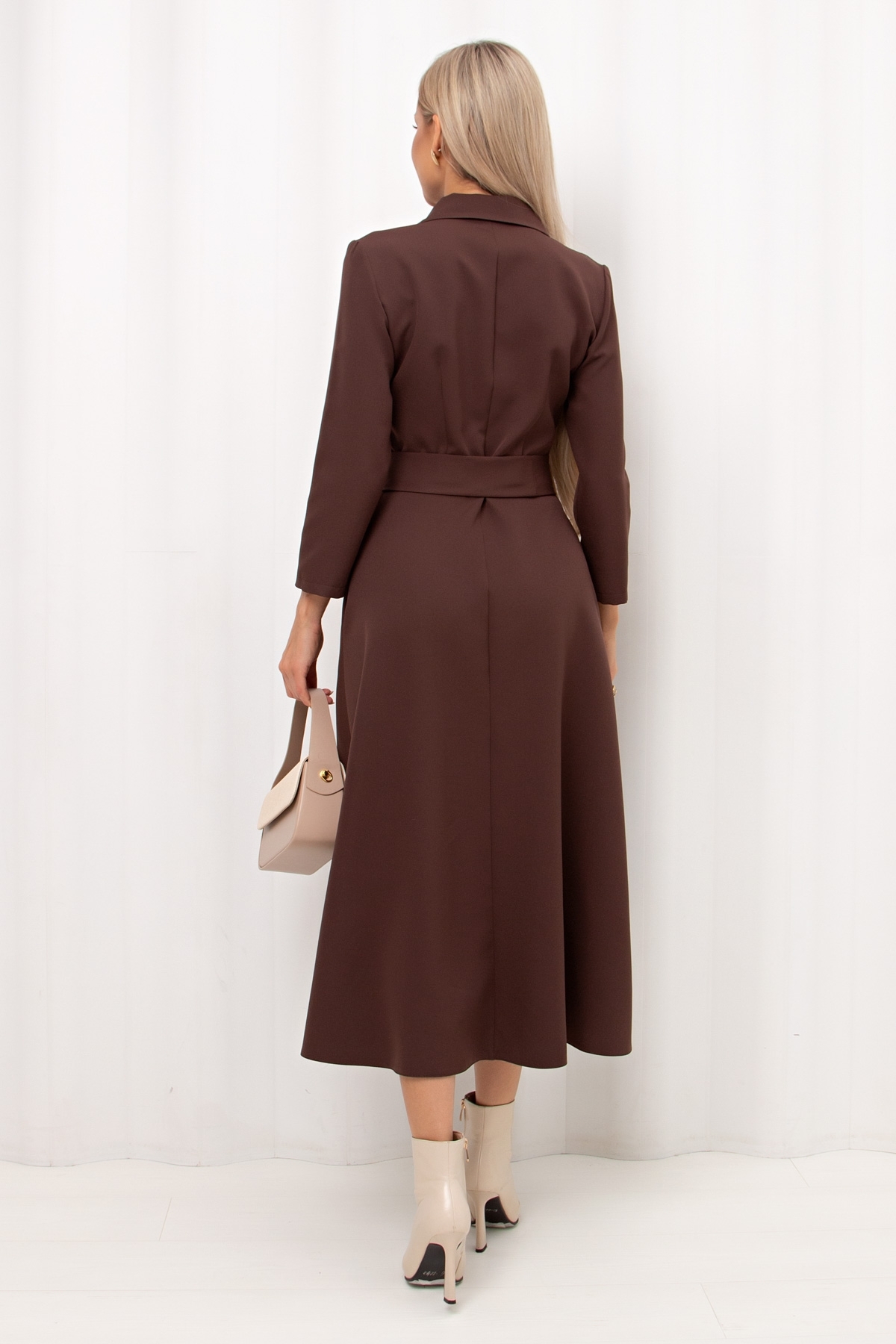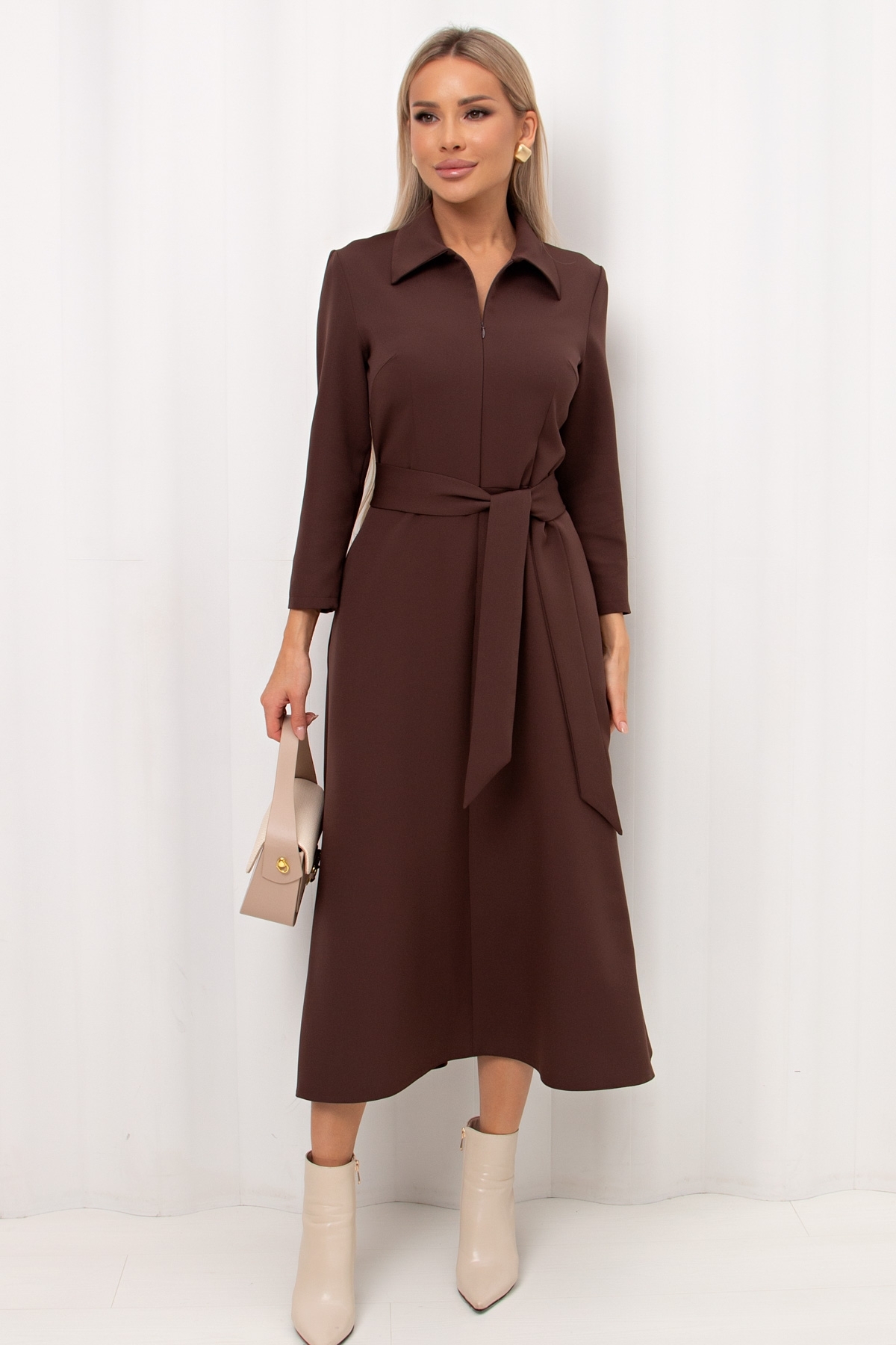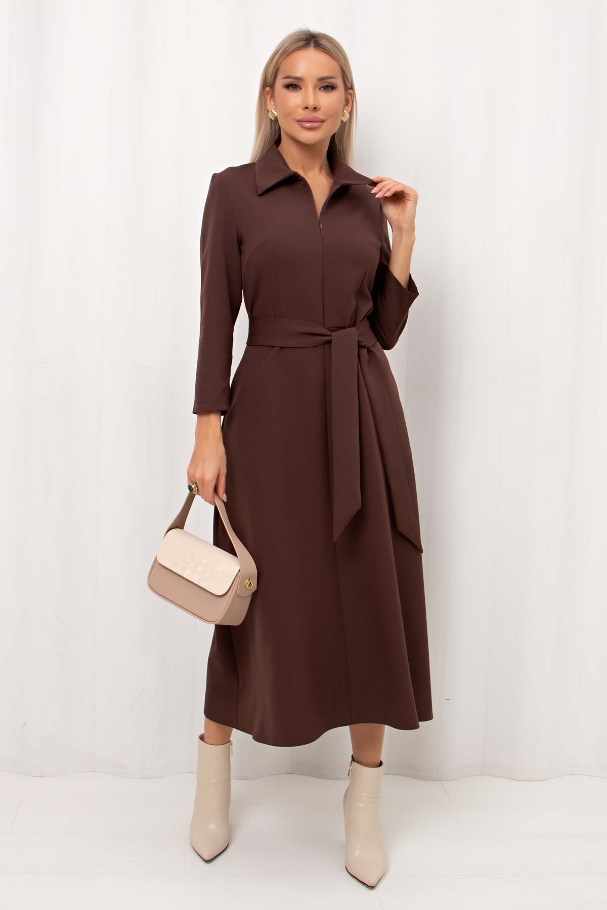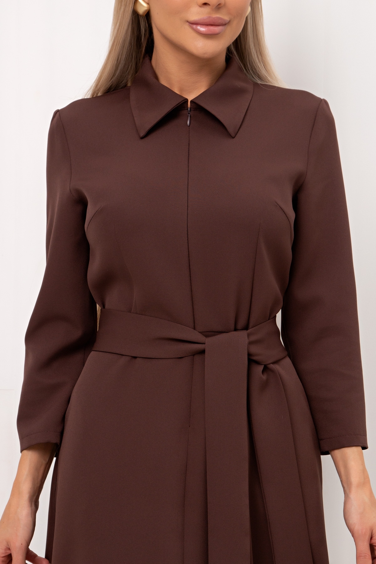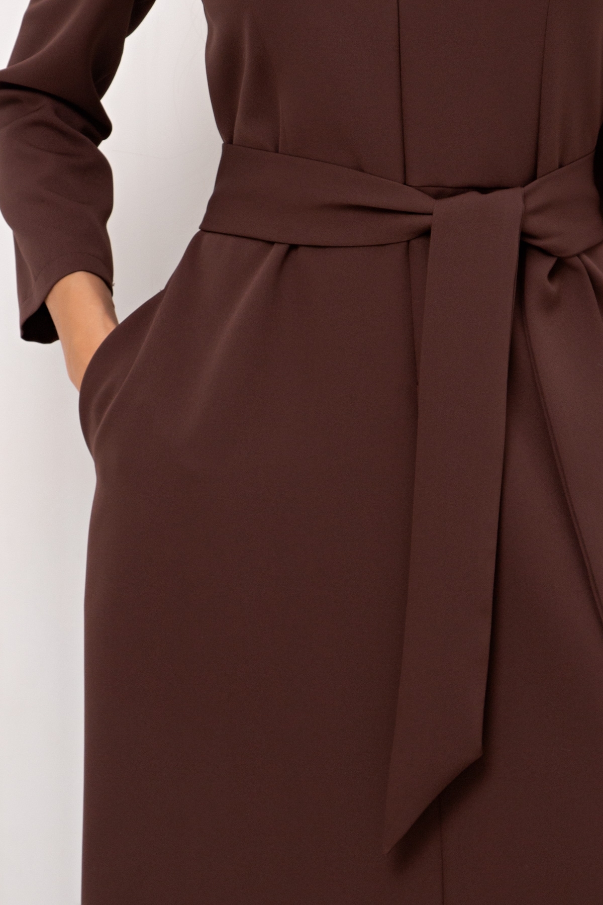 Повседневное платье приталенного силуэта изготовлено из плательно-костюмной ткани. Горловина оформлена отложным воротником. По переду переда застежка на потайную молнию. Втачной рукав длиной 7/8. Модель отрезная по линии талии. В боковых швах функциональные карманы. Пояс из основной ткани в комплекте.