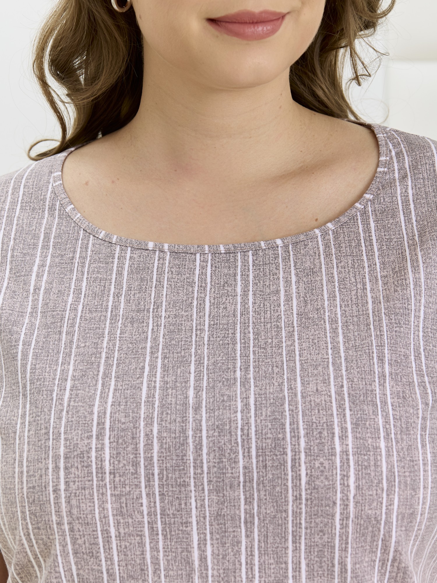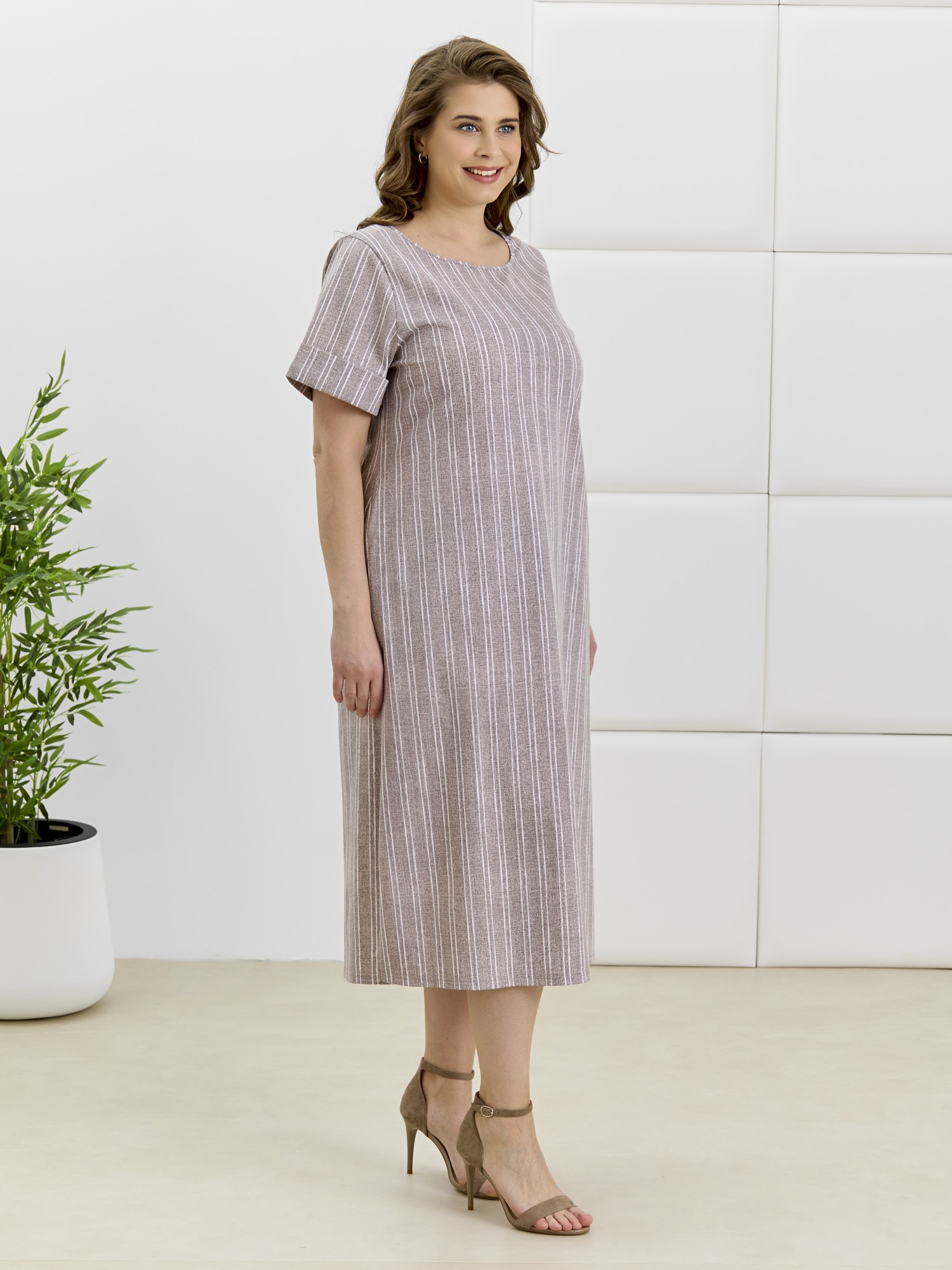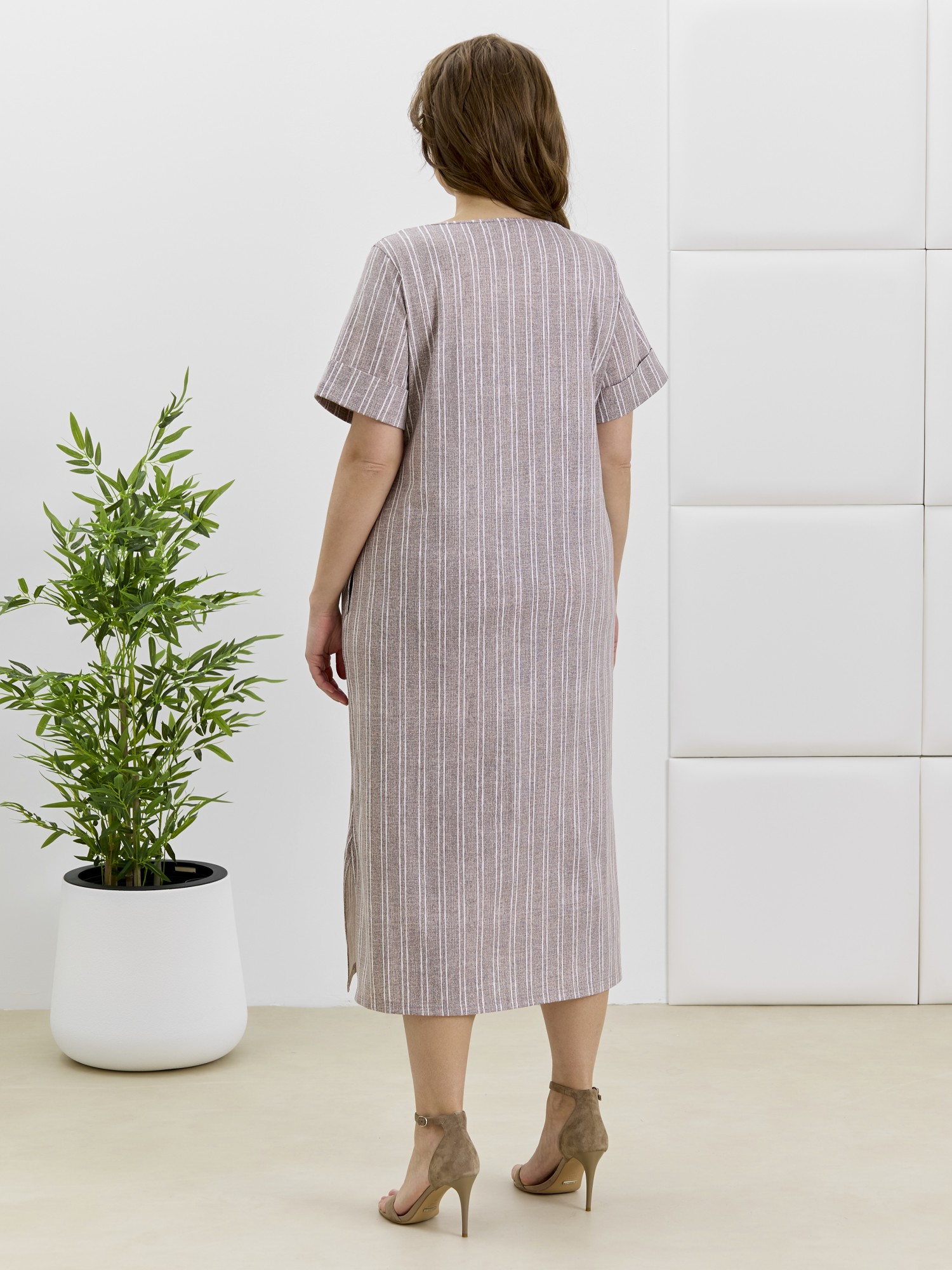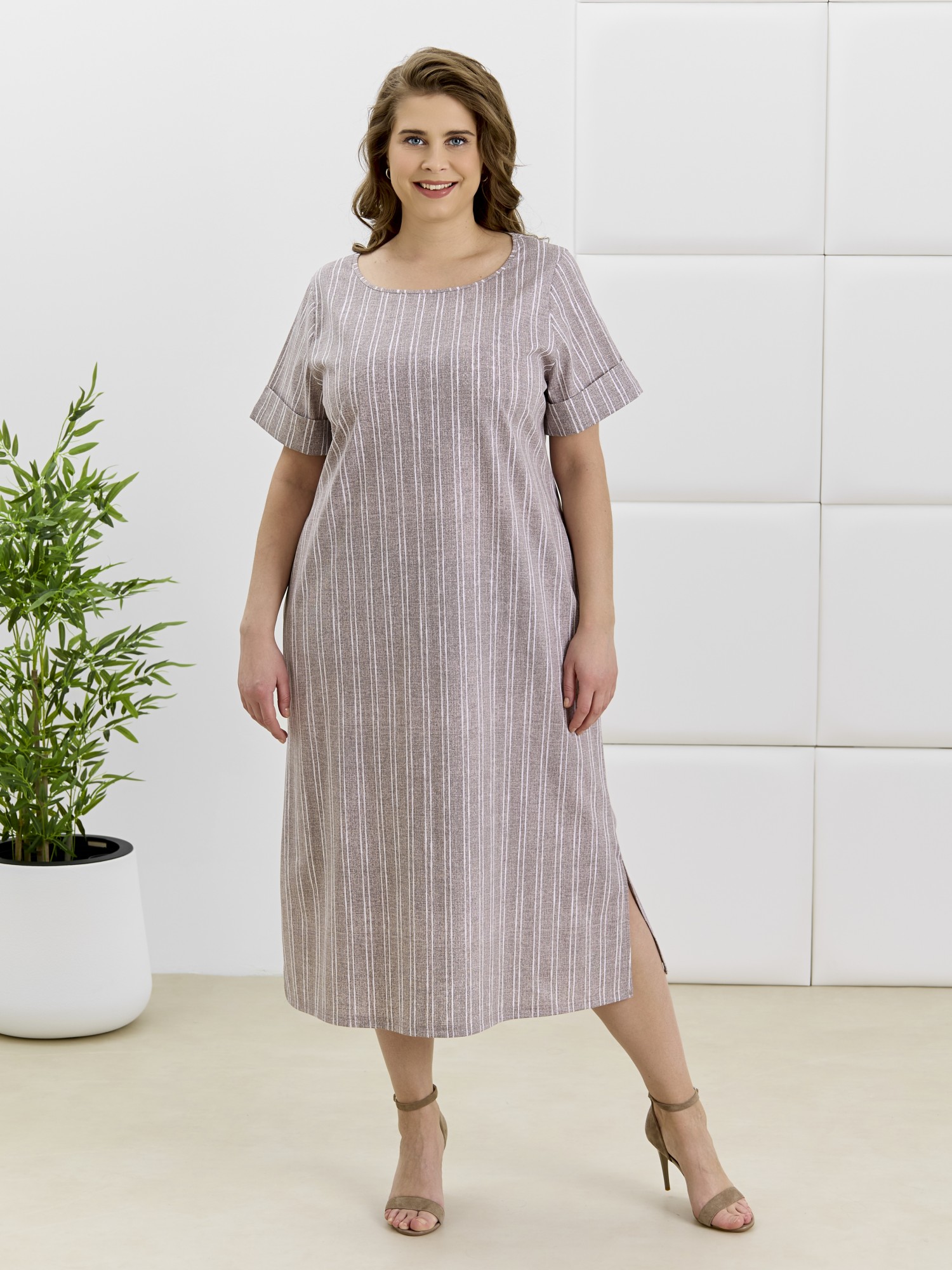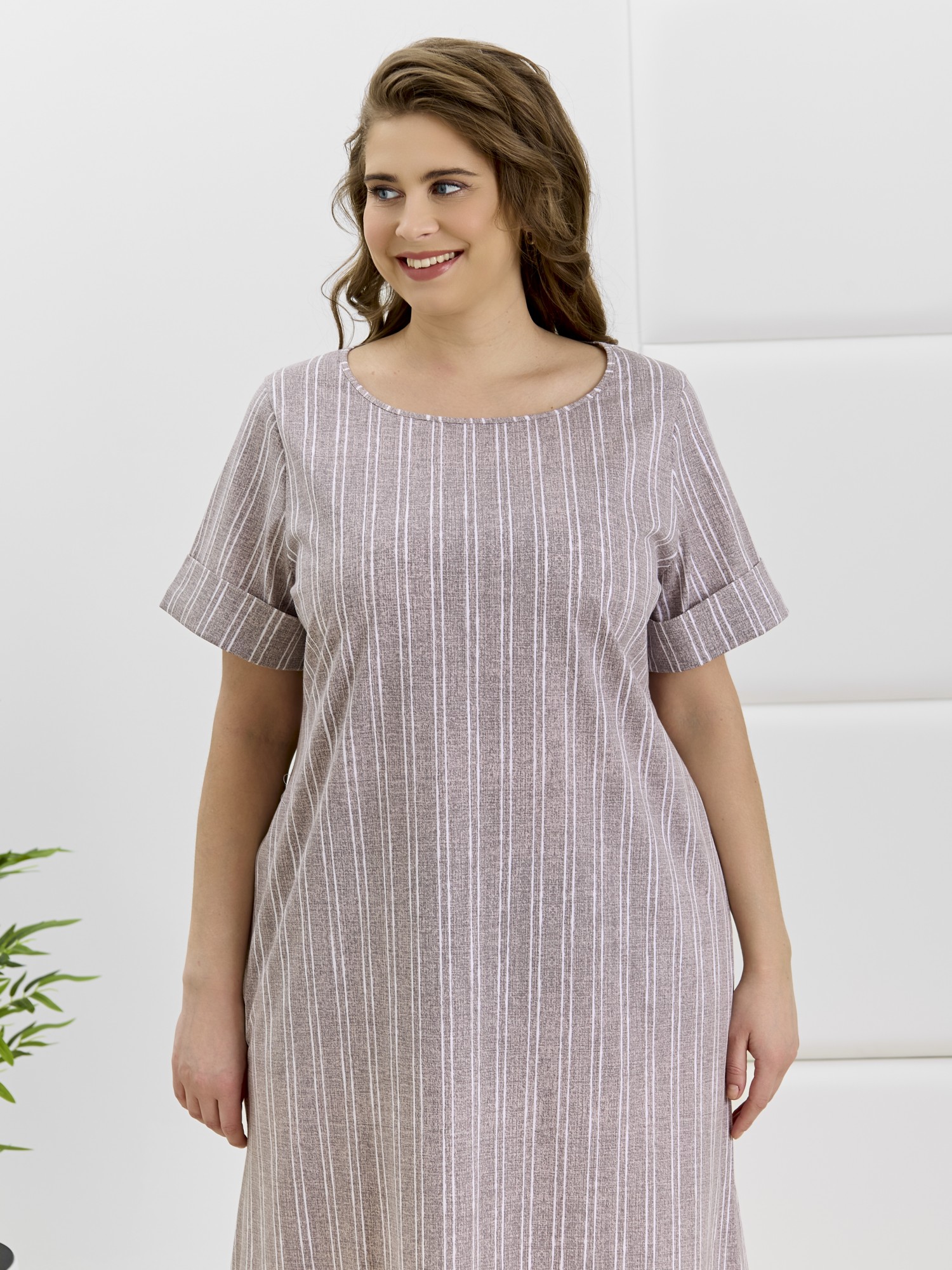 Платье женское из трикотажного полотна «кулирка» с набивным рисунком, длинное, расширенное к низу, с горловиной овальной формы окантованной основным материалом, короткими втачными рукавами, обработанными манжетами. В боковых швах выполнены карманы, в нижней части- боковые разрезы.
