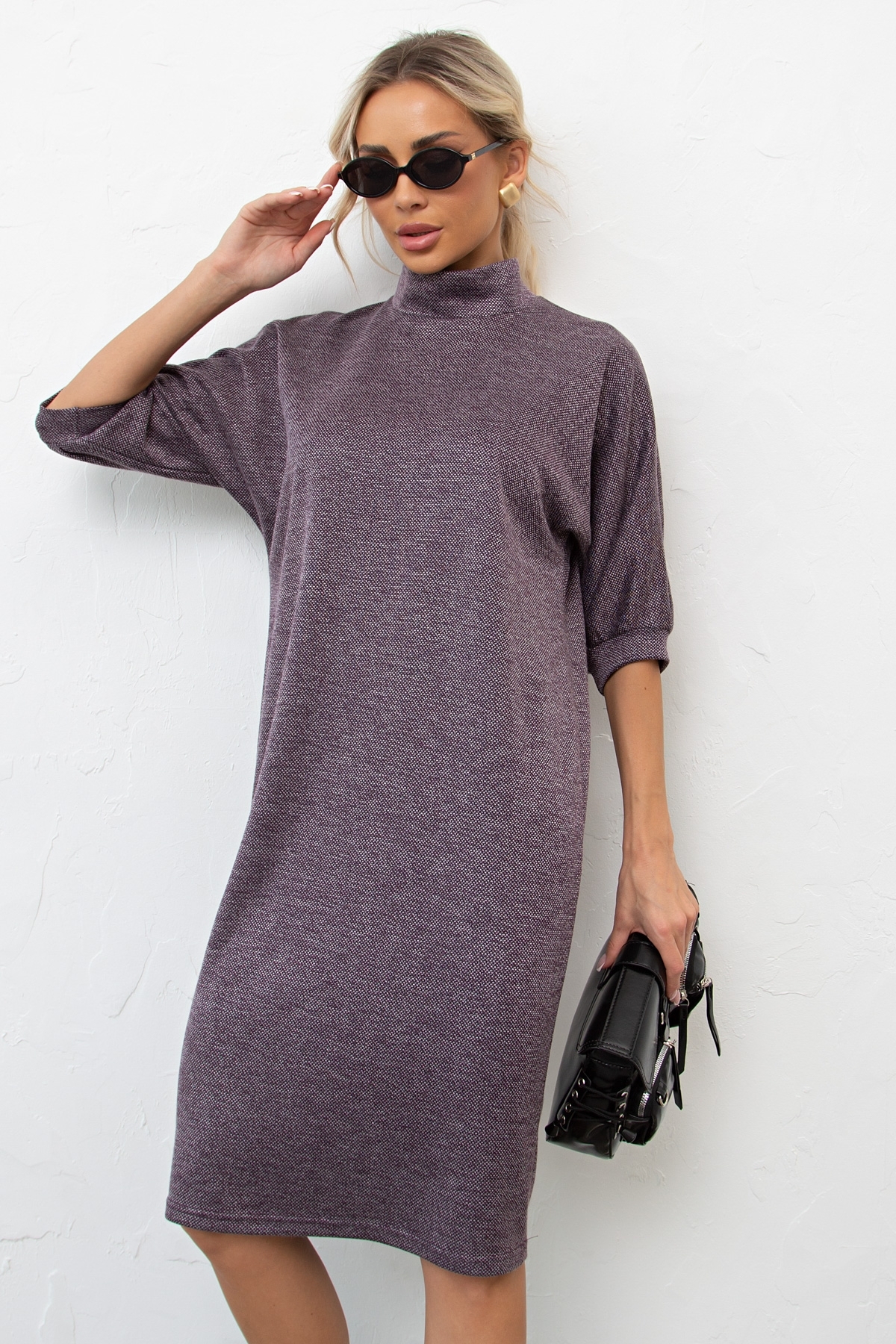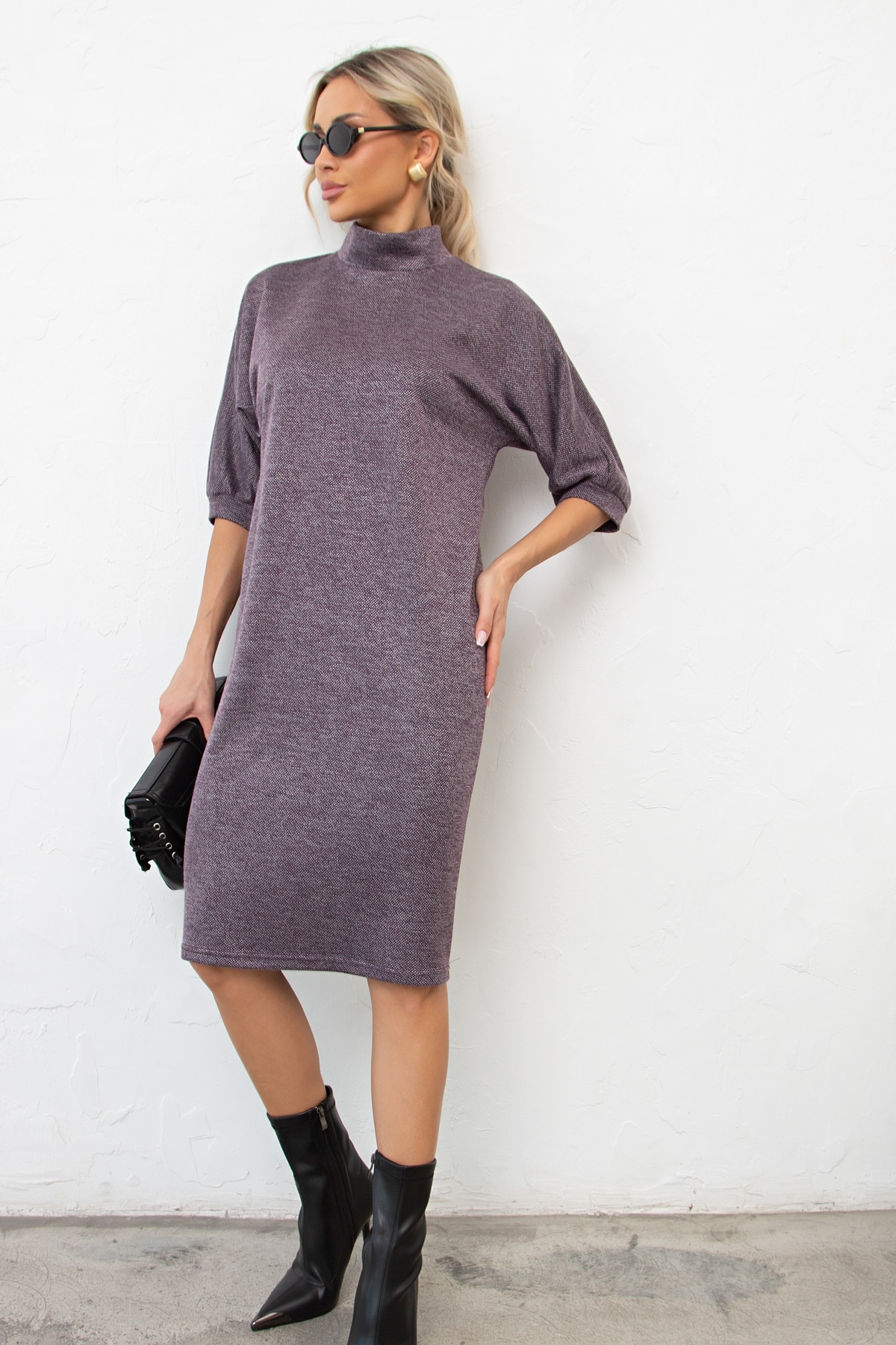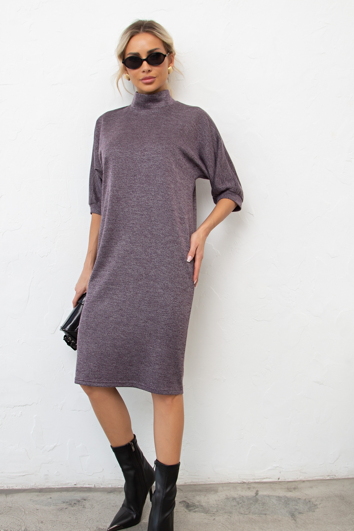 Элегантное платье свободного кроя выполнено из однотонного трикотажного полотна. Короткий рукав - летучая мышь присобрана на манжету. Горловина оформлена воротником - стойка. По среднему шву спинки застежка на потайную ленту - молнию. Низ ровный, без разрезов.
