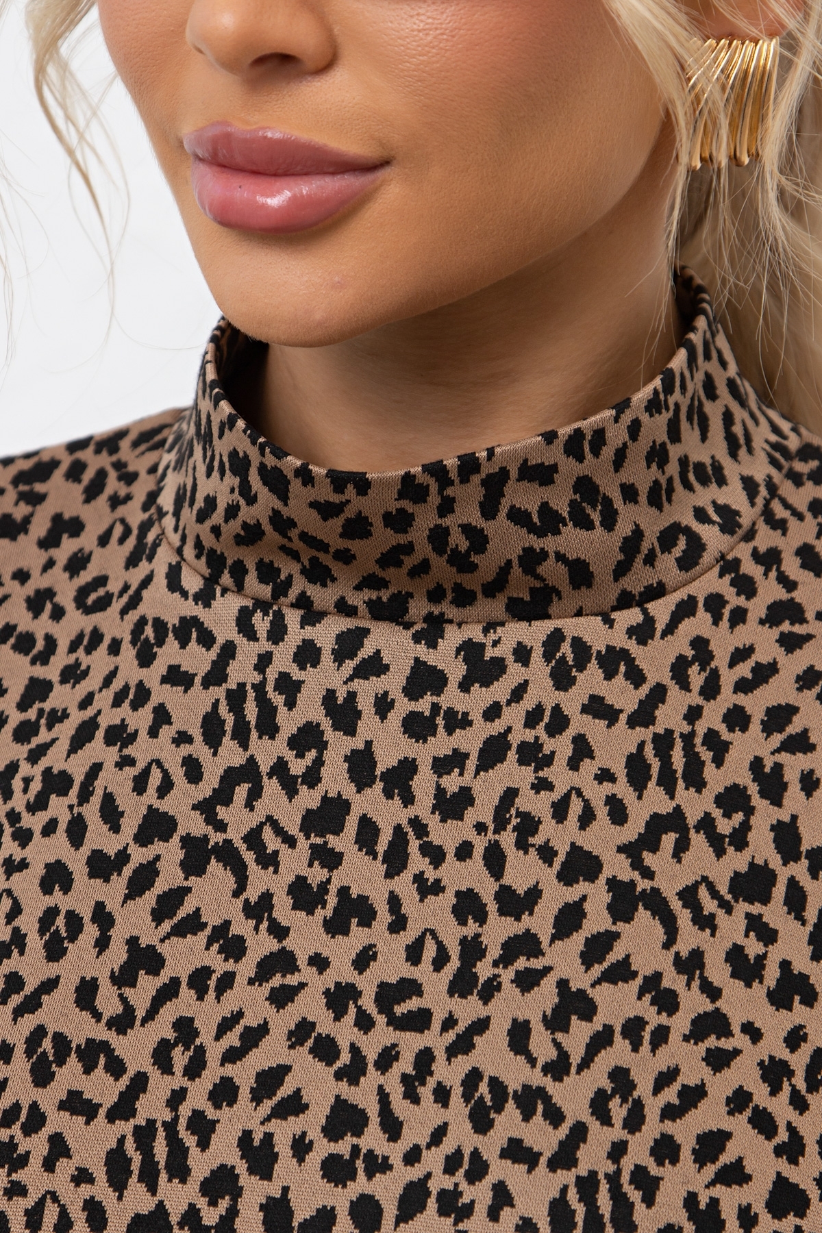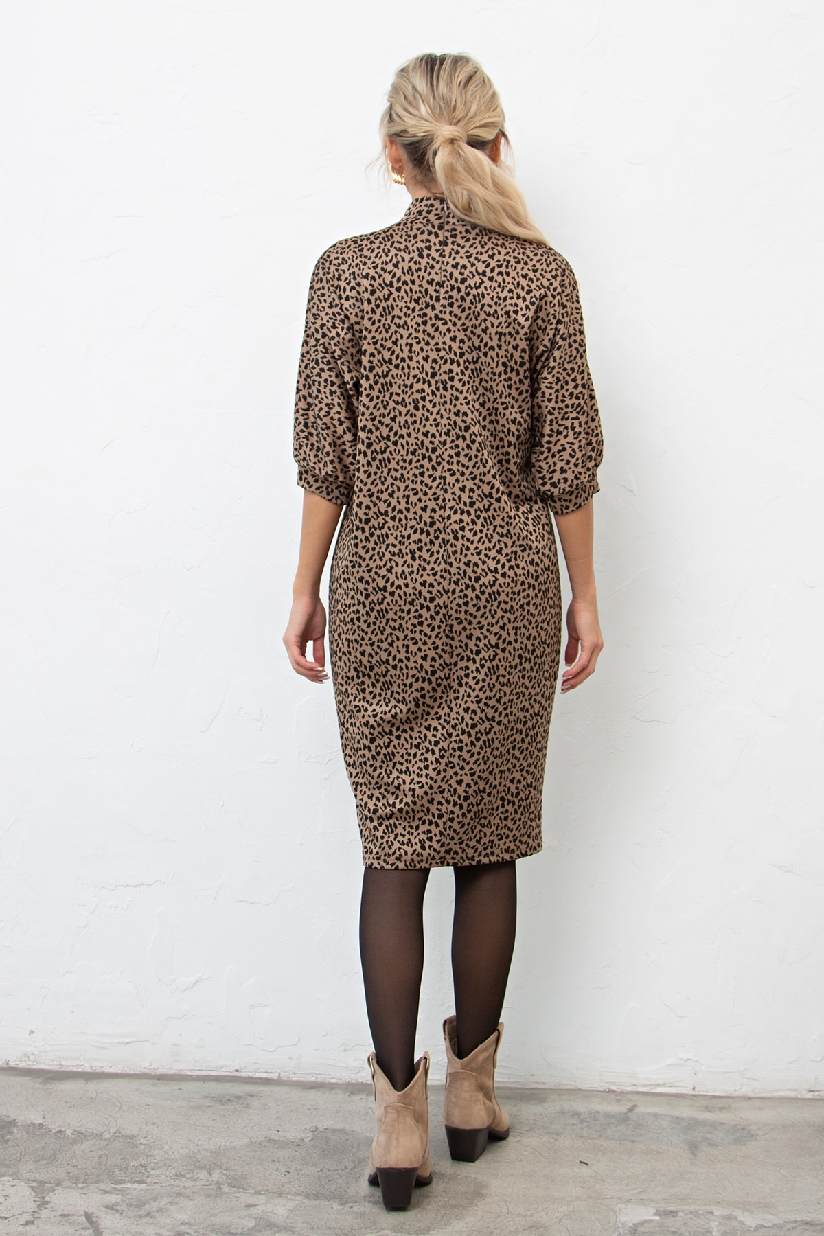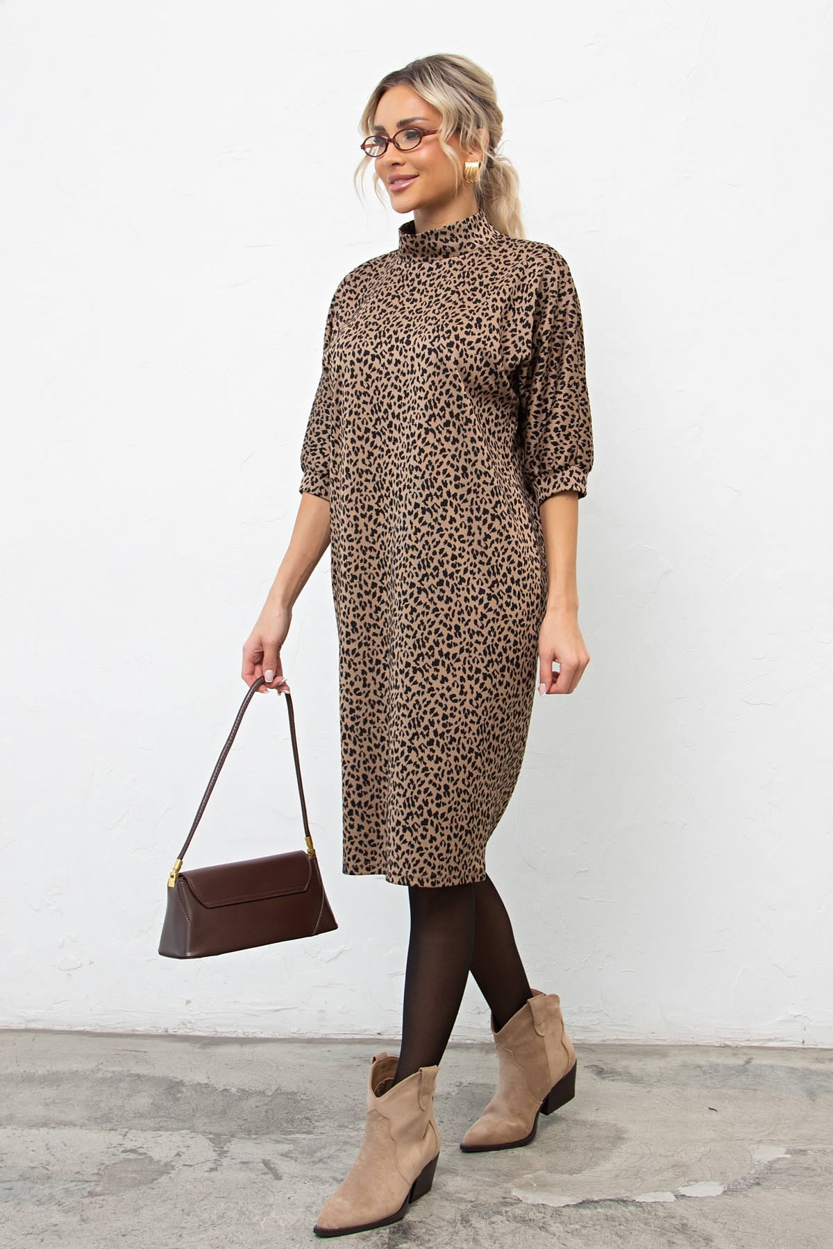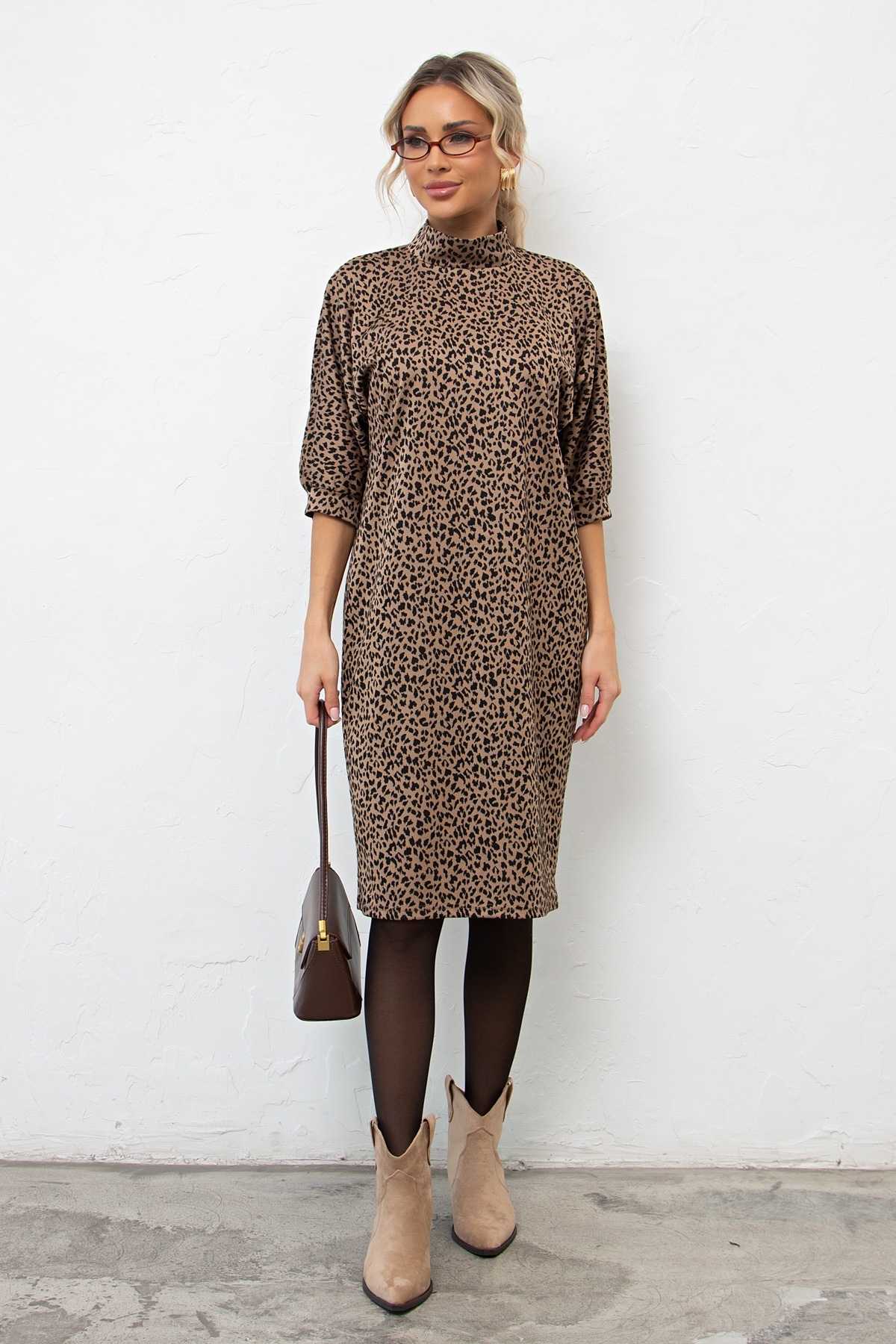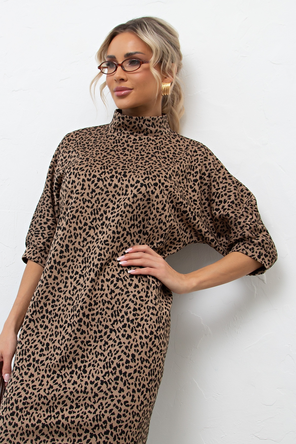 Элегантное платье свободного кроя выполнено из трикотажного полотна с принтом. Короткий рукав - летучая мышь присобрана на манжету. Горловина оформлена воротником - стойка. По среднему шву спинки застежка на потайную ленту - молнию. Низ ровный, без разрезов.