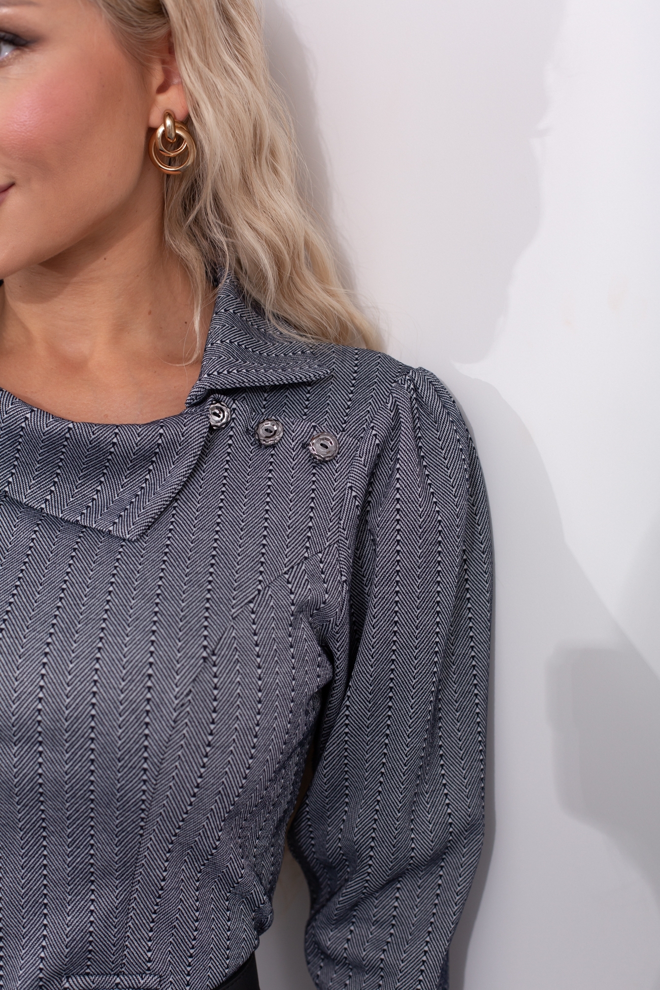 Элегантное платье прилегающего силуэта из трикотажного полотна. Втачные рукава длинной 3/4. Горловина оформлена отложным воротником - хомут, переходящим в планку на петли и пуговицы. Модель отрезная по линии талии. Передняя и задняя половинки оформлены фигурными шлевками. Низ ровный, без разрезов. Модель прекрасно дополнит ваш гардероб.