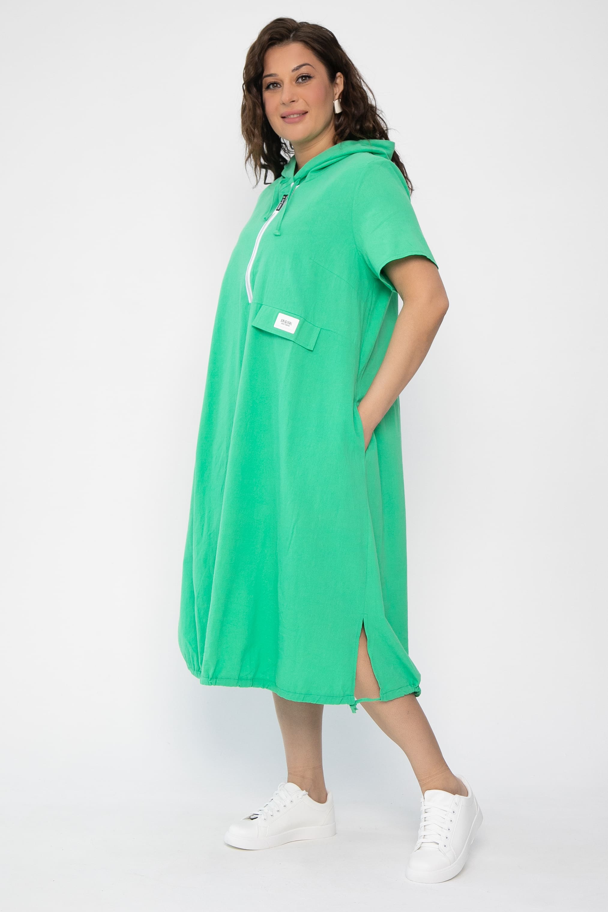 Свободный крой платья не сковывает движений, что особенно важно для тех кто ведет активный образ жизни. Его универсальность позволяет надевать его как на работу, так и для прогулки в парке. По низу платье регулируется кулиской. Карманы расположены сбоку.