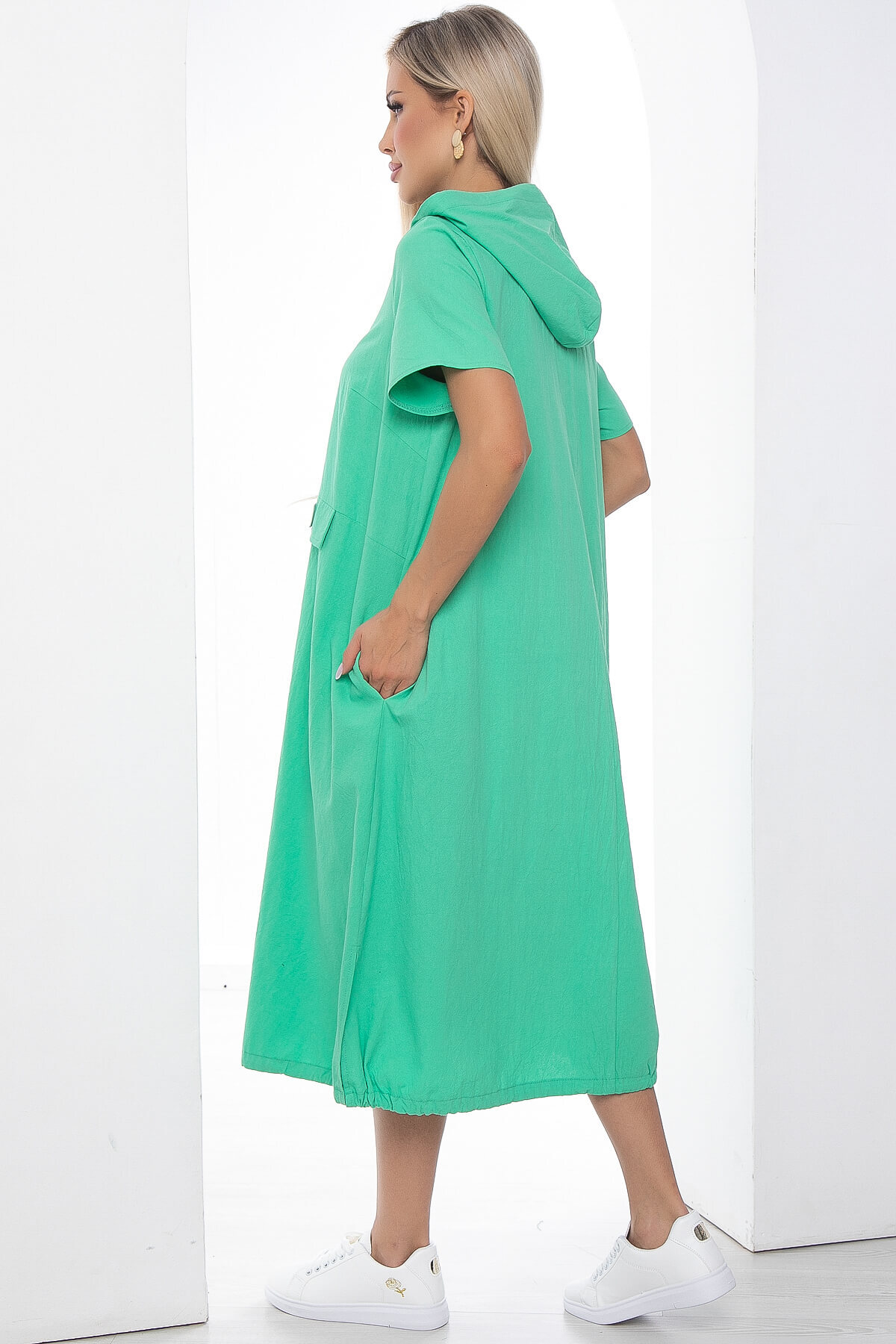 Свободный крой платья не сковывает движений, что особенно важно для тех кто ведет активный образ жизни. Его универсальность позволяет надевать его как на работу, так и для прогулки в парке. По низу платье регулируется кулиской. Карманы расположены сбоку.