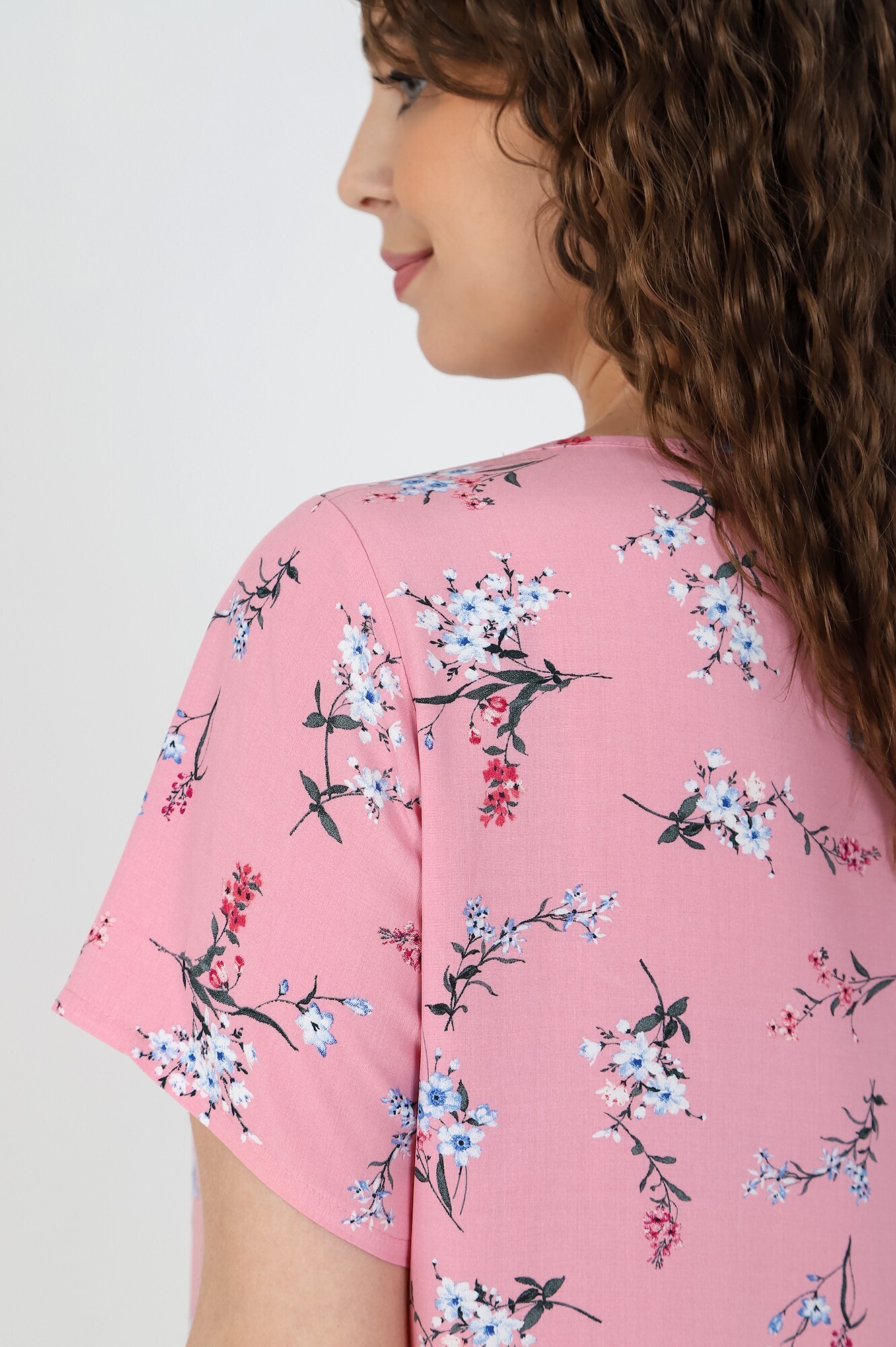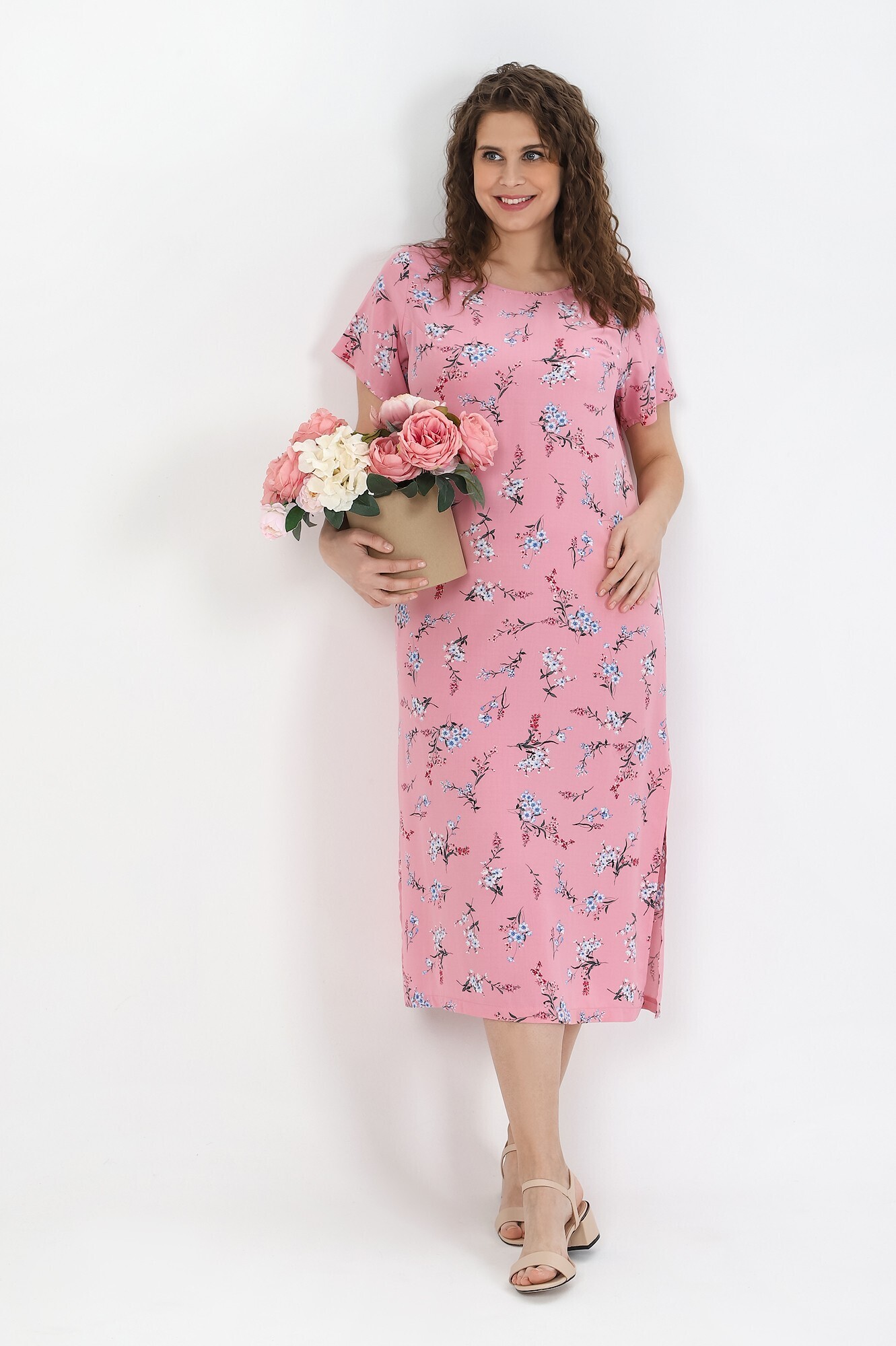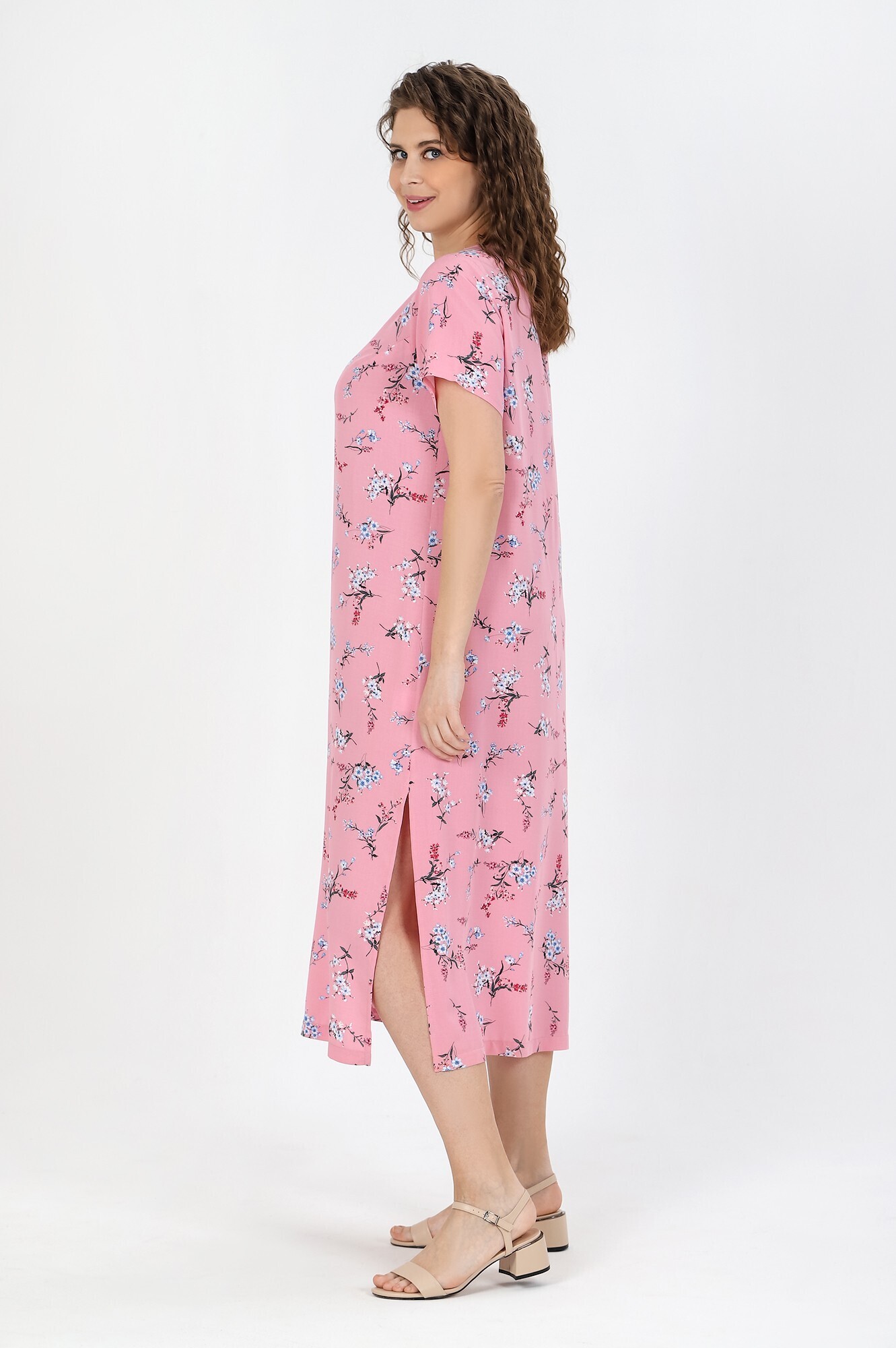 Платье женское из штапельной плательной ткани с набивным рисунком полуприлегающего силуэта, с короткими втачными рукавами, горловиной овальной формы, окантованной основным материалом. В области груди обработаны две вытачки, в боковых швах выполнены разрезы.