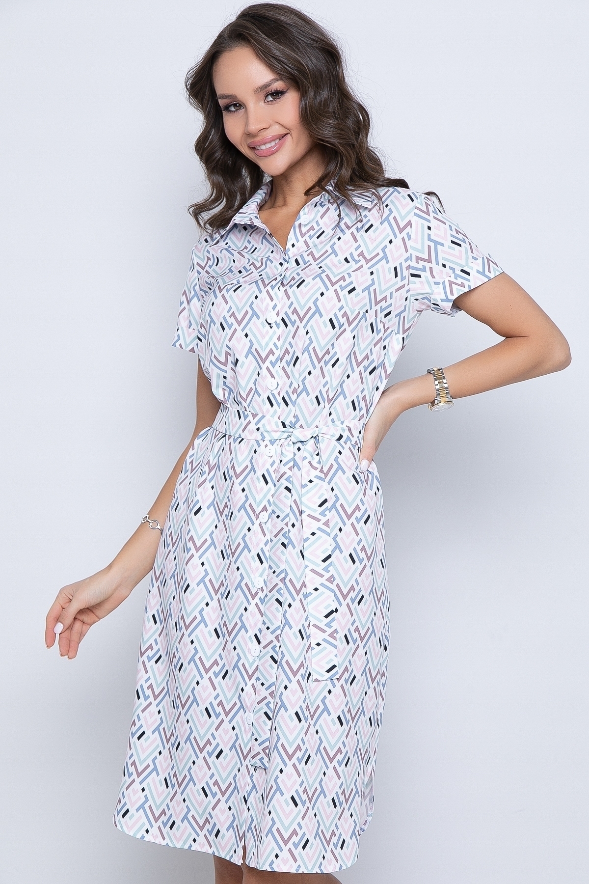 Модель выполнена из лёгкой плательной ткани. 97% полиэстер, 3% эластан Модно, стильно, дерзко! Оригинальный принт- ТРЕНД 2024 года! Платье-рубашка из легкой ткани дарит высший уровень комфорта. Воротничок на стойке, по переду сделаны вытачки на грудь. Платье застёгивается спереди на петли-пуговицы. По спинке сделаны две вытачки приталивания. Рукав короткий, втачной, с манжетом. В области талии и бёдер свободного прилегания. Платье дополняется поясом из основной ткани. Длина изделия: 44р-101см, 46р-102см,48р-102см,50р-103см,52р-103см Длина рукава на всех размерах 19см