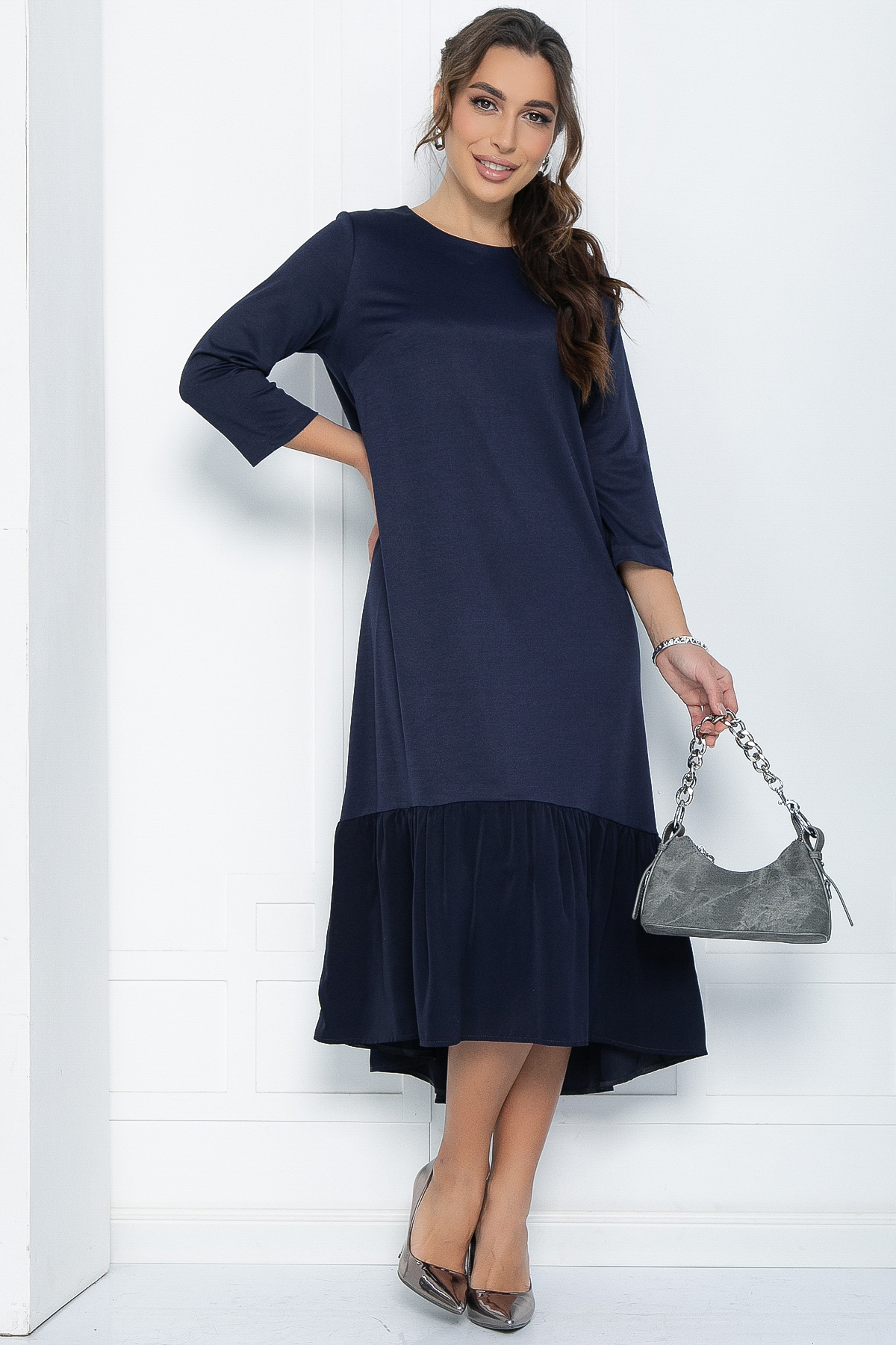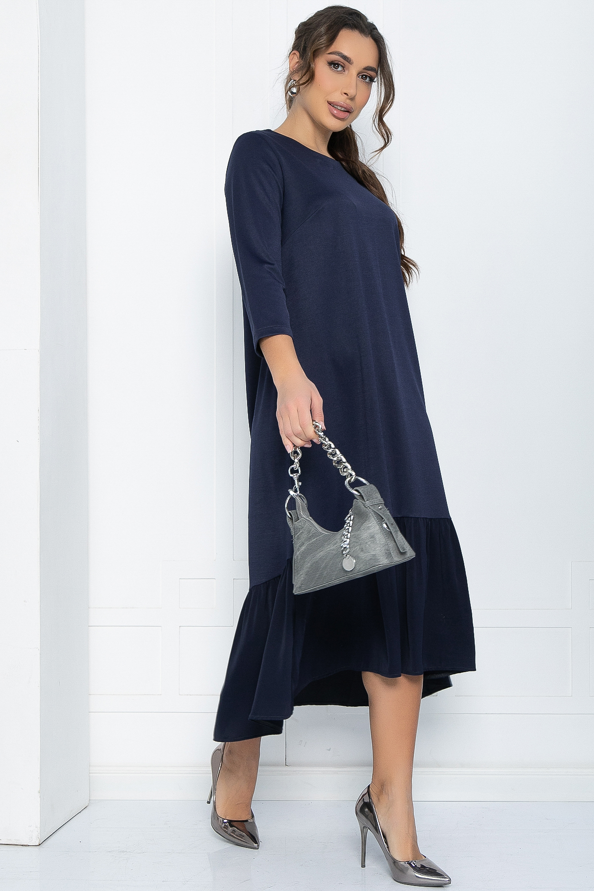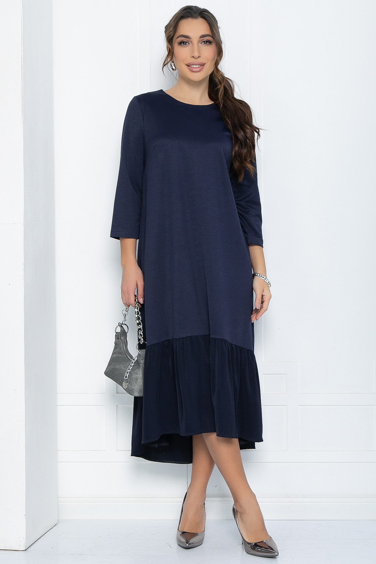 Очаровательное повседневное платье свободного кроя из эластичной трикотажной ткани с асимметричным подолом не сковывает движения, а длина миди визуально вытягивает силуэт и делает фигуру стройнее.