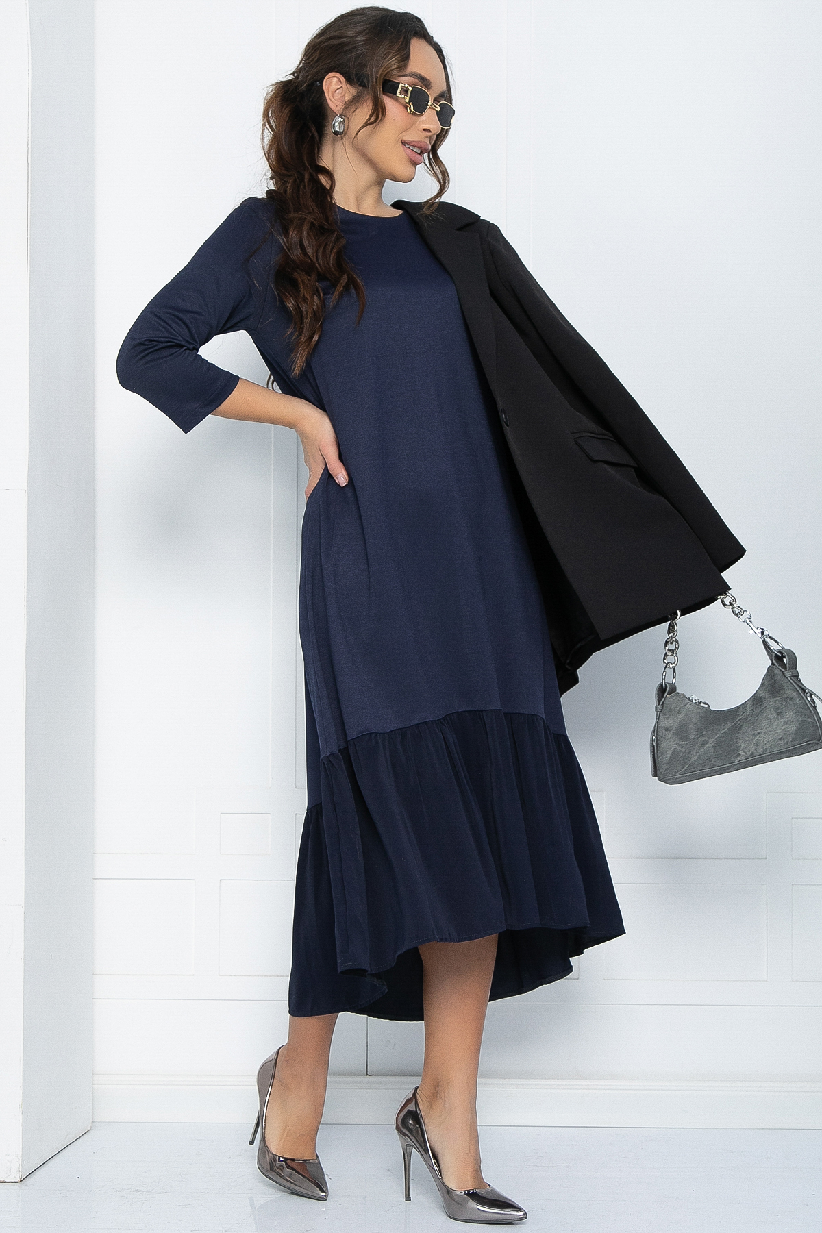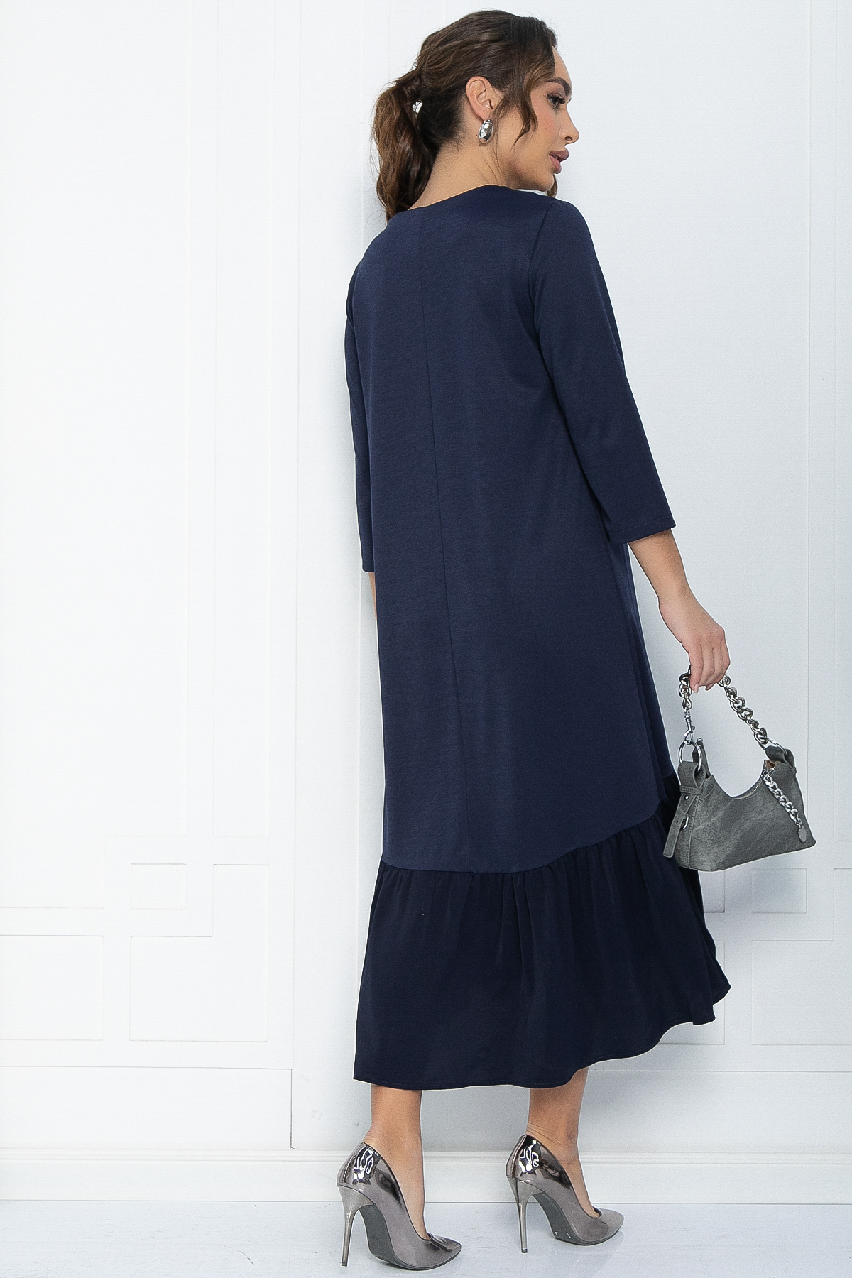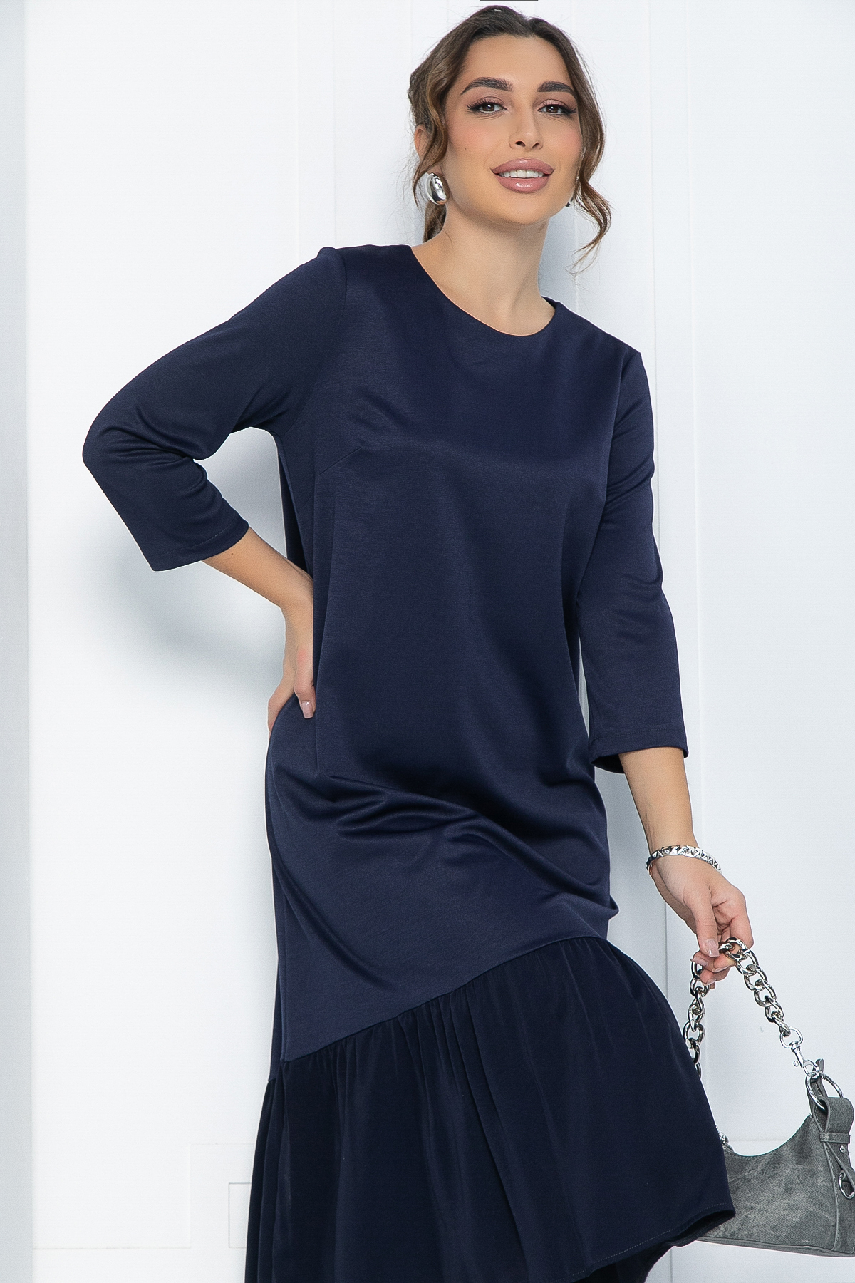 Очаровательное повседневное платье свободного кроя из эластичной трикотажной ткани с асимметричным подолом не сковывает движения, а длина миди визуально вытягивает силуэт и делает фигуру стройнее.