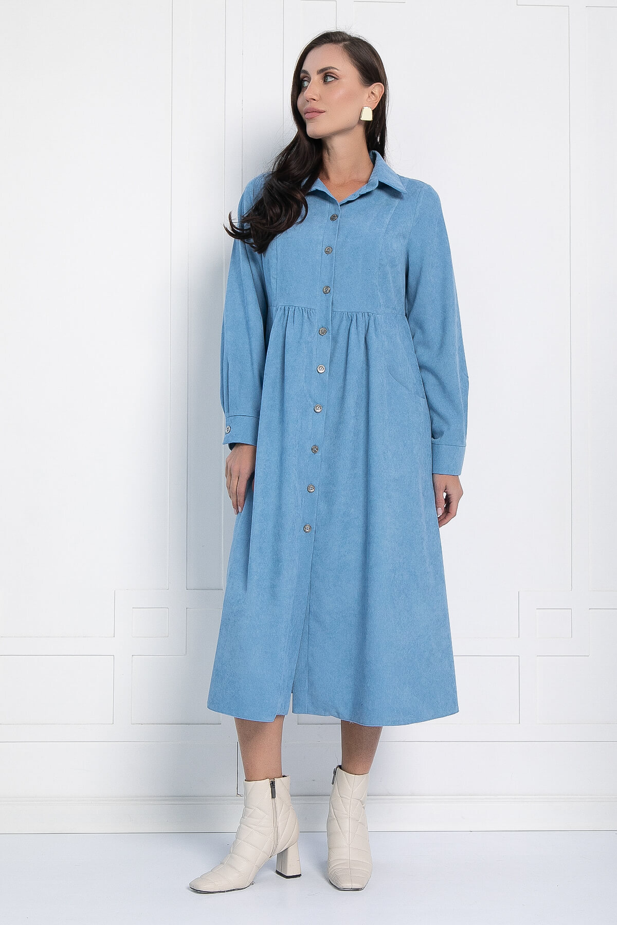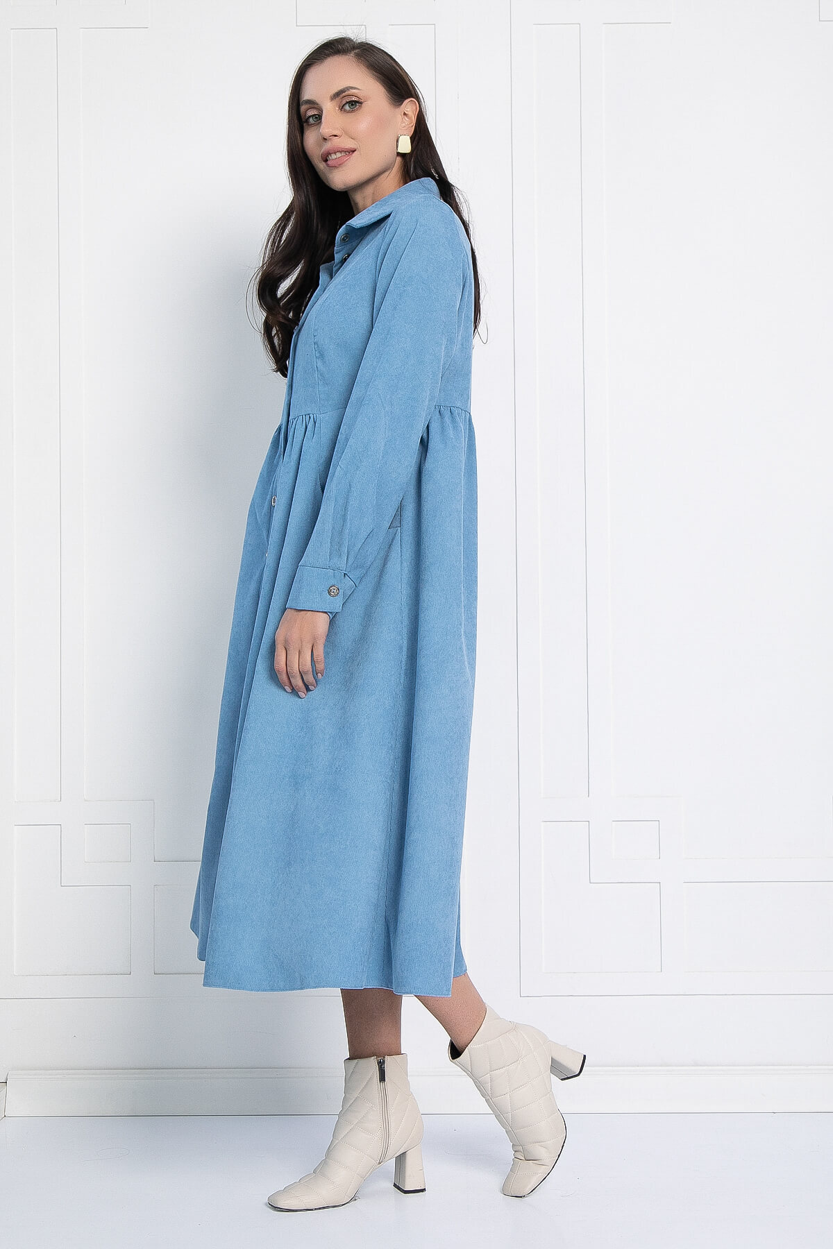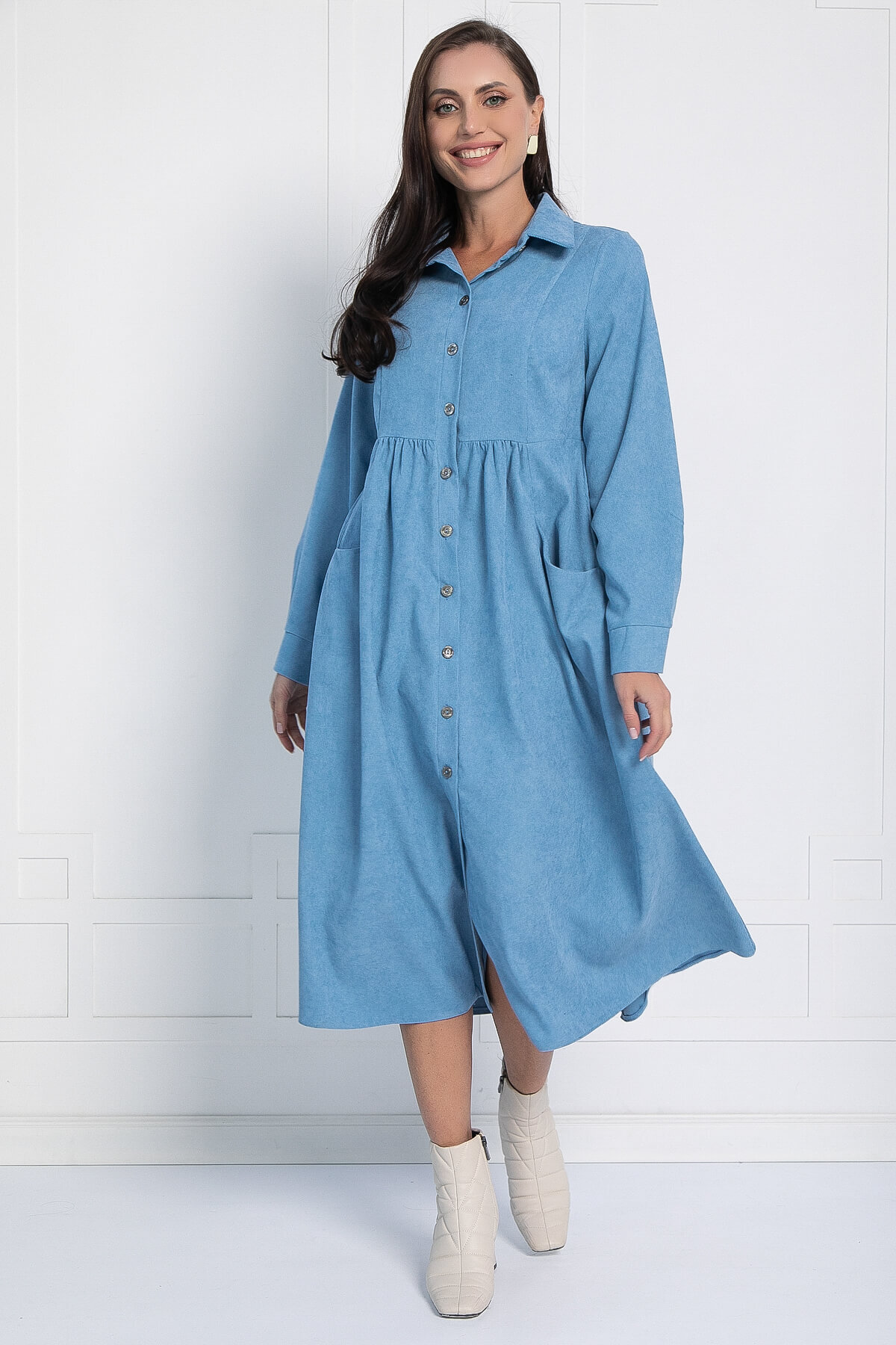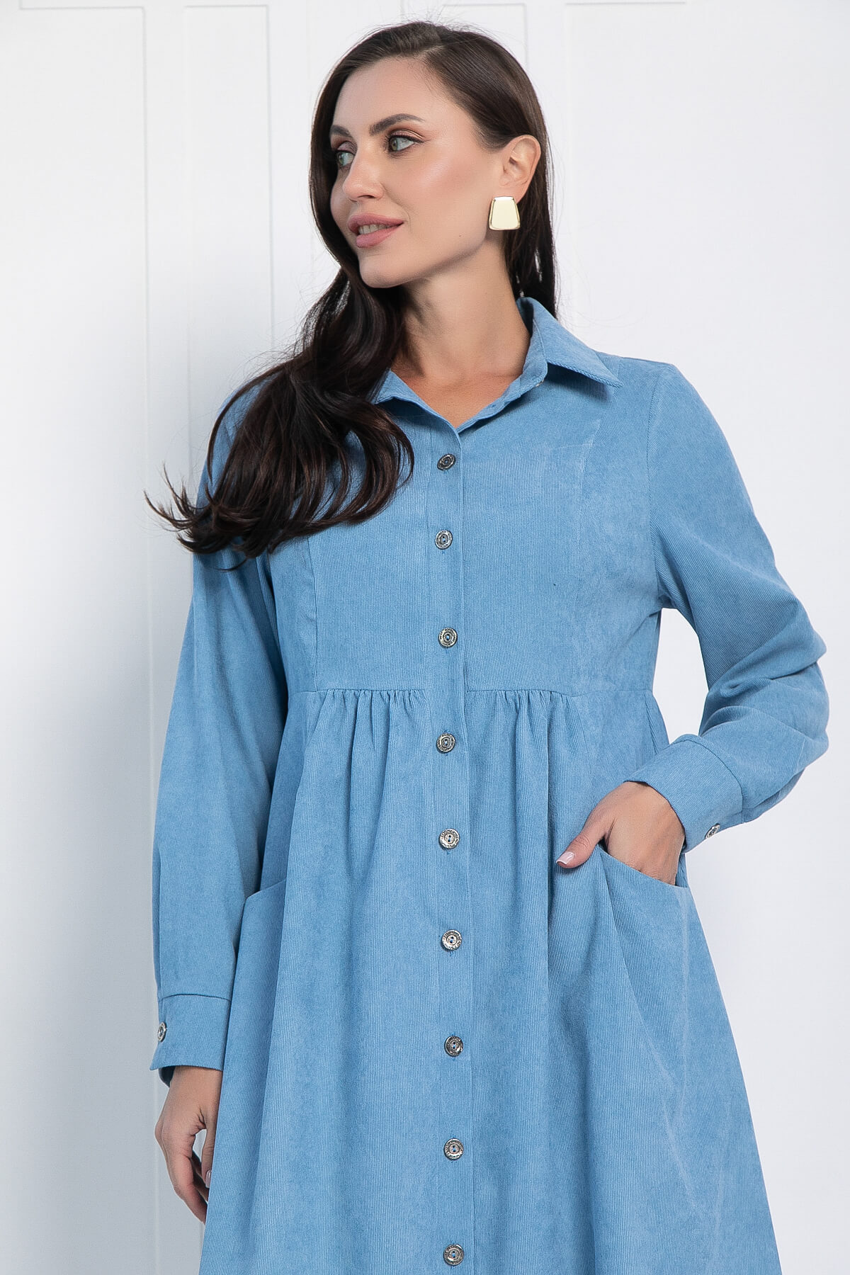 Платье-рубашка из вельвета — это прекрасный вариант для создания повседневных образов. Оно выполнено с воротником и рукавами рубашечного типа, что придаёт ему элегантный вид. Пуговицы на планке и карманы с акцентом добавляют функциональности и стиля. Завышенная талия и присобранная юбка создают очаровательный силуэт.