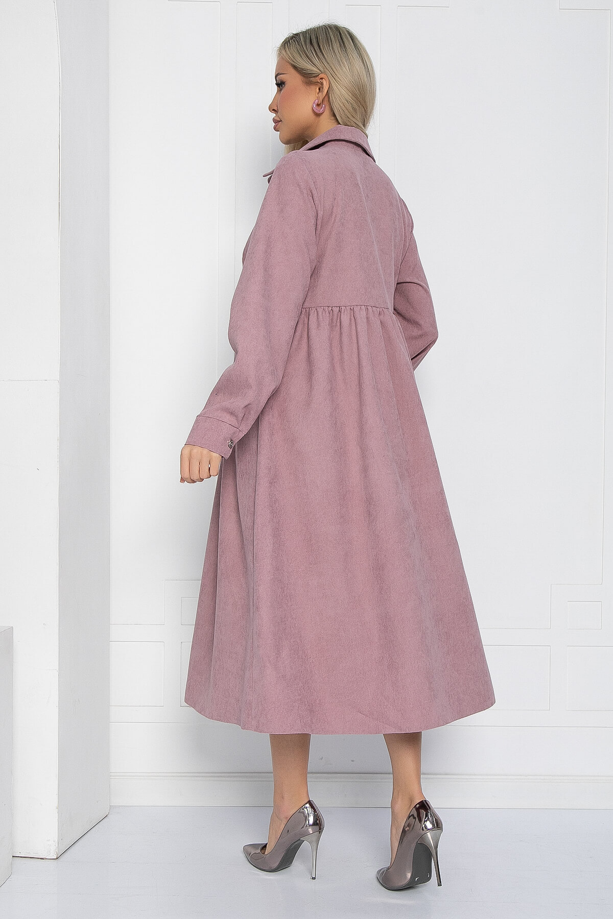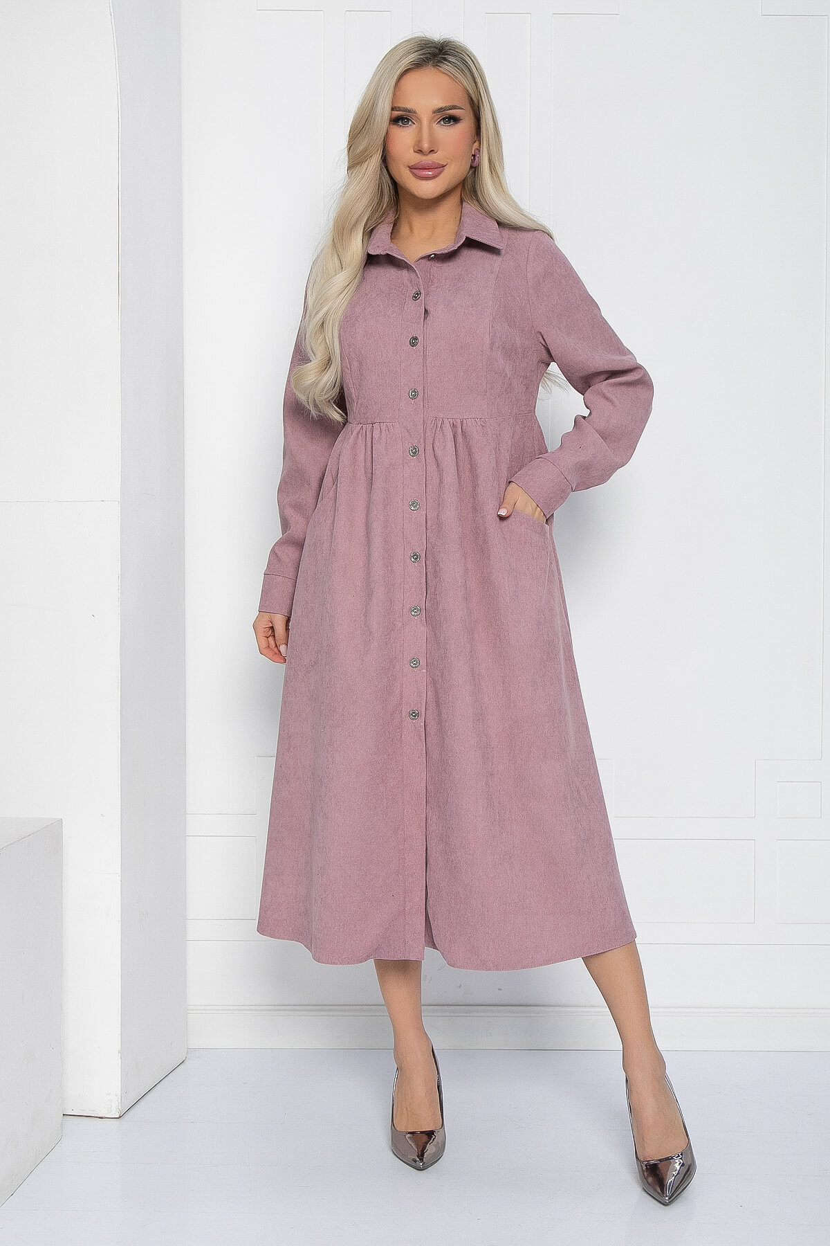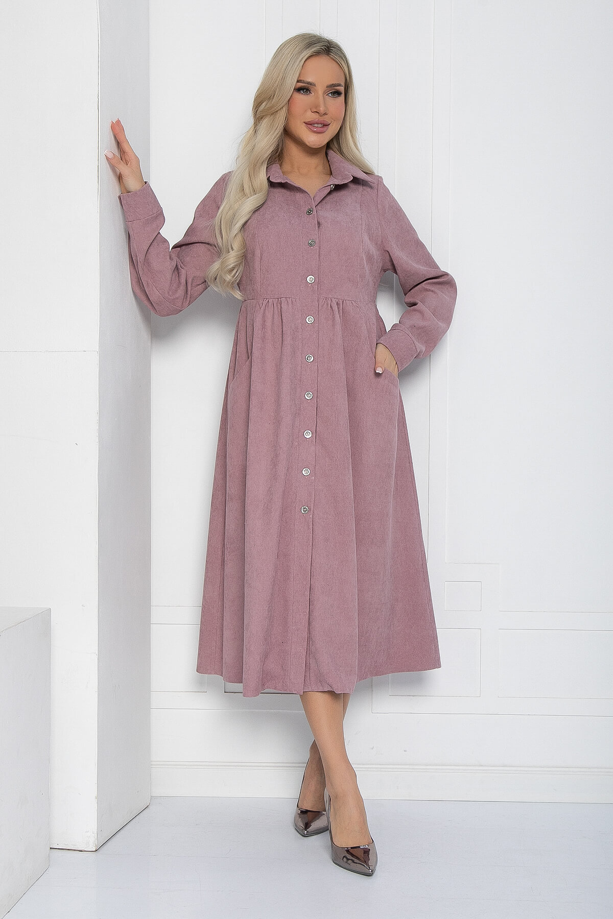 Платье-рубашка из вельвета — это прекрасный вариант для создания повседневных образов. Оно выполнено с воротником и рукавами рубашечного типа, что придаёт ему элегантный вид. Пуговицы на планке и карманы с акцентом добавляют функциональности и стиля. Завышенная талия и присобранная юбка создают очаровательный силуэт.