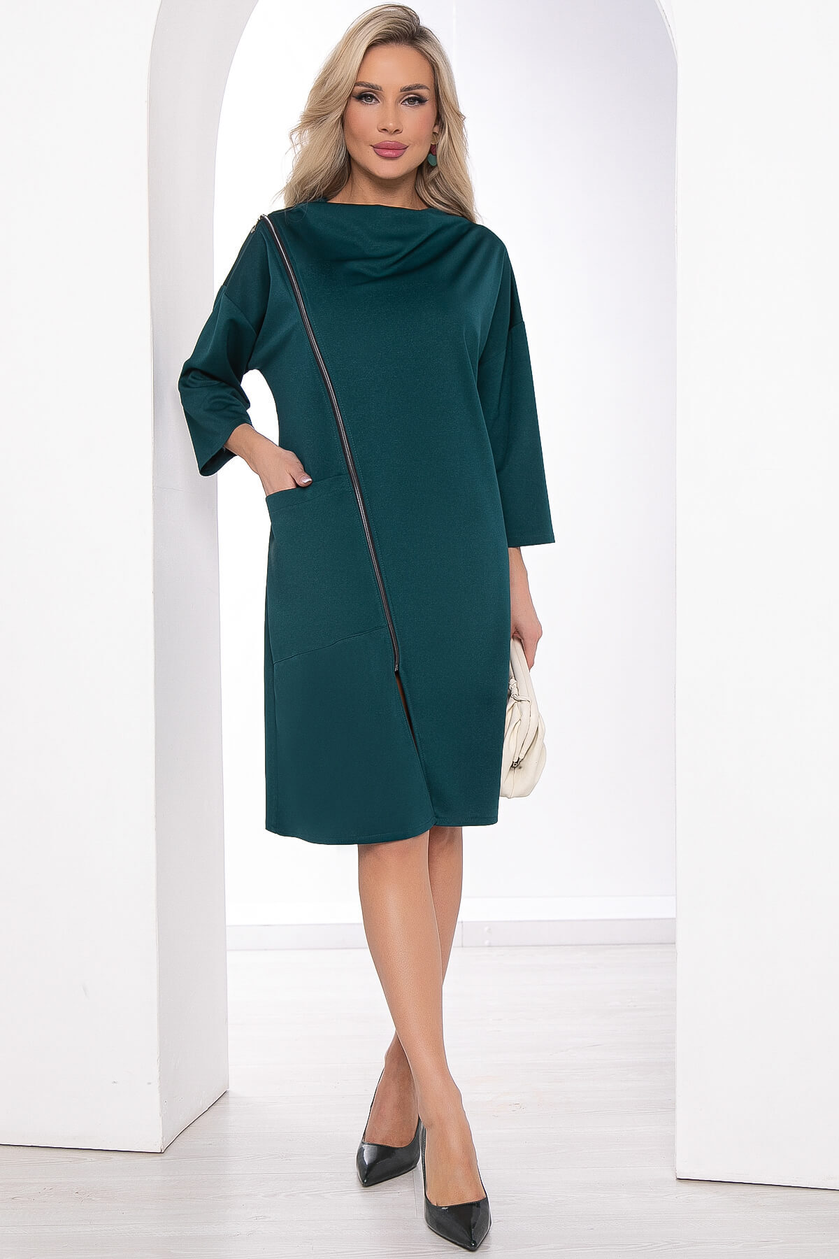 Трикотажное платье свободного кроя с оригинальной косой застежкой-молнией по всей длине. Модель подразумевает свободную посадку. Рукав цельнокроеный 7/8. Женственная округлая горловина и разрез на платье придают образу элегантности. Идеальный вариант для похода в кино или в театр, а также и для деловых встреч.