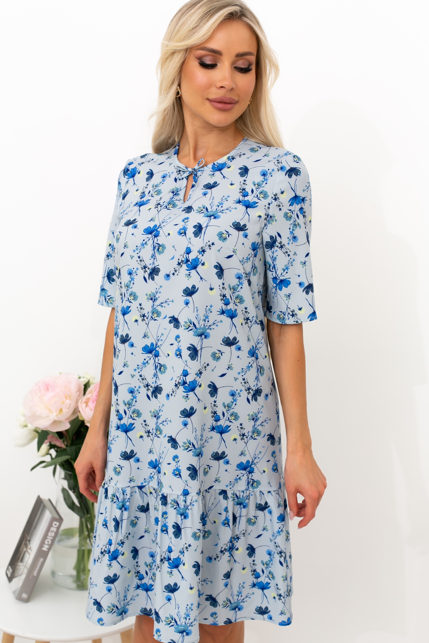 Летнее платье прямого силуэта. Округлая горловина отделана узкой бейкой переходящей в завязки. Короткий втачной рукав. По низу широкая рюша на сборке. Низ ровный, без разрезов.