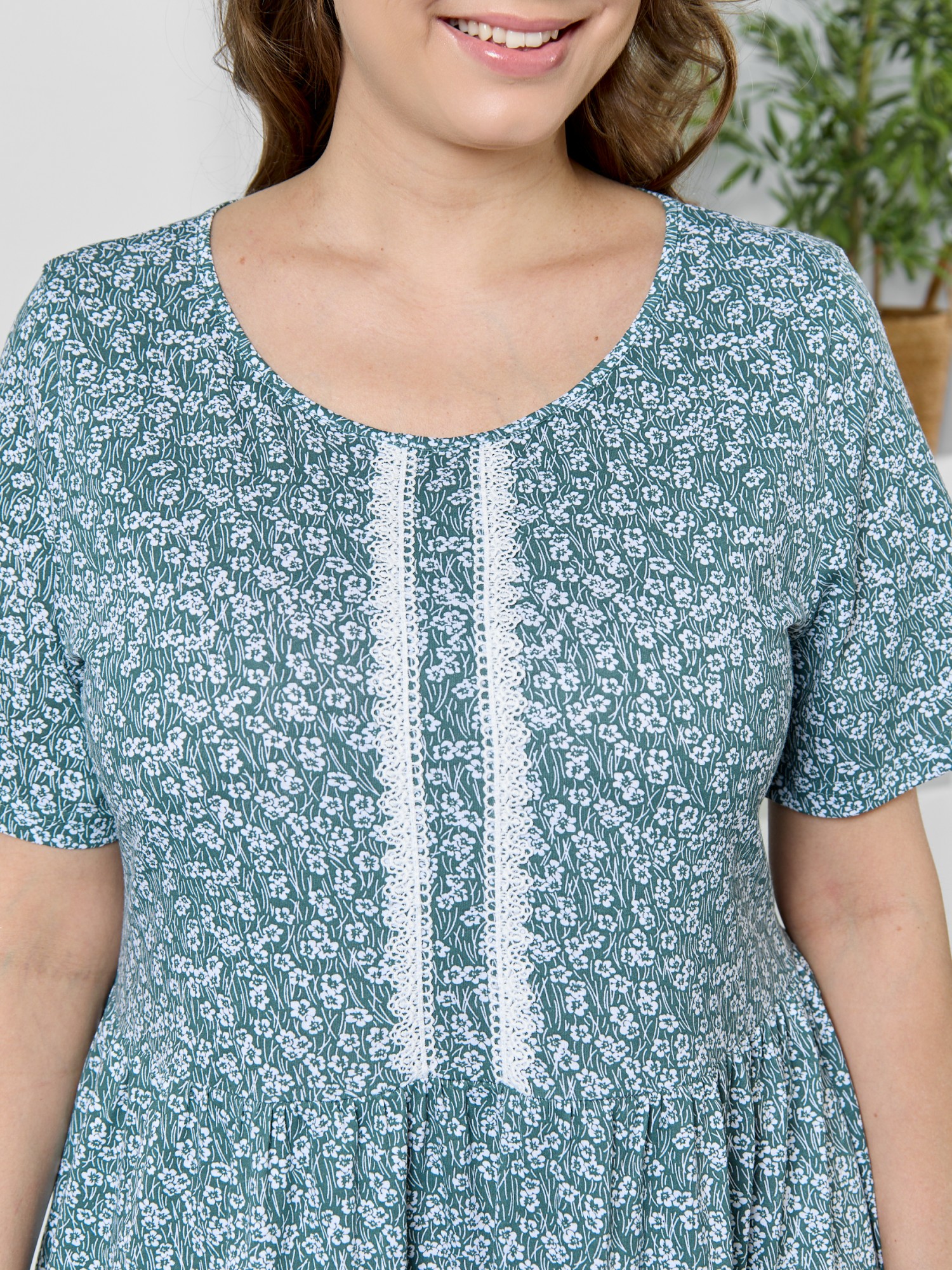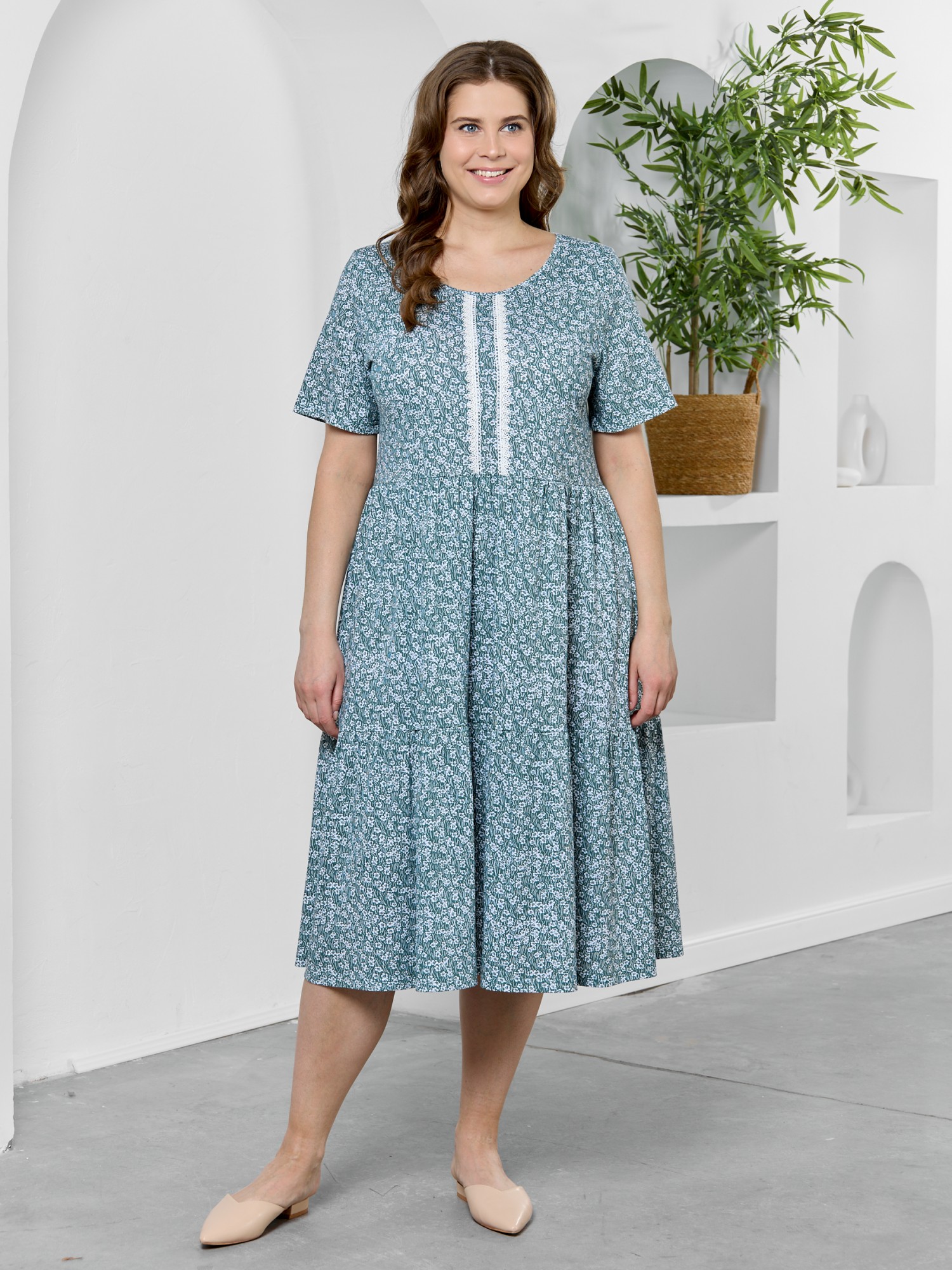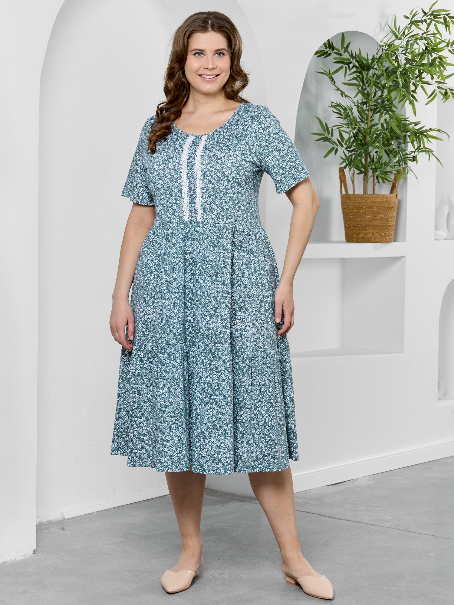 Платье женское из трикотажного полотна "кулирка" с набивным рисунком, свободного кроя, отрезное по линии талии, с короткими втачными рукавами, горловиной овальной формы окантованной основным материалом. По центру полочки двумя параллельными линиями настрочено декоративное кружево контрастного цвета. Юбка – из двух ярусов, каждый из которых присборен по шву соединения с верхней деталью.