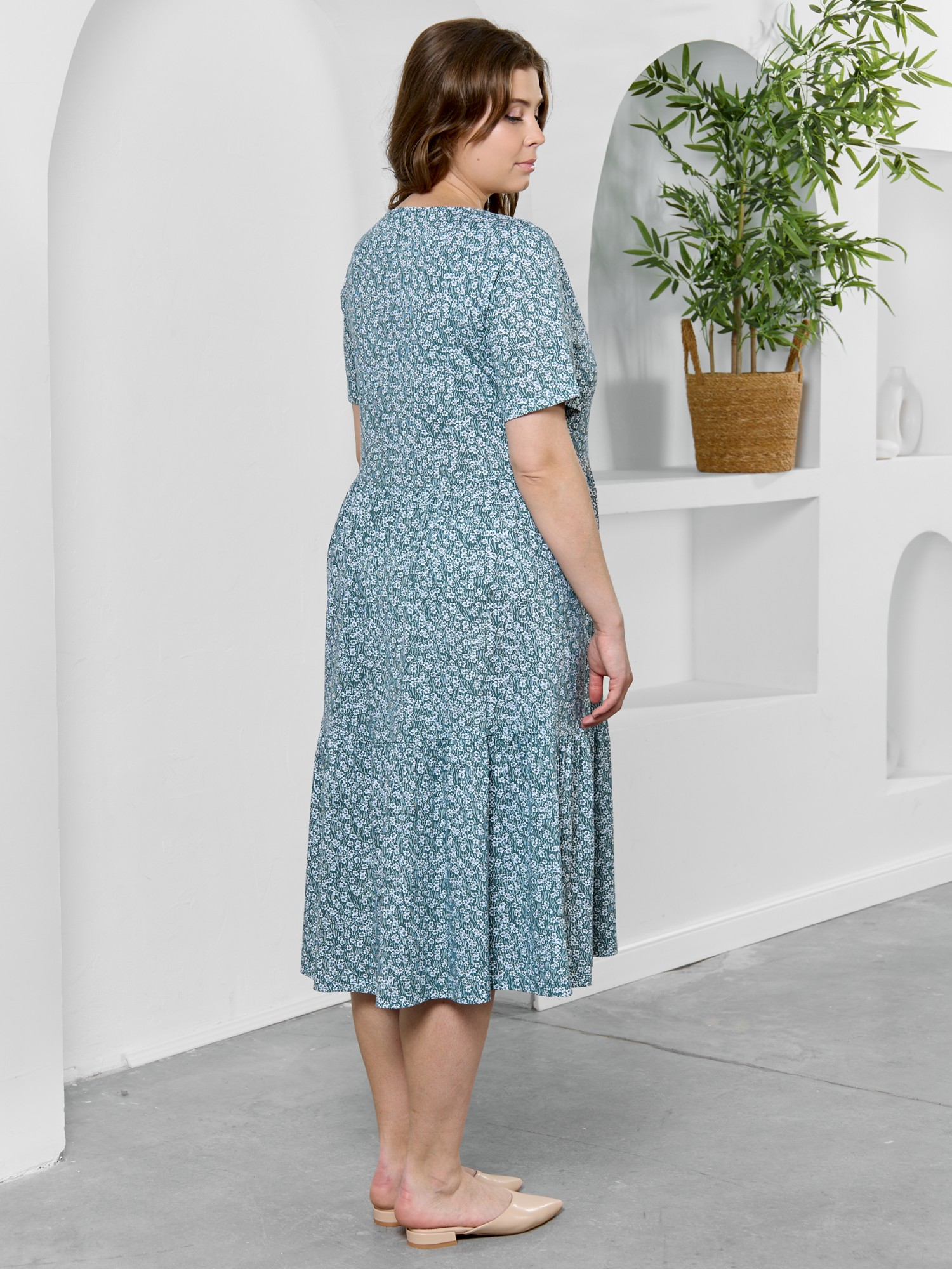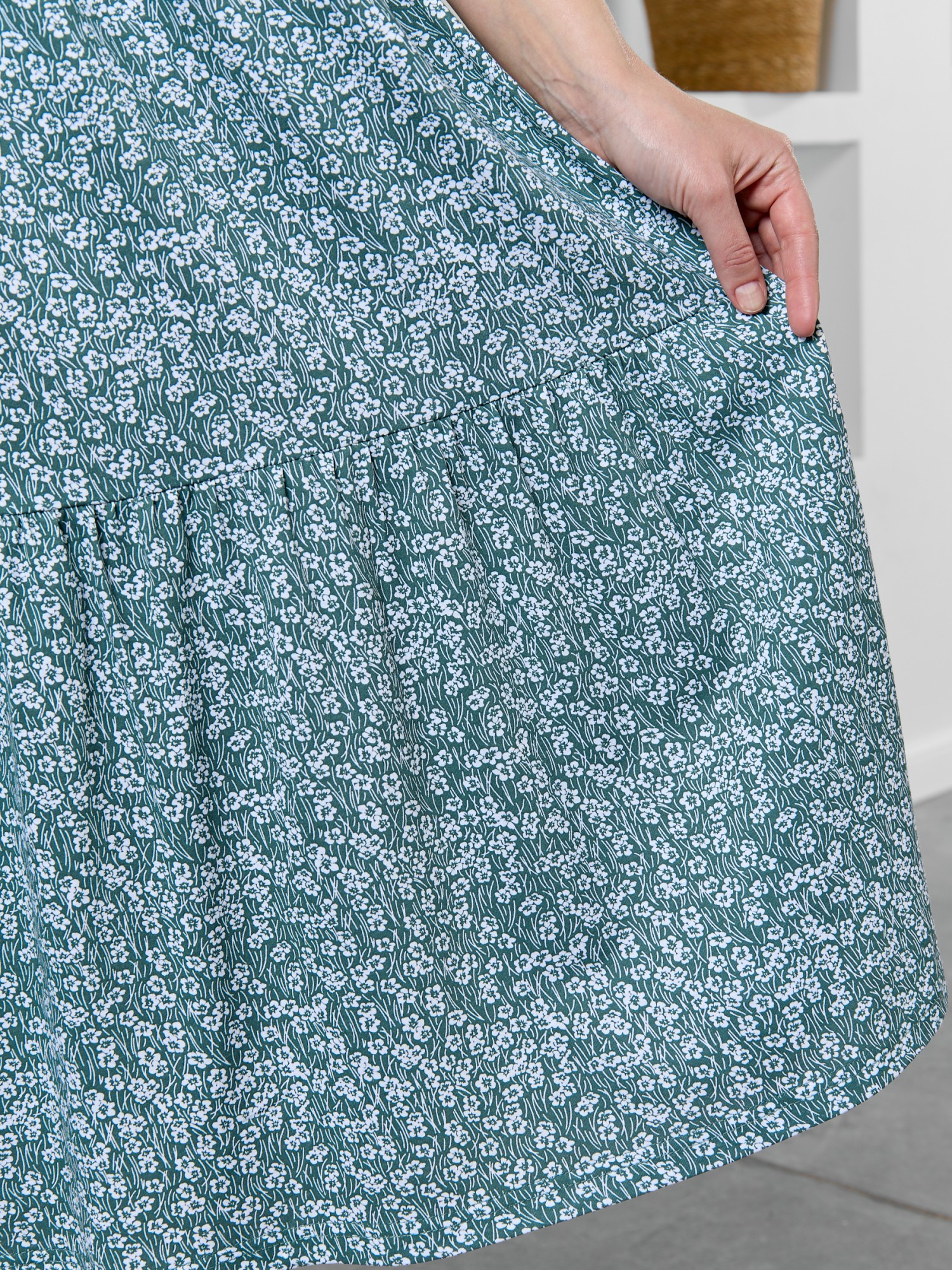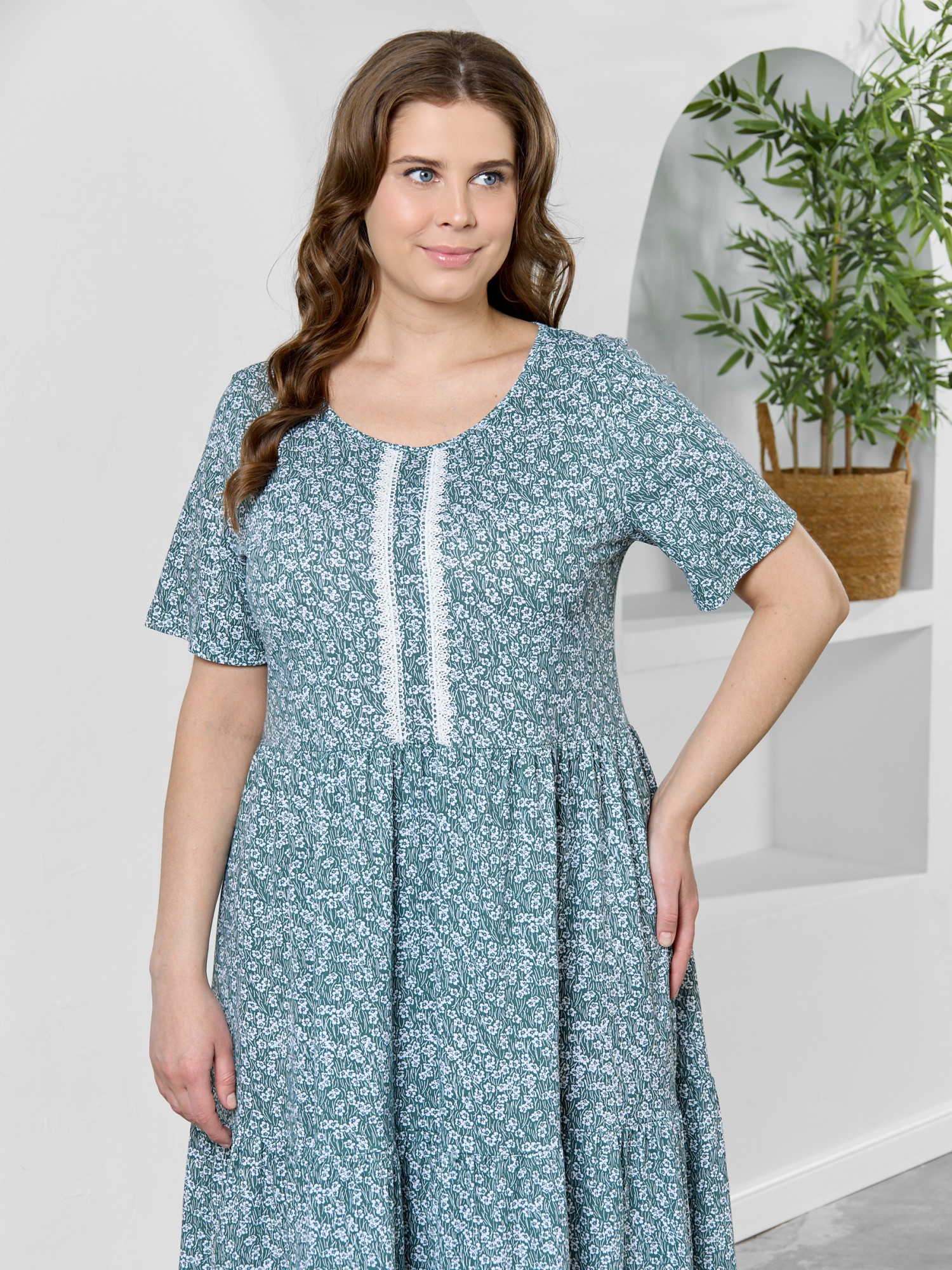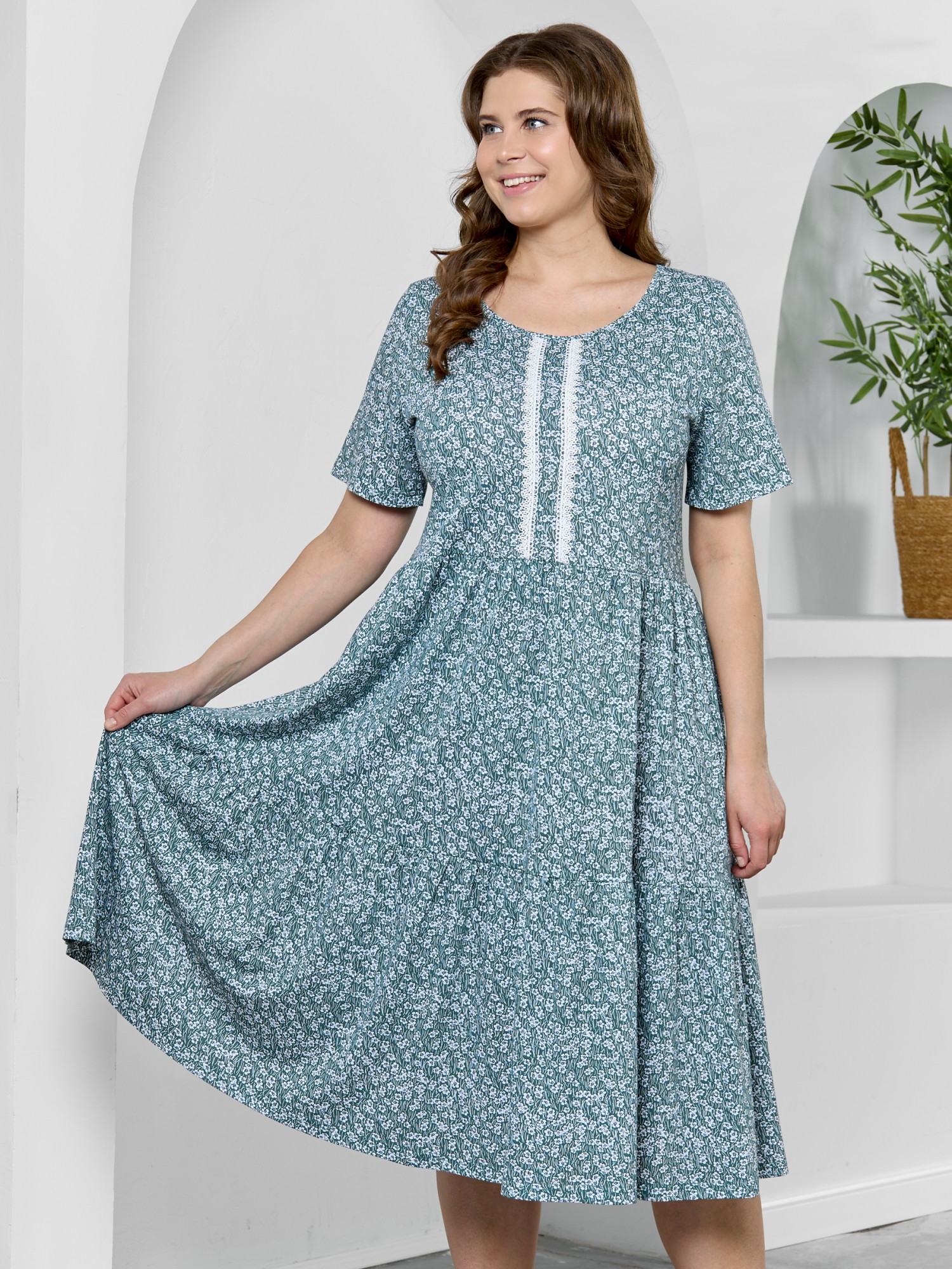 Платье женское из трикотажного полотна "кулирка" с набивным рисунком, свободного кроя, отрезное по линии талии, с короткими втачными рукавами, горловиной овальной формы окантованной основным материалом. По центру полочки двумя параллельными линиями настрочено декоративное кружево контрастного цвета. Юбка – из двух ярусов, каждый из которых присборен по шву соединения с верхней деталью.