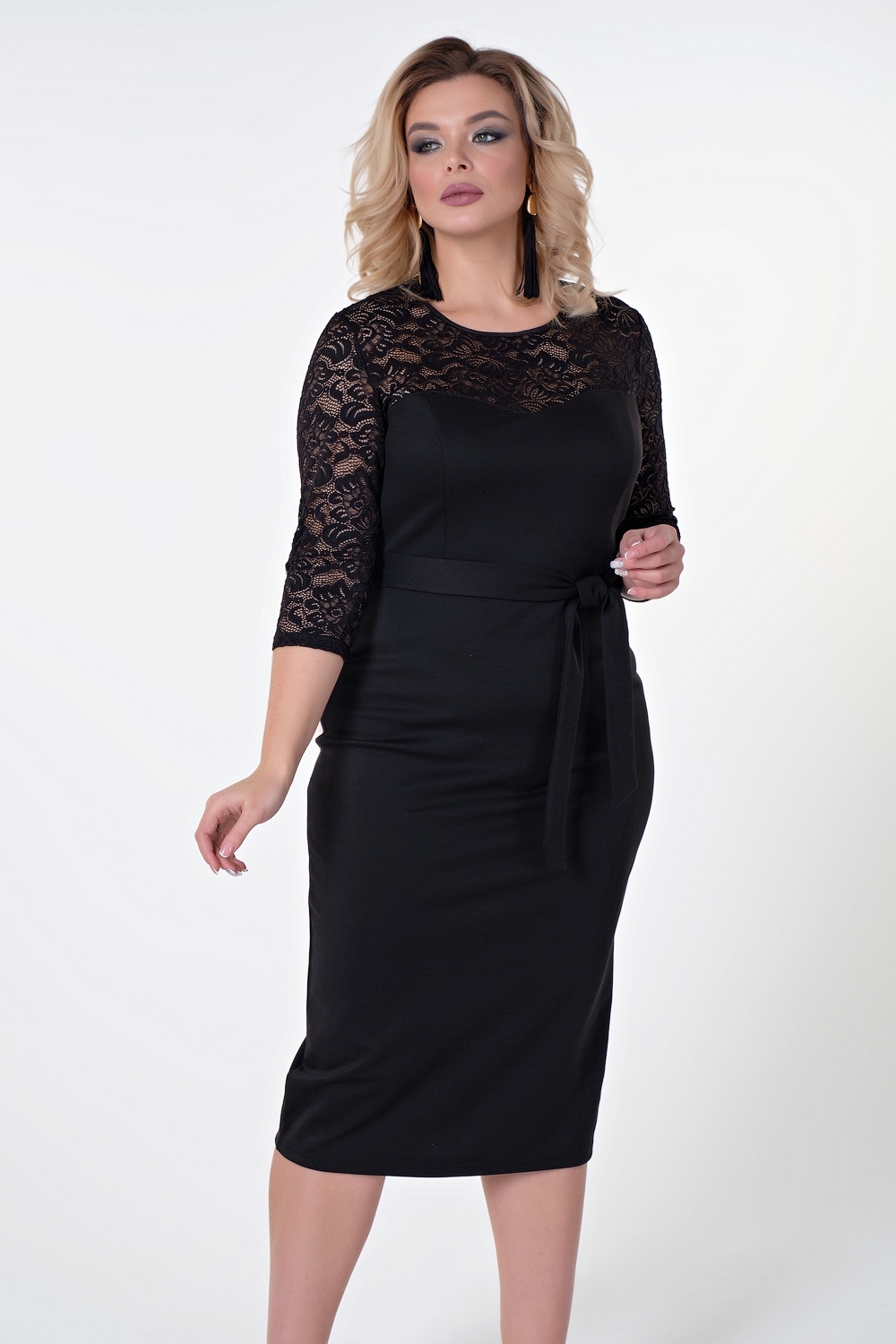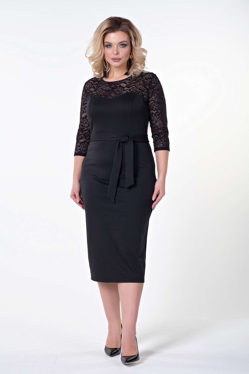 Эффектное платье прилегающего силуэта из трикотажного полотна. Втачные рукава ¾ и кокетка переда и спинки выполнены из гипюра с цветочным узором. Круглая горловина обработана кантом. Модель отрезная по талии, без застежек. Низ ровный, сзади шлица.