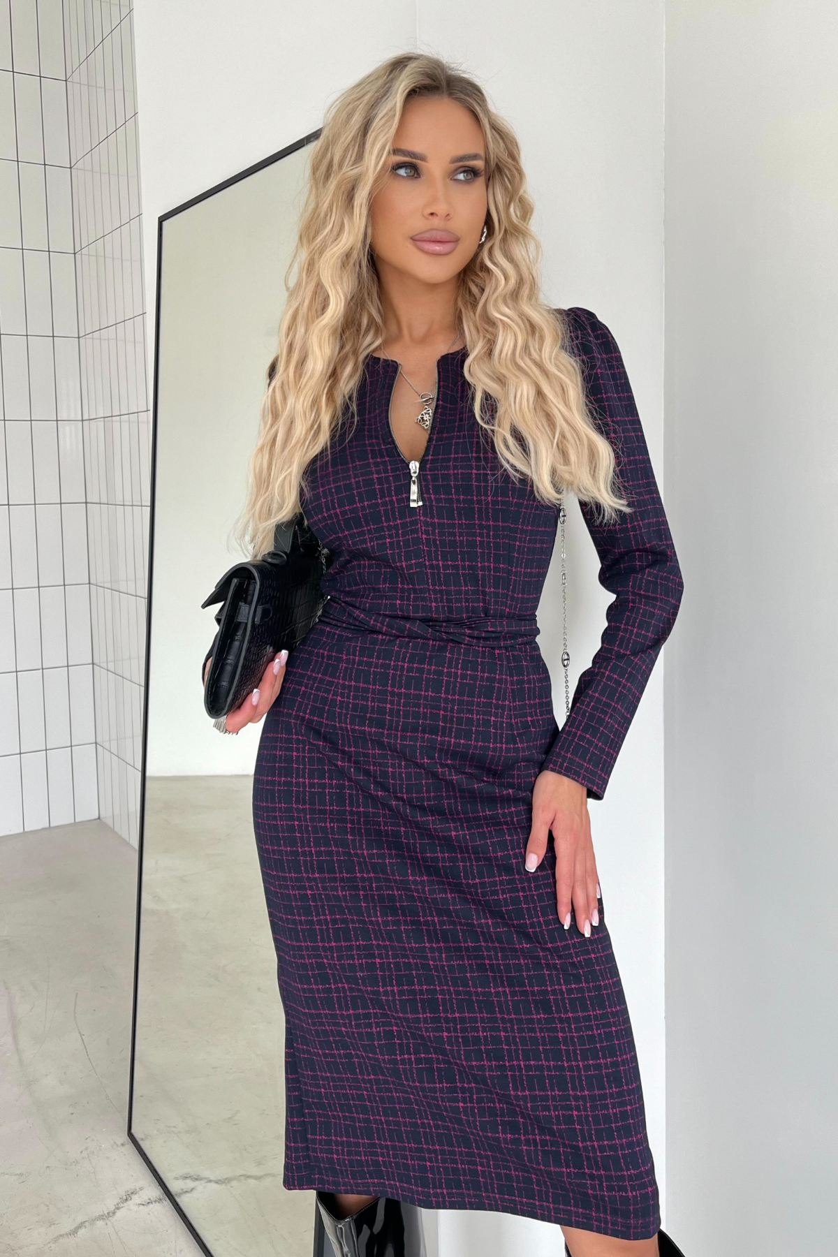 Платье полуприлегающего силуэта из трикотажного полотна. Округлая горловина на внутренней обтачке, по переду расположена застежка на молнию. Длинный втачной рукав. Низ ровный, сзади разрез. Пояс из основного материала в комплекте.