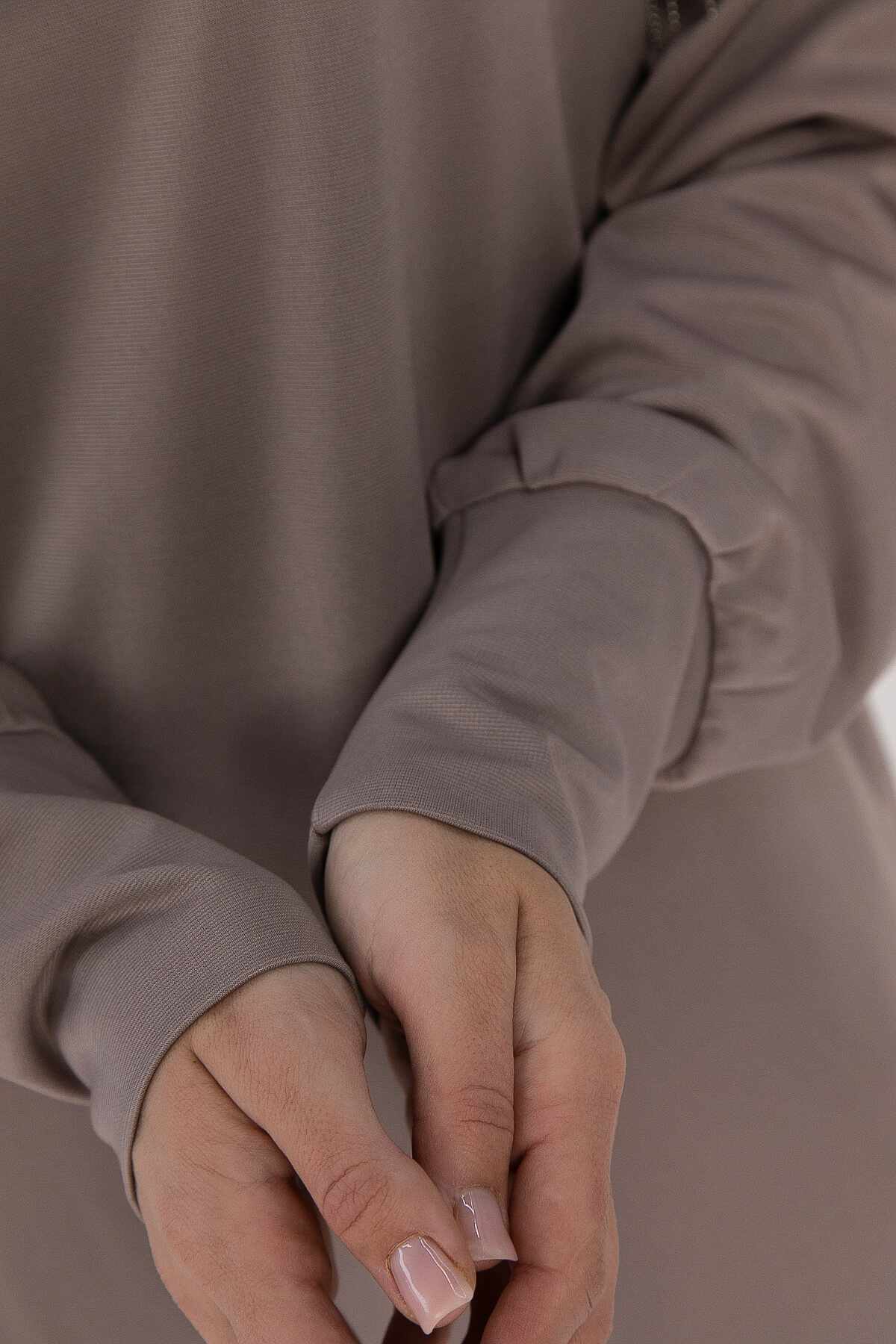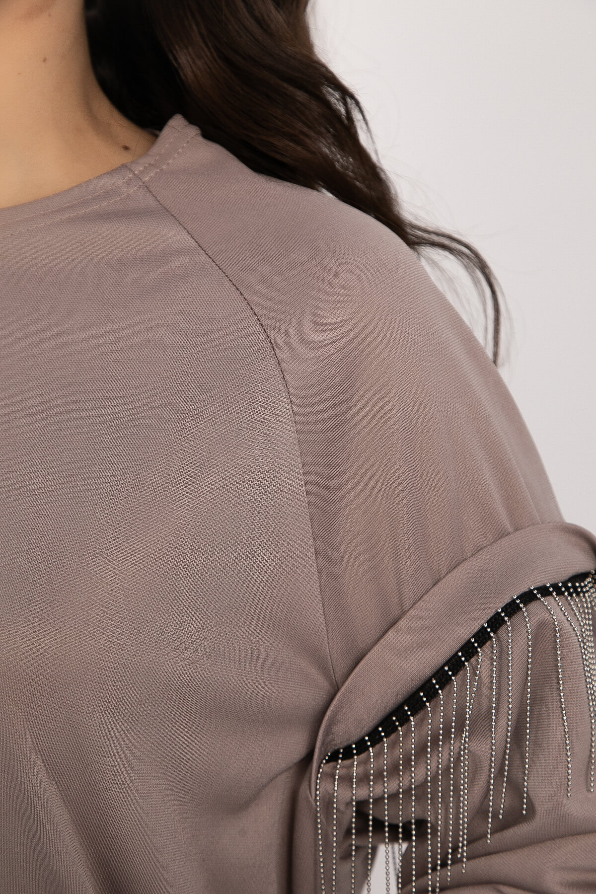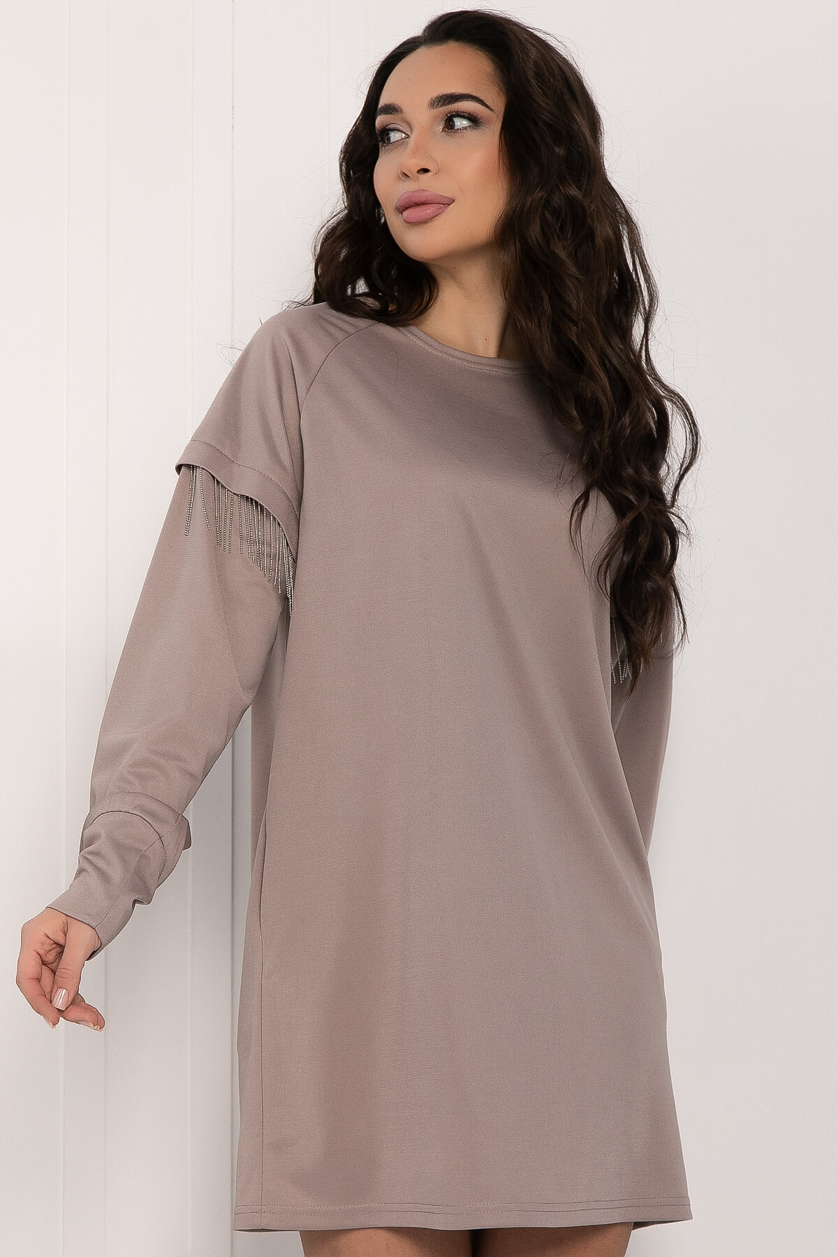 Трикотажное платье свободного кроя в красивом пыльно розовом оттенке — это отличный выбор для создания стильного и комфортного образа! Его отличительной чертой является эффектная металлическая бахрома, которая придаёт ему оригинальности. Модель оснащена удобными боковыми карманами. Элегантные рукава с высокой манжетой не только добавляют образу изысканности, но и защищают от холода.