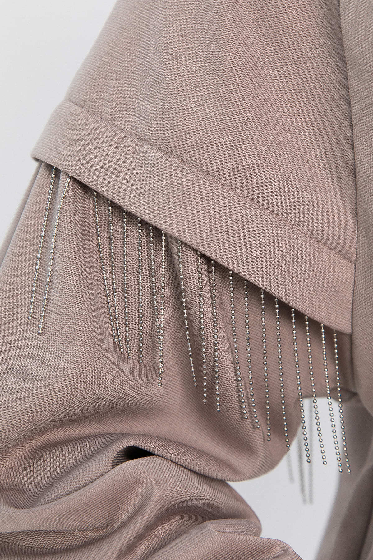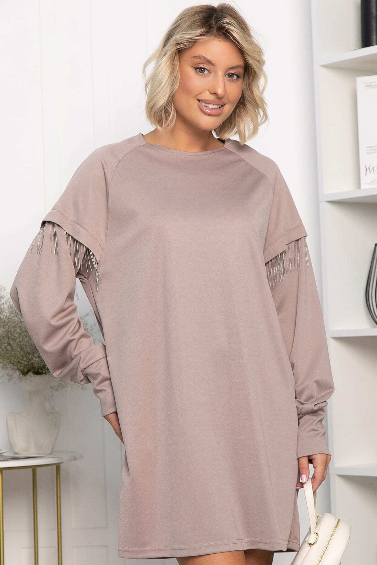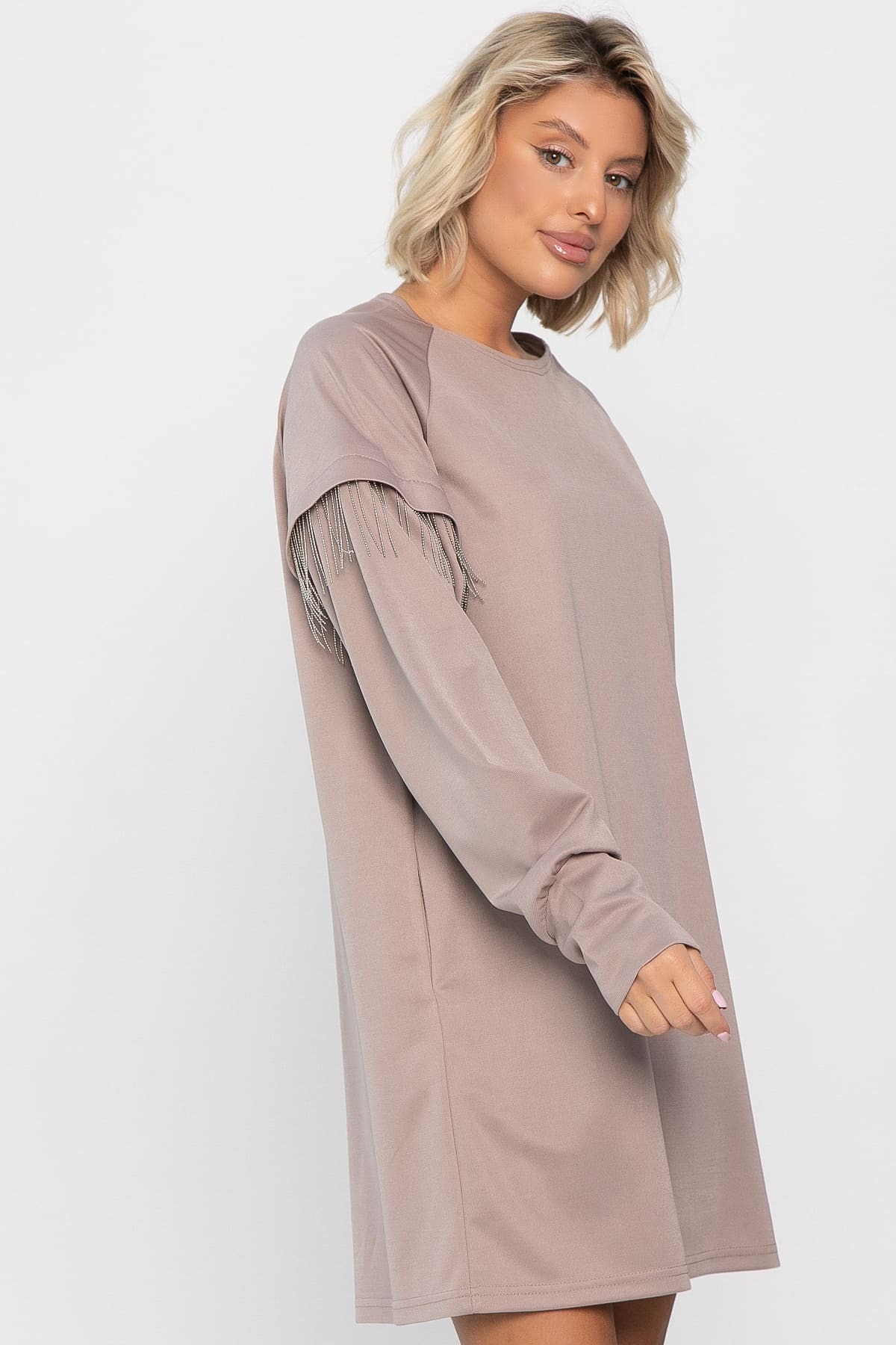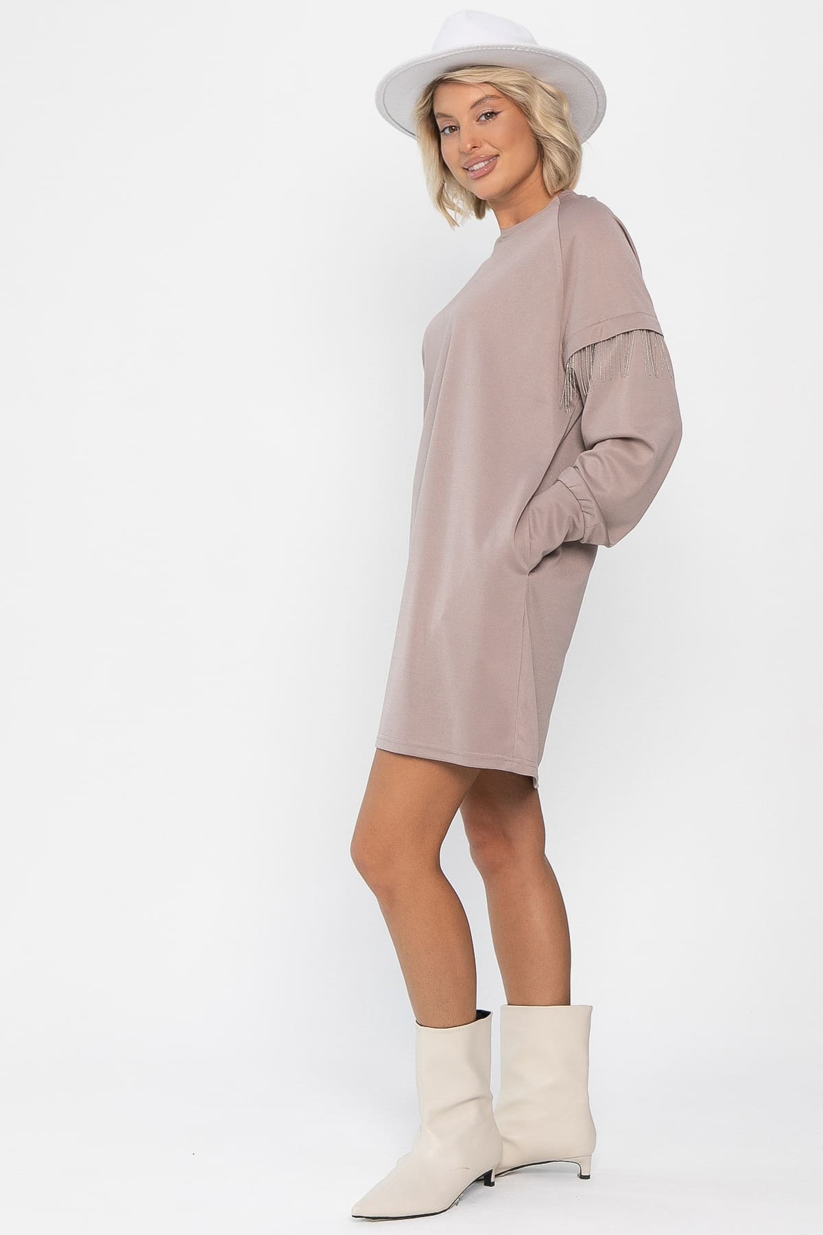 Трикотажное платье свободного кроя — это отличный выбор для создания стильного и комфортного образа! Его отличительной чертой является эффектная металлическая бахрома, которая придаёт ему оригинальности. Модель оснащена удобными боковыми карманами. Элегантные рукава с высокой манжетой не только добавляют образу изысканности, но и защищают от холода.