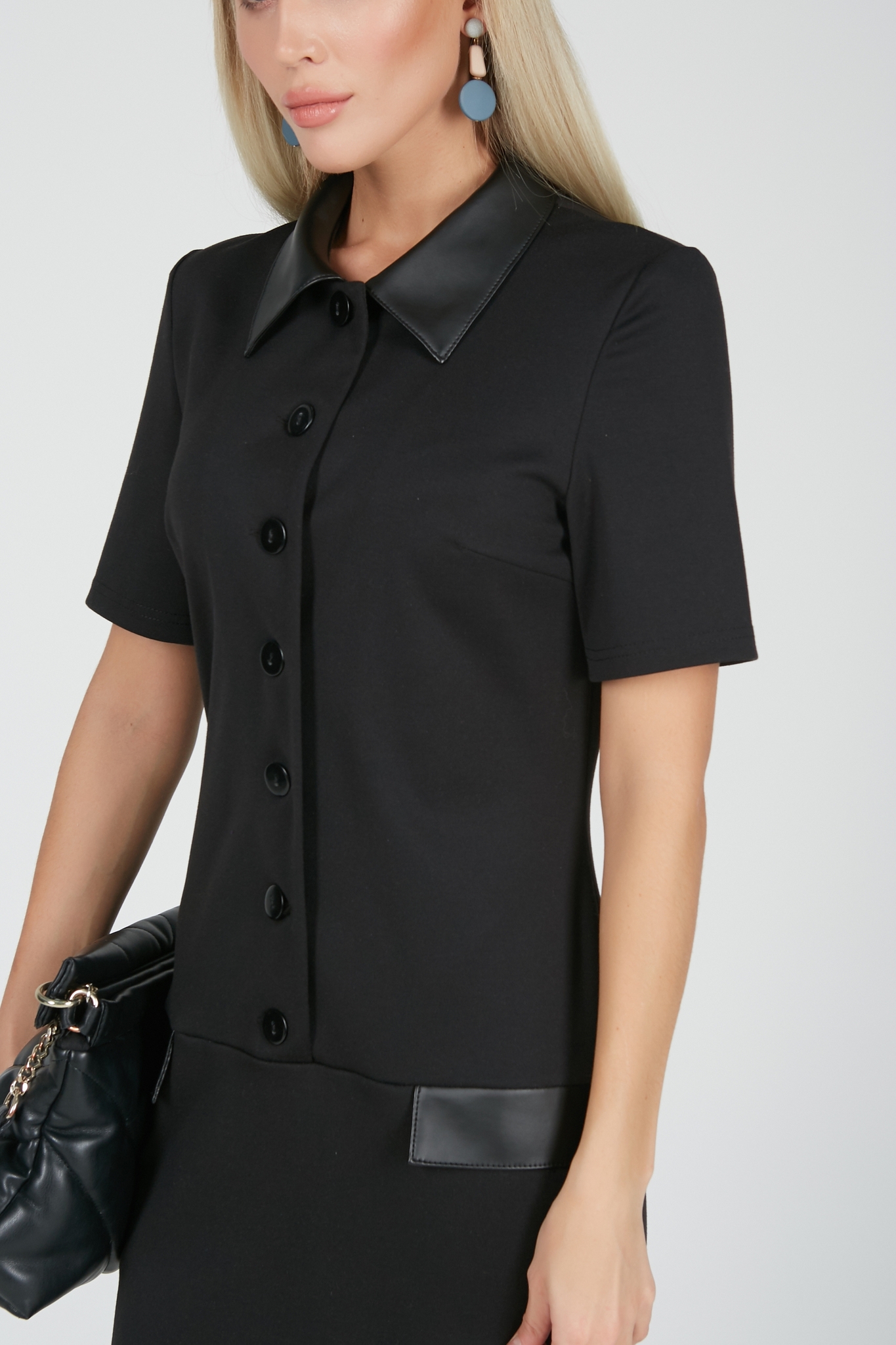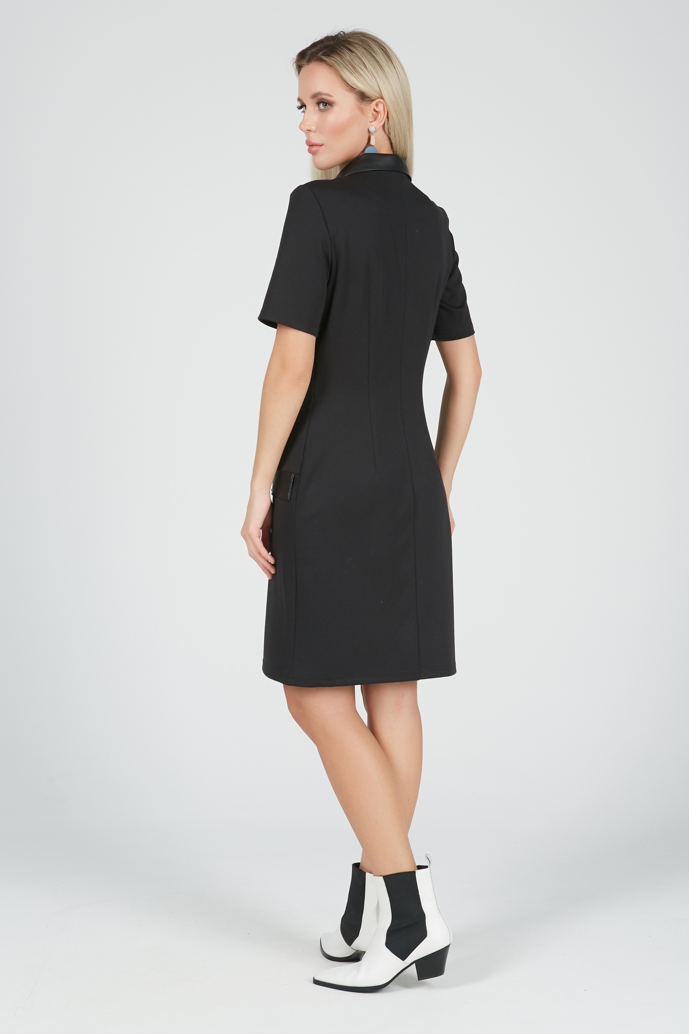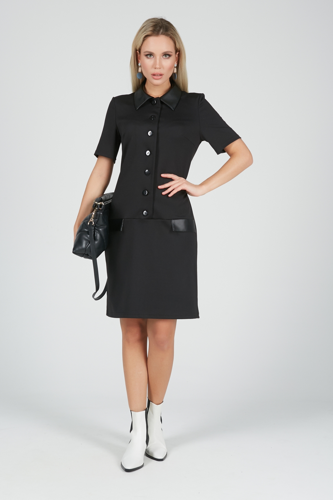 Стильное платье полуприлегающего силуэта из трикотажного полотна с элементами из эко - кожи. Короткий втачной рукав. Горловина оформлена воротником. По переду выполнена планка с застежками на петли пуговицы. Перед дополнен клапанами. Низ ровный, без разрезов. Универсальный вариант для работы и отдыха.