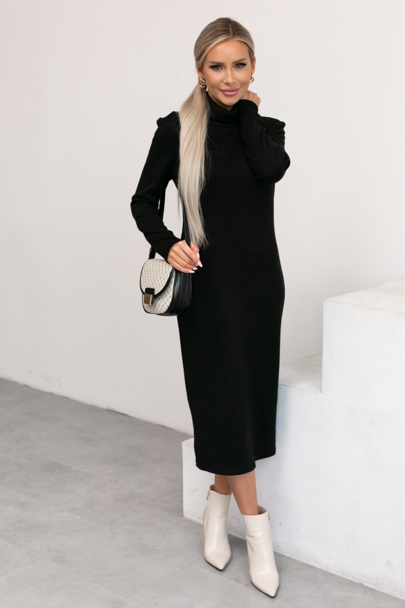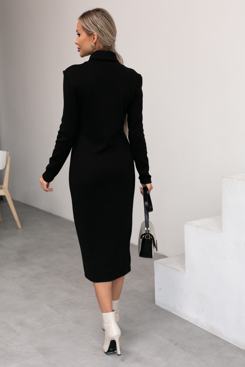 Комфортное платье прилегающего силуэта из трикотажного полотна. Длинные втачные рукава. Горловина оформлена воротником - хомут. Низ ровный, без разрезов. Модель без застежек. Практичное платье станет отличным дополнением к повседневному гардеробу.