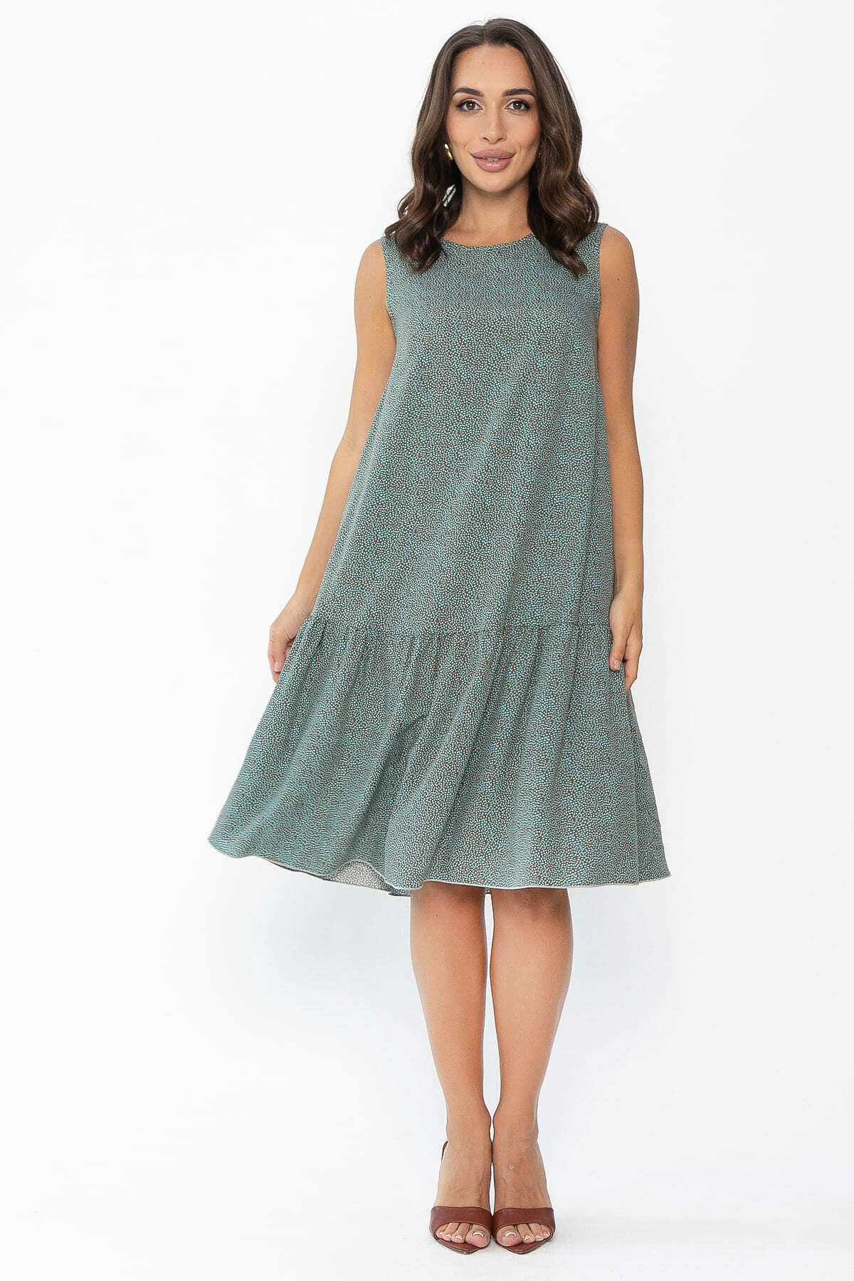 Идеальное сочетание легкости, комфорта и элегантности. У платья коричневый фон и бирюзовый мелкий принт. Данное платье станет отличным вариантом для отдыха на море, пляже, а также подойдет для повседневных образов. В комплект входит пояс из основной ткани, который подчеркнёт все достоинства фигуры.