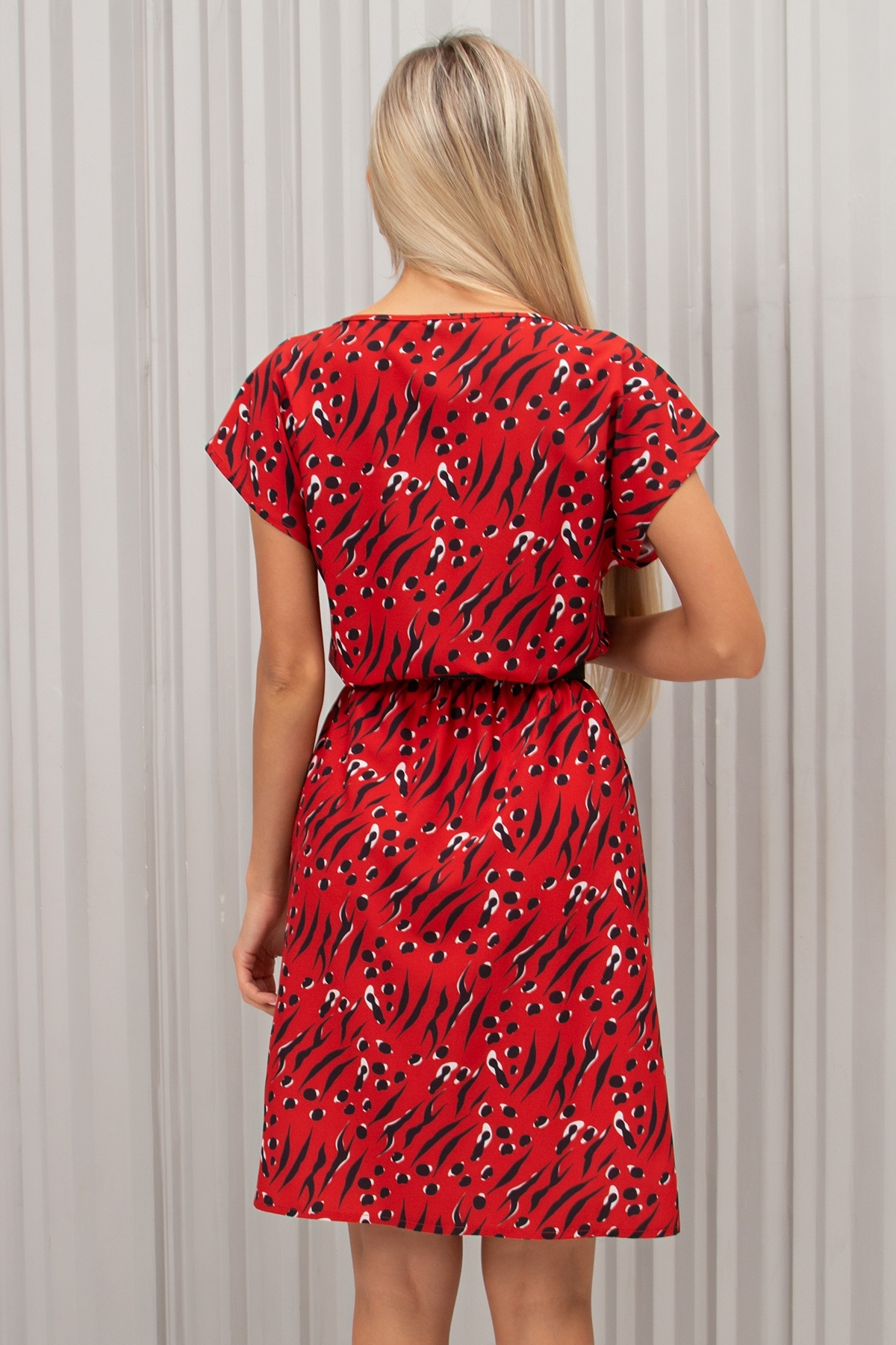 Комфортное платье полуприлегающего силуэта из легкой ткани с оригинальным принтом. Короткие спущенные рукава. Горловина на обтачке оформлена "лодочкой". Модель отрезная по талии, собрана на резинку. Низ ровный, без разрезов.