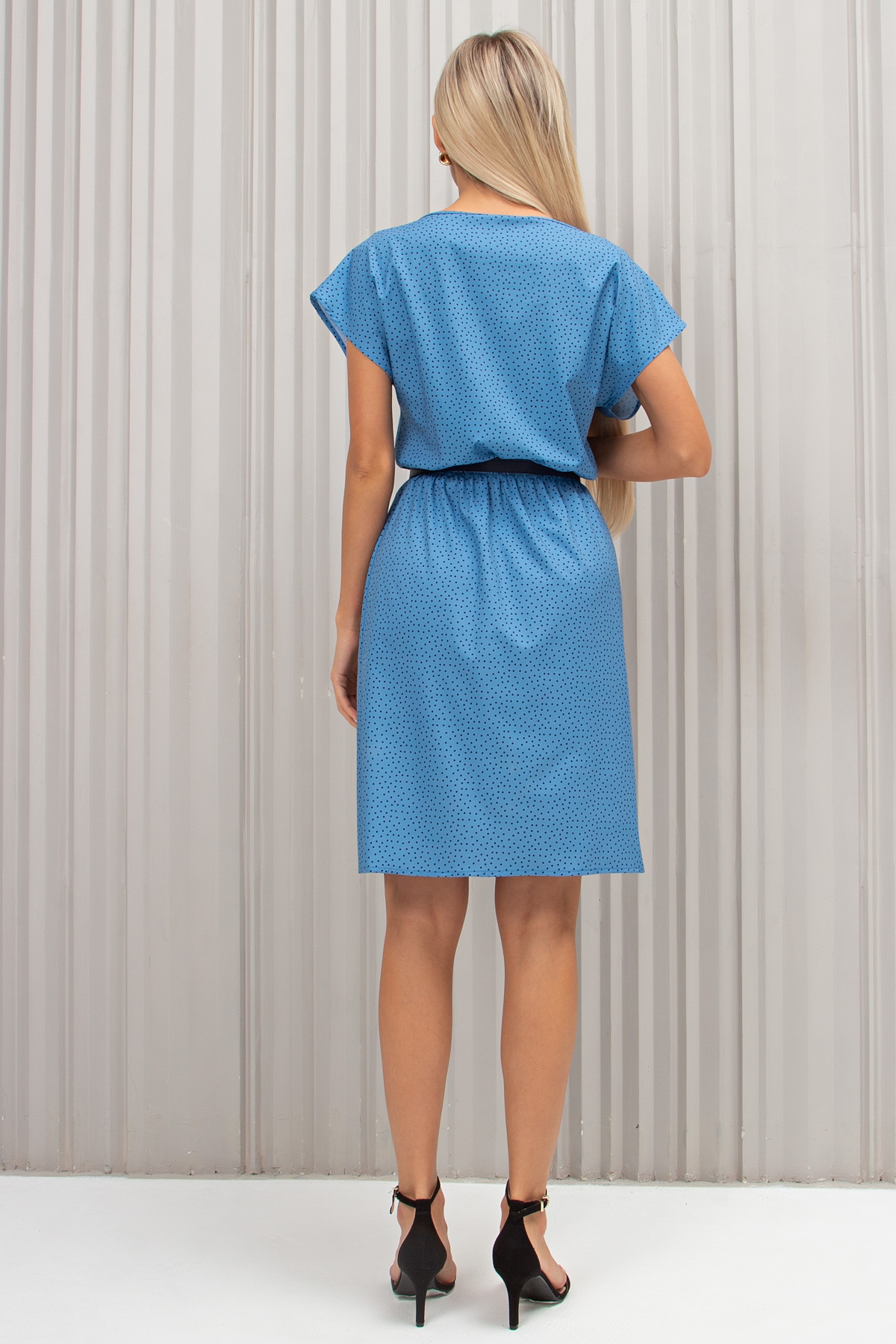 Комфортное платье полуприлегающего силуэта из легкой ткани с оригинальным принтом. Короткие спущенные рукава. Горловина на обтачке оформлена "лодочкой". Модель отрезная по талии, собрана на резинку. Низ ровный, без разрезов.