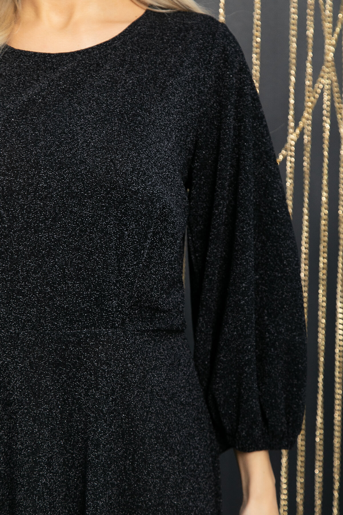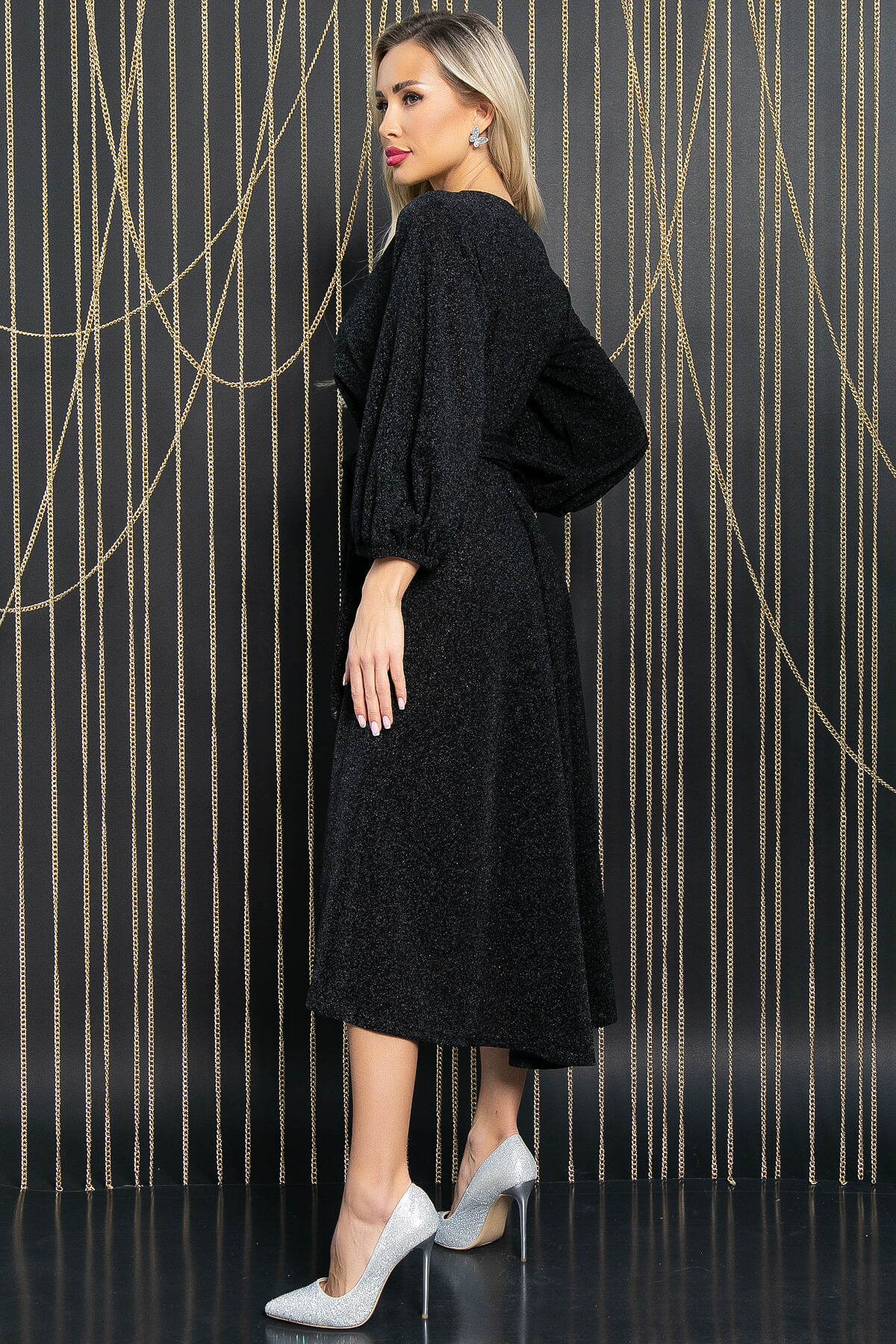 Вечернее платье из трикотажного полотна с люрексом — эффектная модель, которая окажется в центре внимания на любом праздничном мероприятии. Платье в длине макси, отрезное по талии. Втачной пышный рукав три четверти, собранный по низу на резину, — изюминка платья, выглядит кокетливо и нежно. Округлый вырез горловины делает образ женственным и аккуратным. Ассиметричная расклешённая юбка придаёт платью лёгкую игривость. В комплект входит пояс из основной ткани, который позволяет подчеркнуть талию.