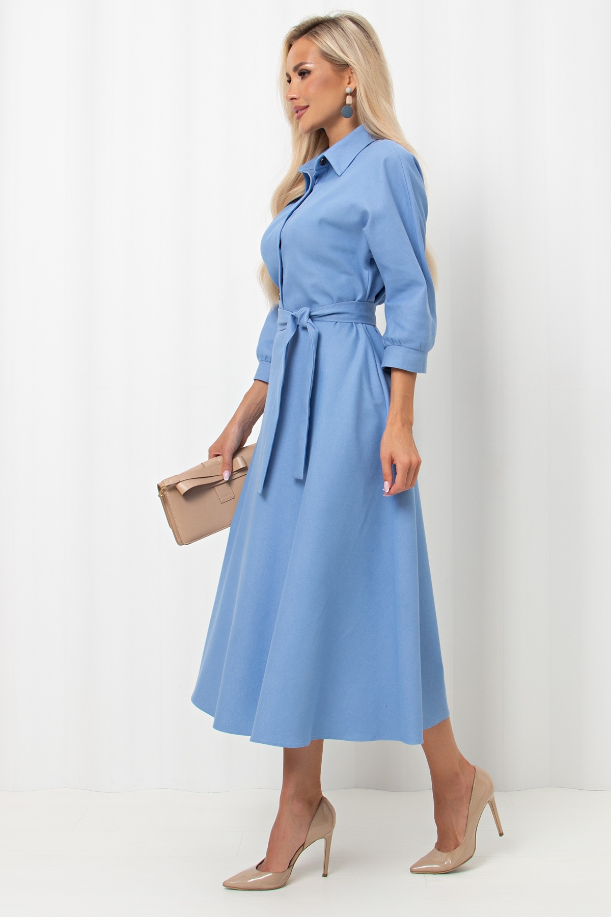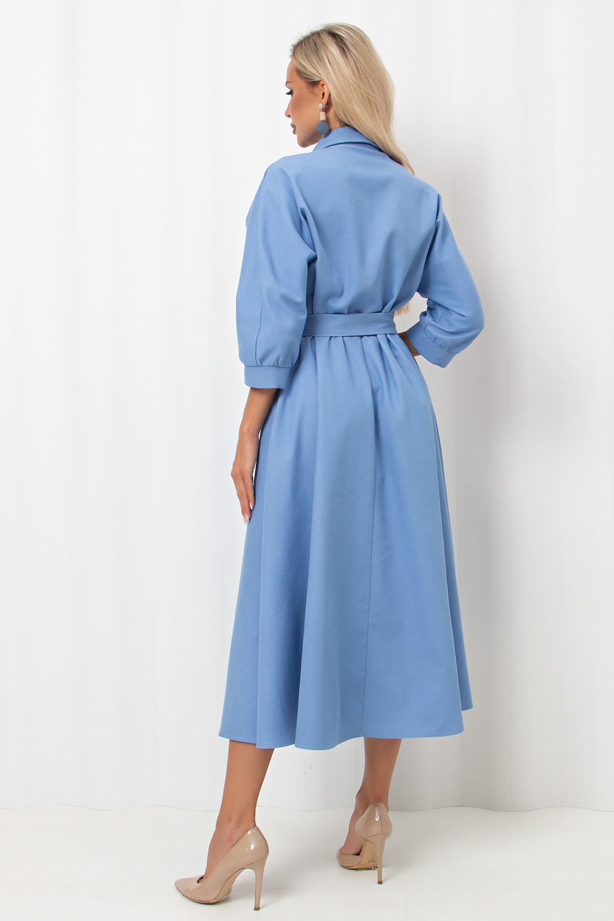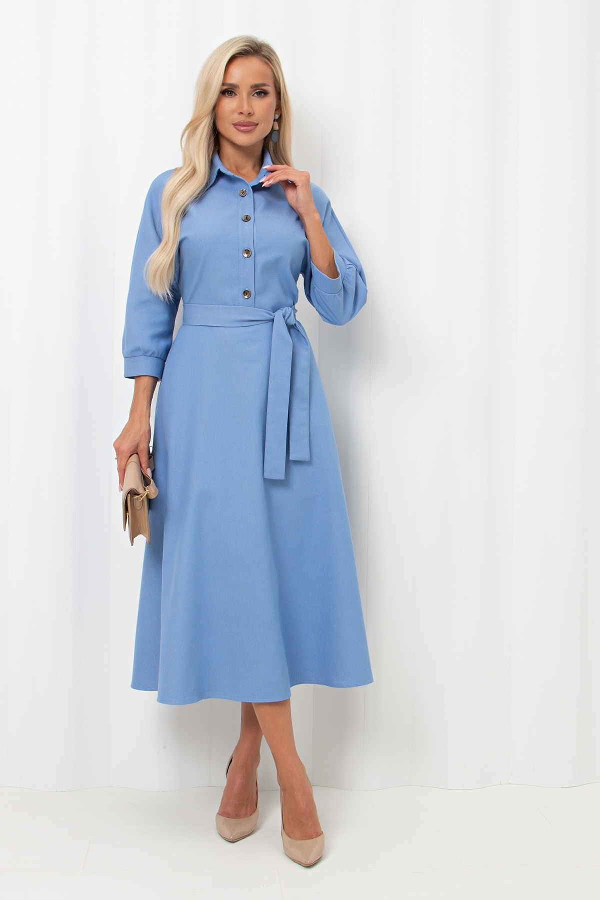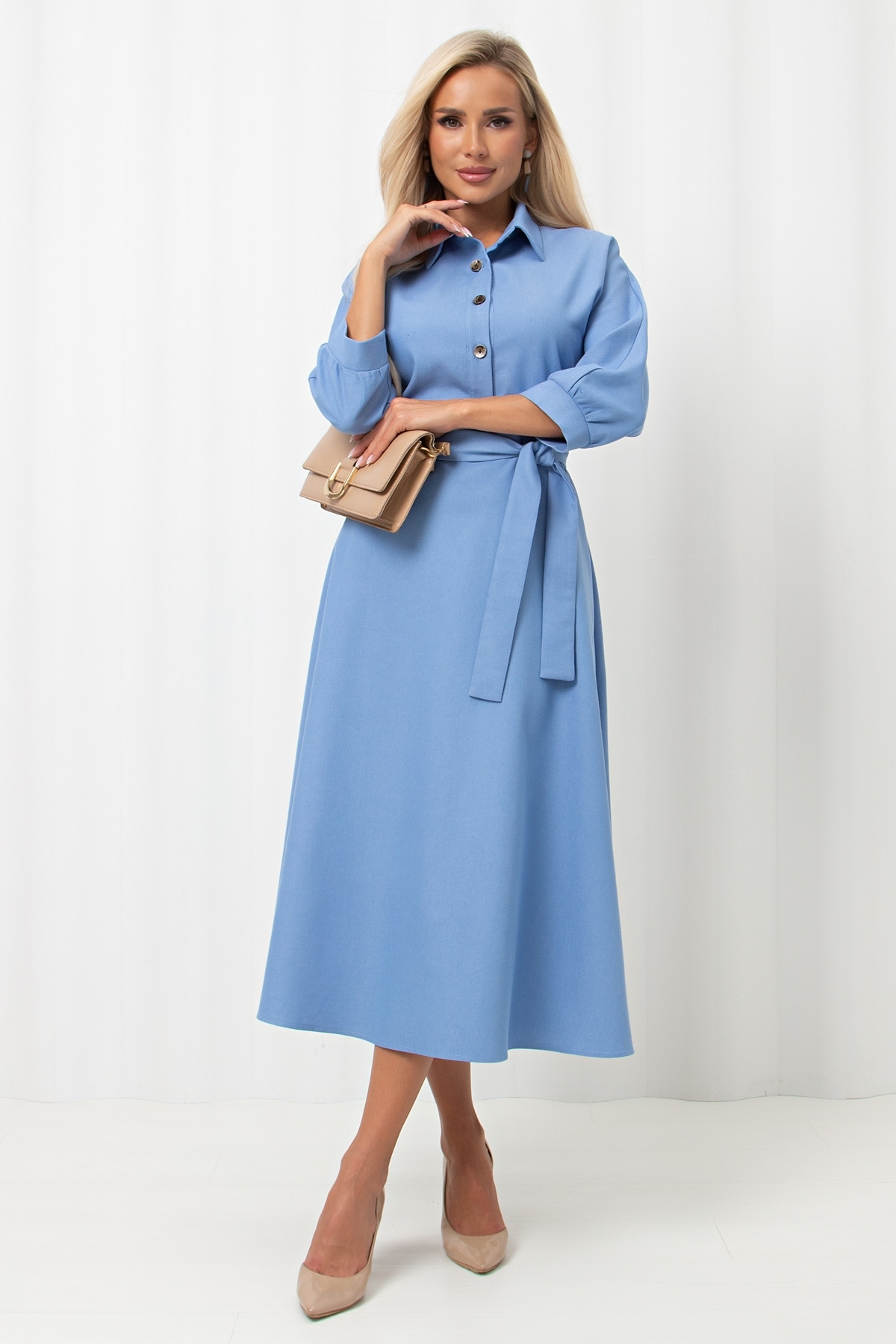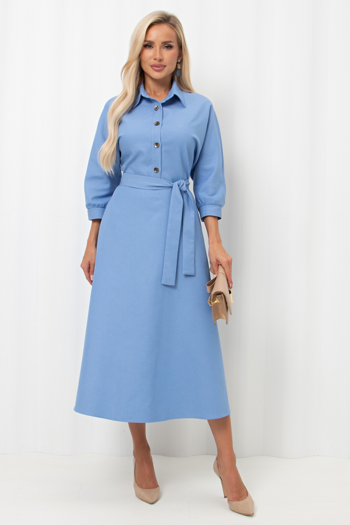 Женственное платье приталенного силуэта. Цельнокроенный рукав длинной 3/4 оканчивается притачной манжетой на сборке. Горловина оформлена отложным воротником на стойке переходящим в планку с застежкой на петли и пуговицы. Модель отрезная по линии талии, присборена на резинку. По бокам функциональные карманы. Низ ровный, без разрезов. Пояс из основного материала входит в комплект.